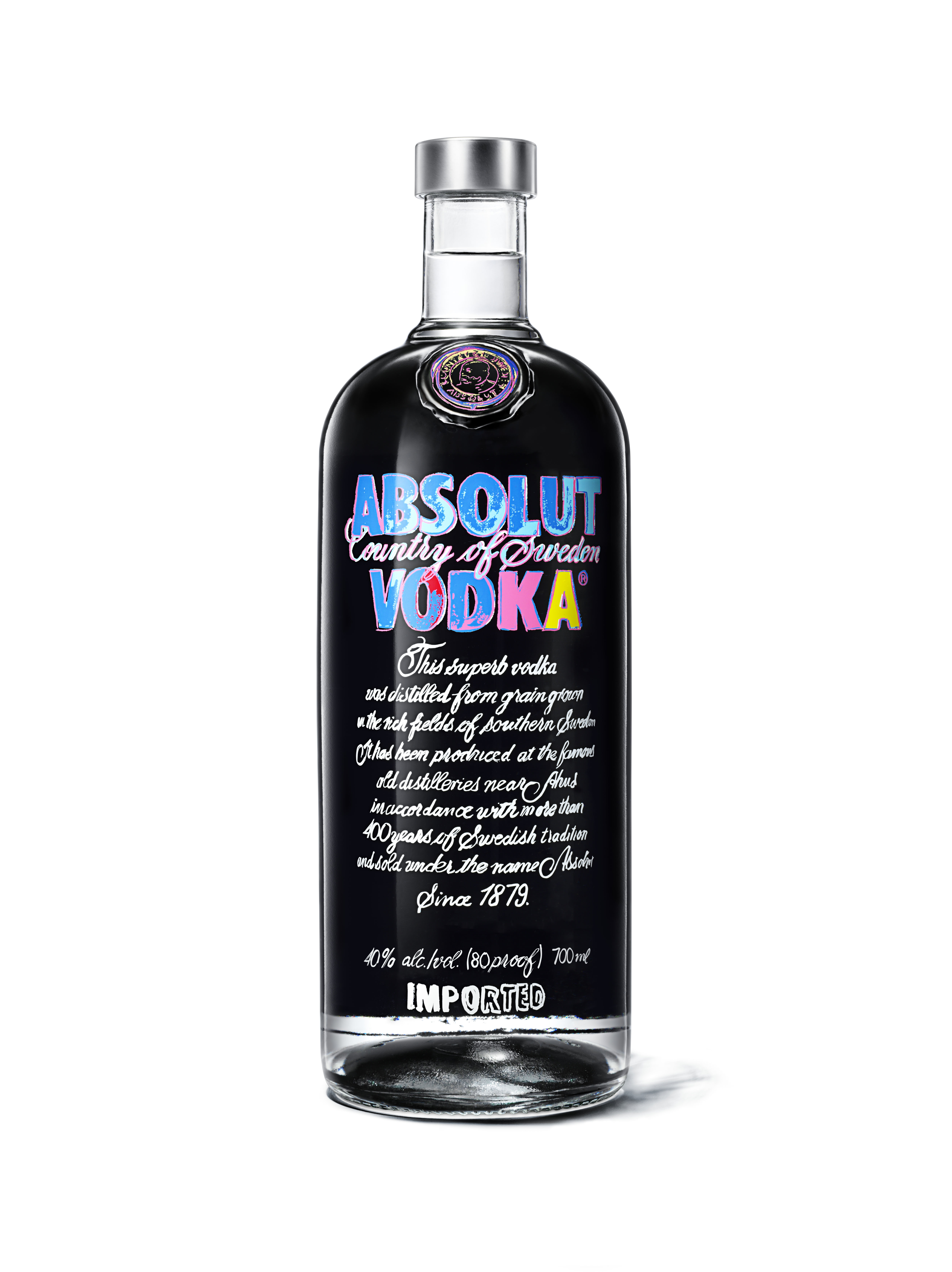 Inspirée par lʼimagination novatrice de lʼartiste, Absolut Vodka a repoussé les limites de la création pour offrir une réalisation en trois dimensions de lʼoeuvre originale dʼAndy Warhol. Véritable trompe lʼoeil, lʼétiquette arrière donne lʼimpression dʼune bouteille noire, que le style graphique de Warhol vient faire vibrer de sa palette de couleurs pop en face avant. Les pleins et les déliés de lʼécriture du maître new-yorkais revisitent au pinceau les origines dʼAbsolut donnant ainsi à son histoire, une teinte originale et artistique.