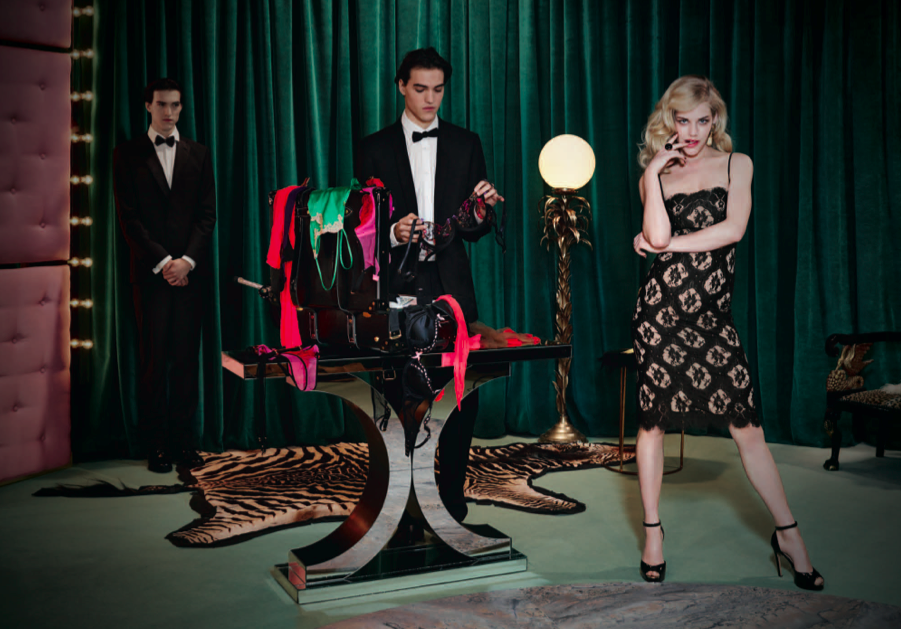 La directrice de la création Sarah Shotton tente ici de capturer l’esprit d’un vice indolent et d’un luxe sans gêne pour cette campagne de publicité Automne-Hiver. Missy Rayder est le visage de cette campagne photo et elle rayonne en tant que star du Salon. La brune canadienne assume son rôle avec brio, se fondant dans un décor opulent de soie, jouant avec son verre de champagne.