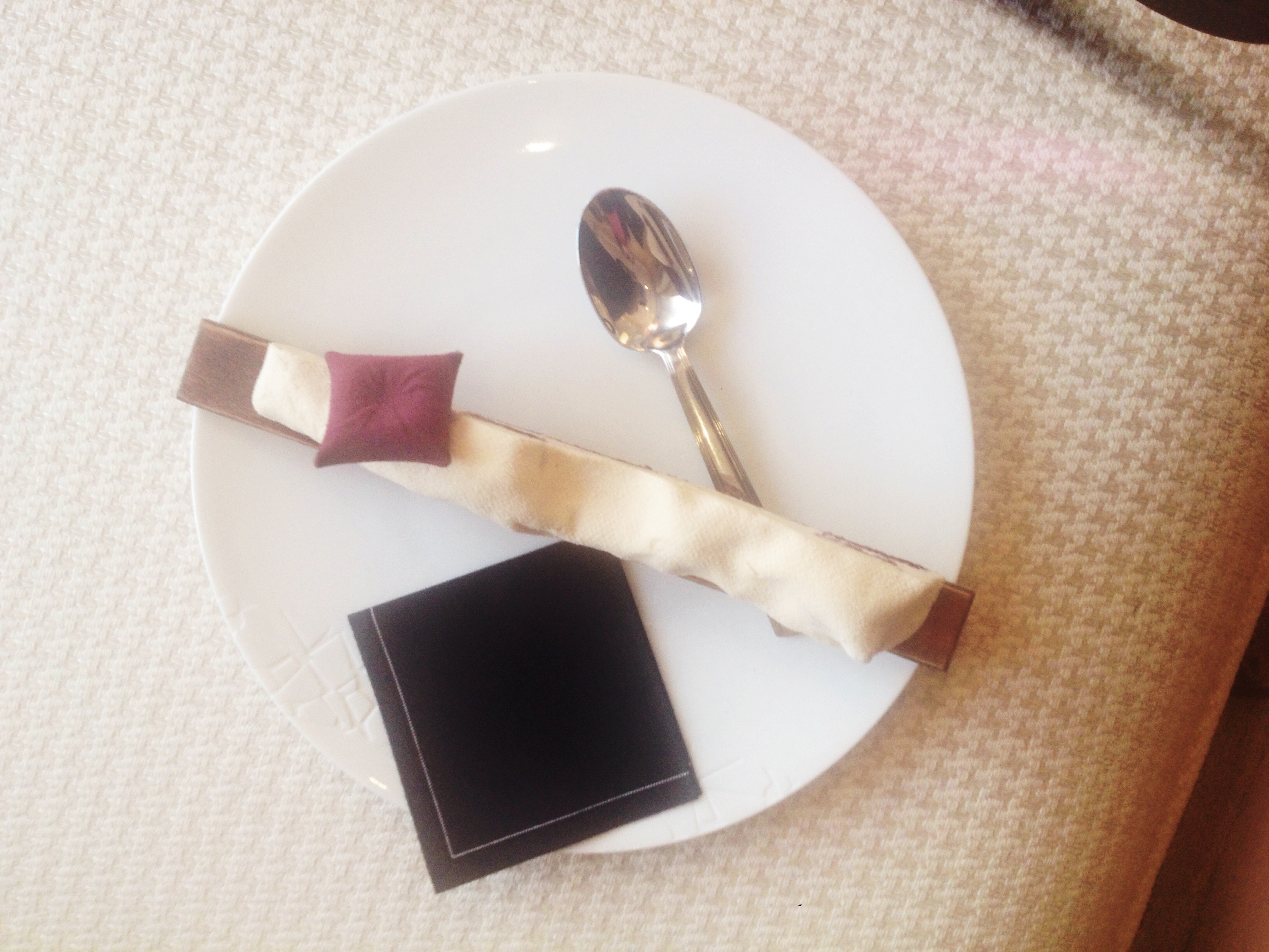 Nous découvrons un biscuit pancake imbibé dans du sirop d’érable accompagné d’une marmelade de cassis, le tout recouvert par une mousse également aromatisée au sirop d’érable ainsi que d’une nougatine au noix de pécan. Les coussins sont eux, réalisés avec du chocolat blanc.