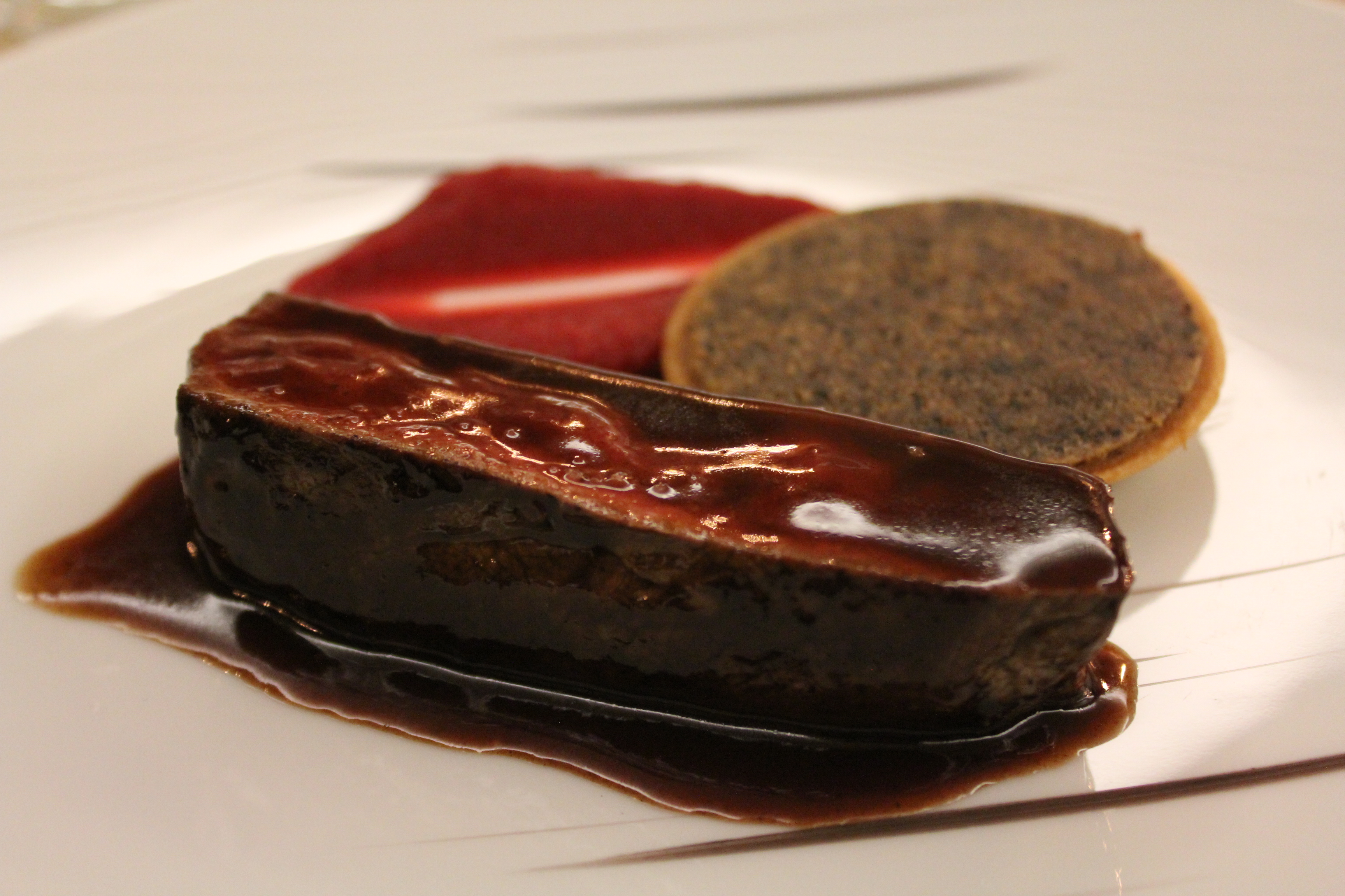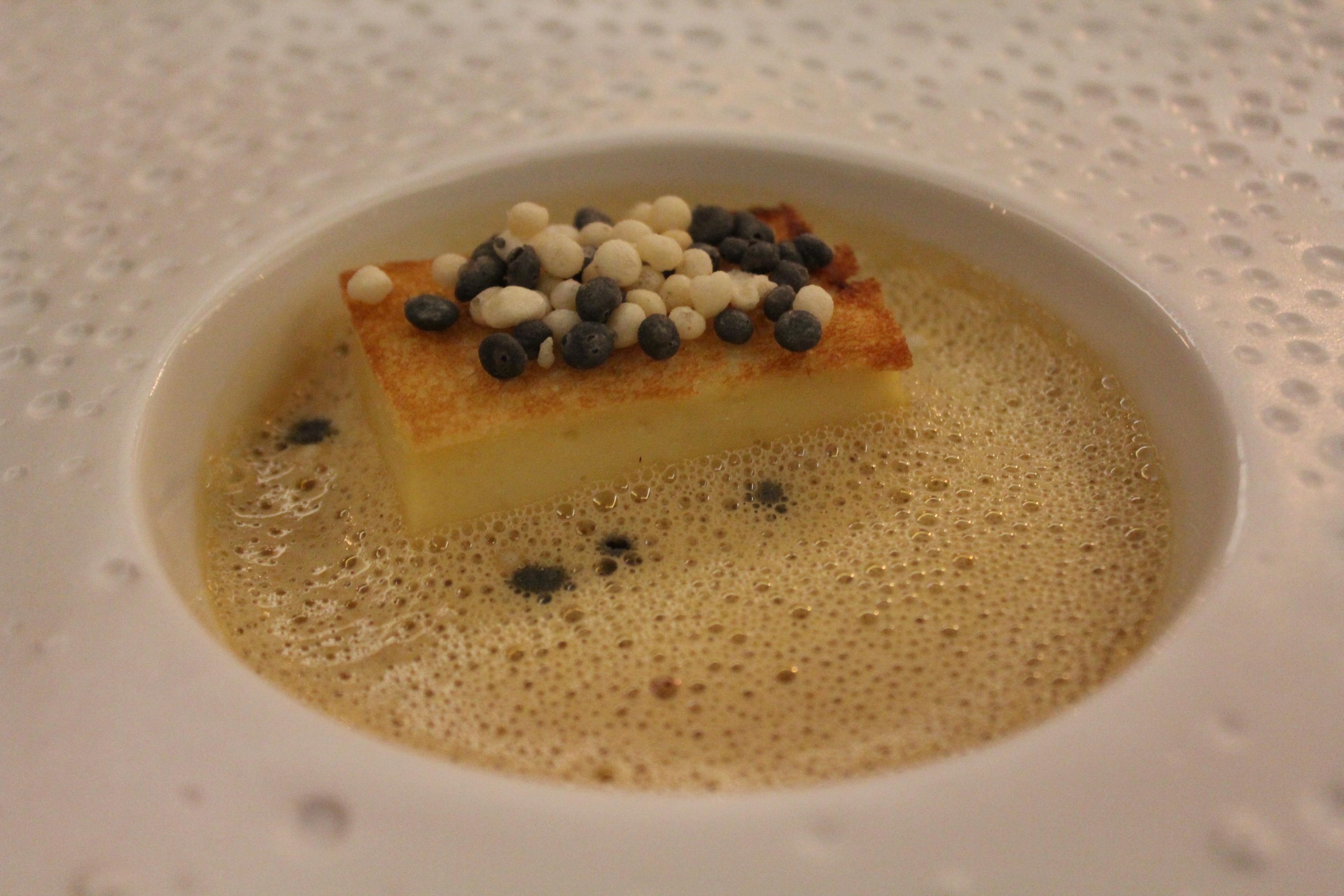 «Biscuit de lotte du lac et brochet, bouillon beurré d’oignons et bois»