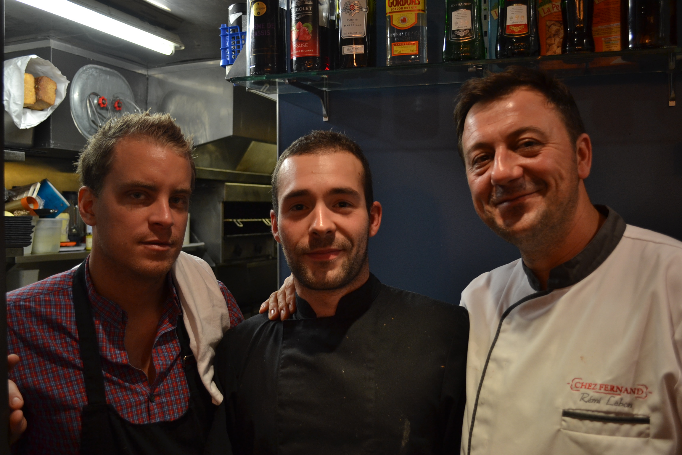 Ce midi là, une partie de l’équipe ( dans le desordre ) : Arthur Potonniée, le directeur, Jérôme Moinard, le chef et Rémi Lebon, chef exécutif / Copyright Julien Tissot