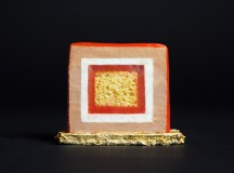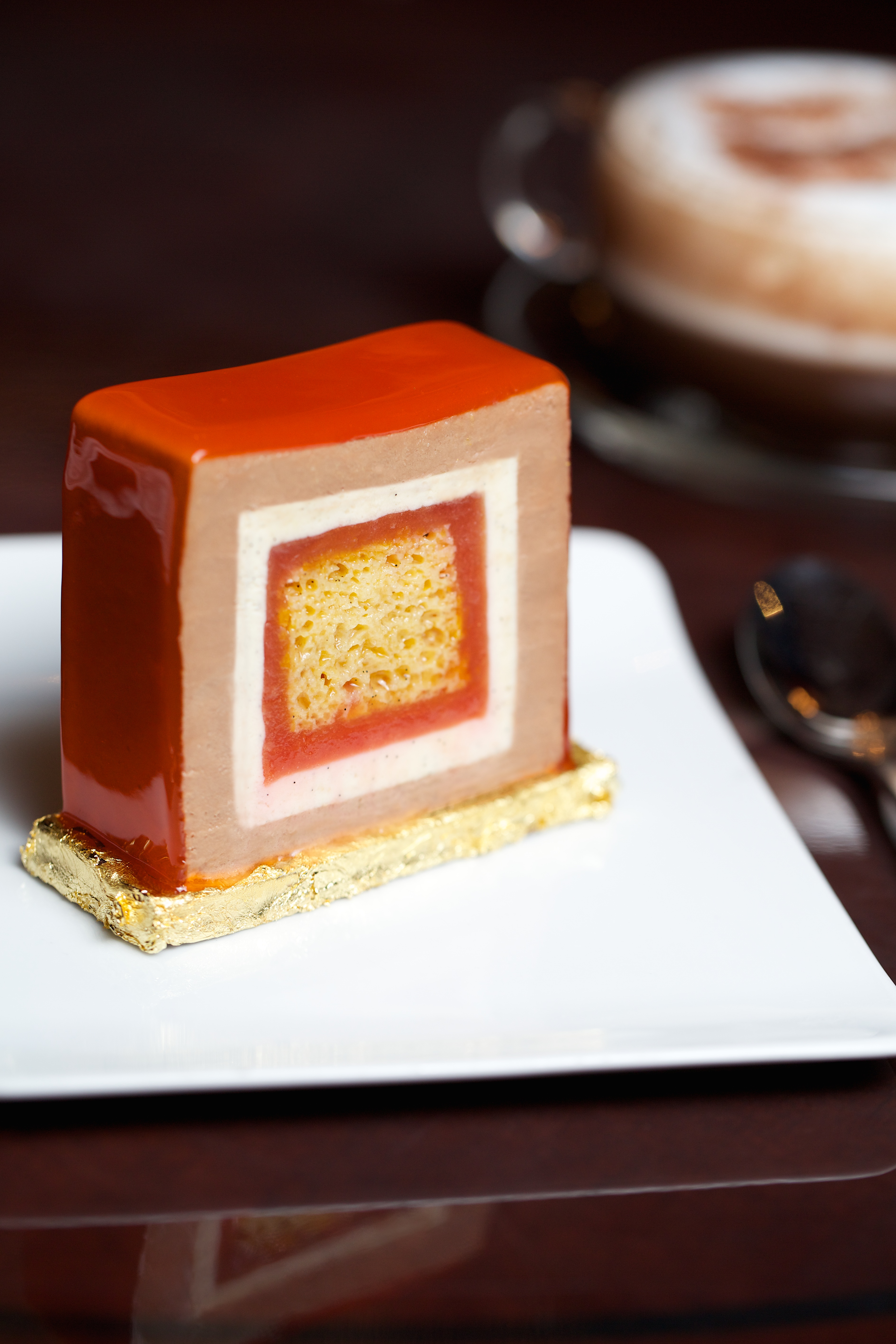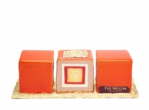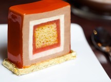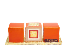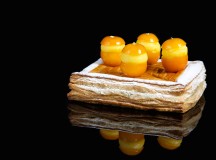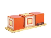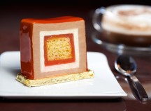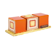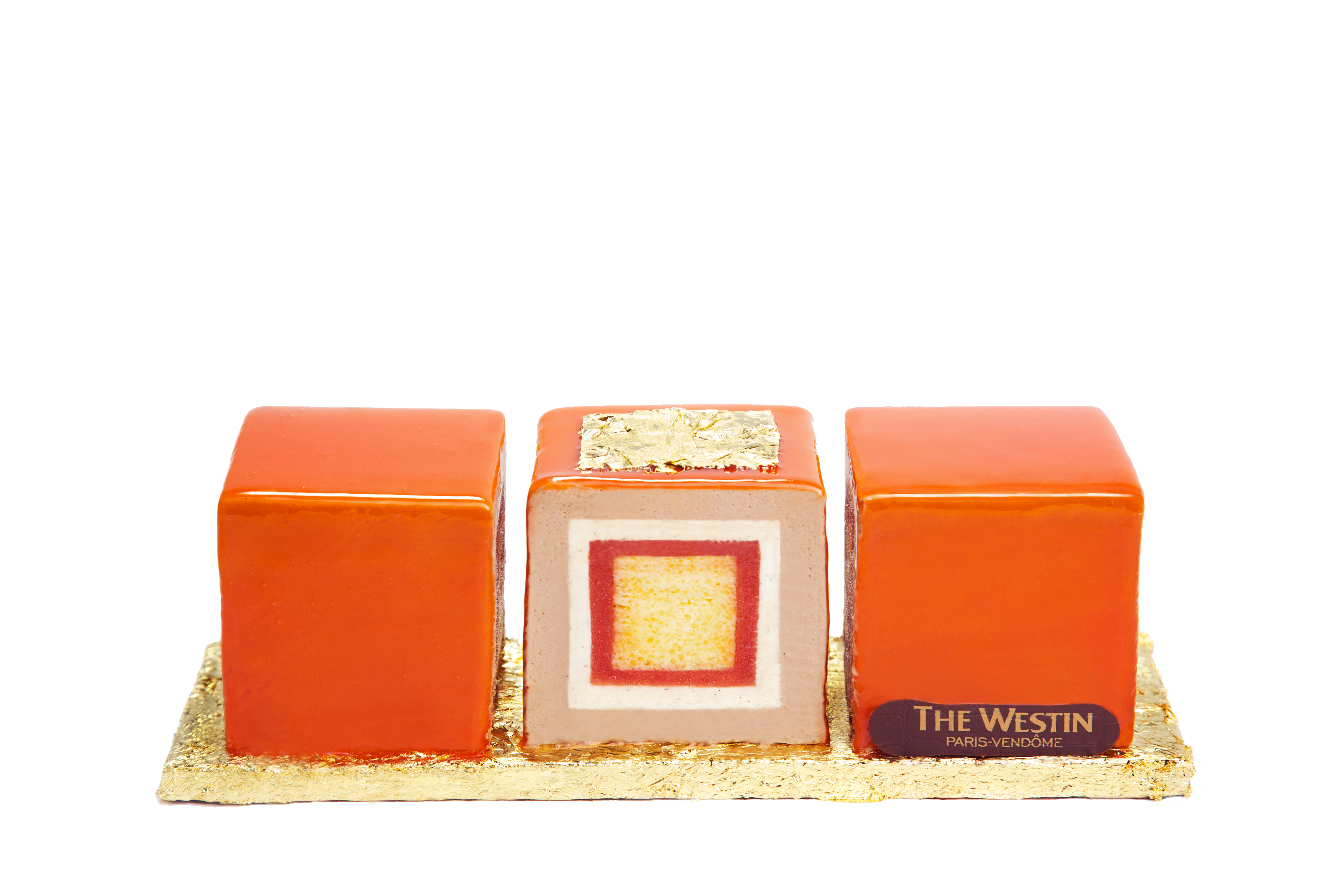 La bûche allie les saveurs de fruits de saisons à des ingrédients plus exotiques en une structure cubique originale. « Carrément bûche » est inspirée par le design de l’hôtel où les formes géométriques sont récurrentes et par la volonté de travailler des saveurs et couleurs de saison. On obtient alors un gâteau gigogne léger et innovant : le glaçage au fruit de la passion et à l’orange enrobe une couche de crémeux chocolat lacté bahibé, recouvrant elle-même une bavaroise aux deux vailles Bourbon et Tahiti qui renferme un couche de gelée d’orange sanguine pour finir par un coeur entre et aéré en baba parfumé aux épices, fruit de la passion zestes d’orange et touche poivrée. C’est donc une véritable explosion de saveurs quand la vanille rencontre le chocolat et les agrumes pour notre plus grand plaisir.