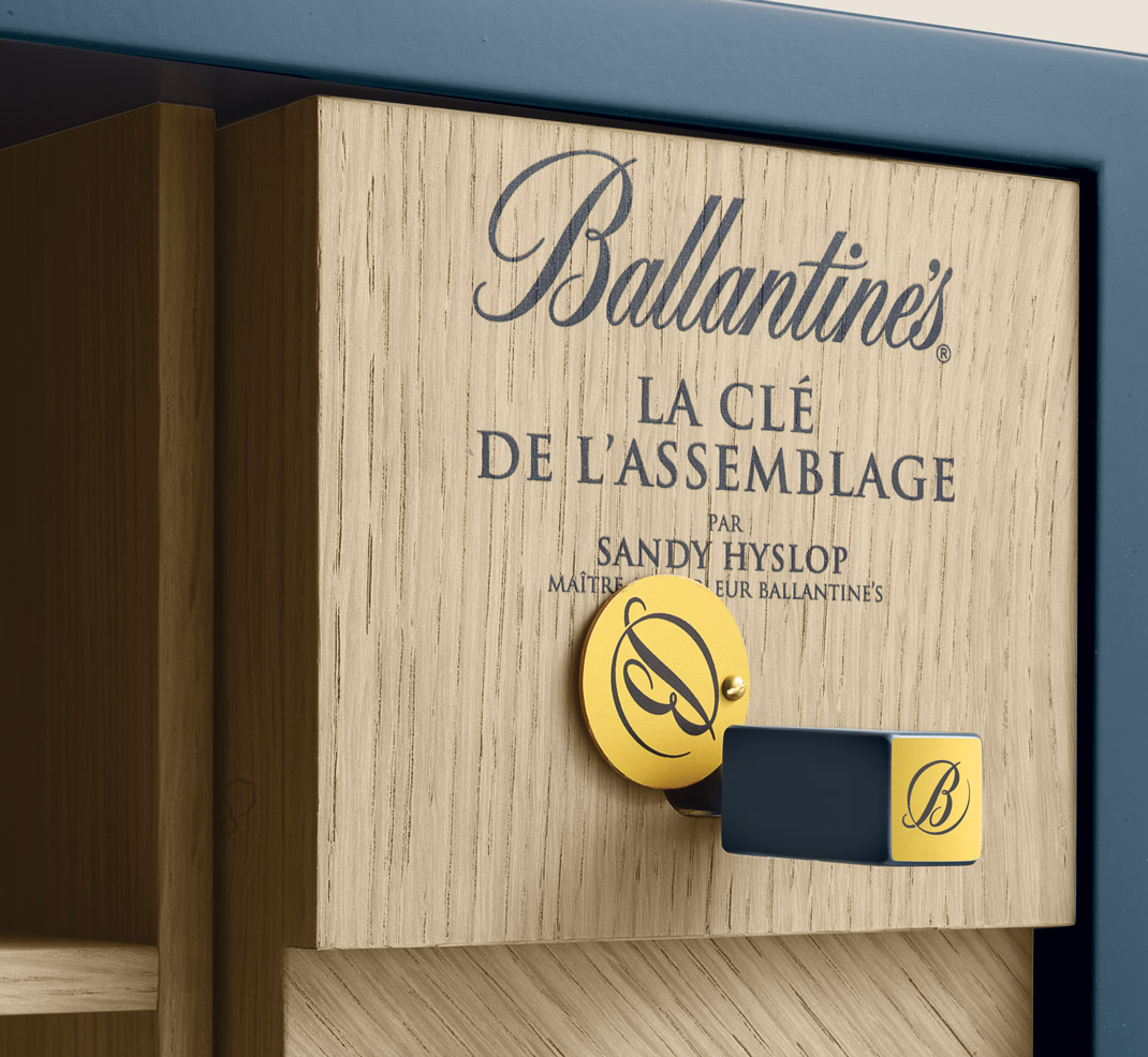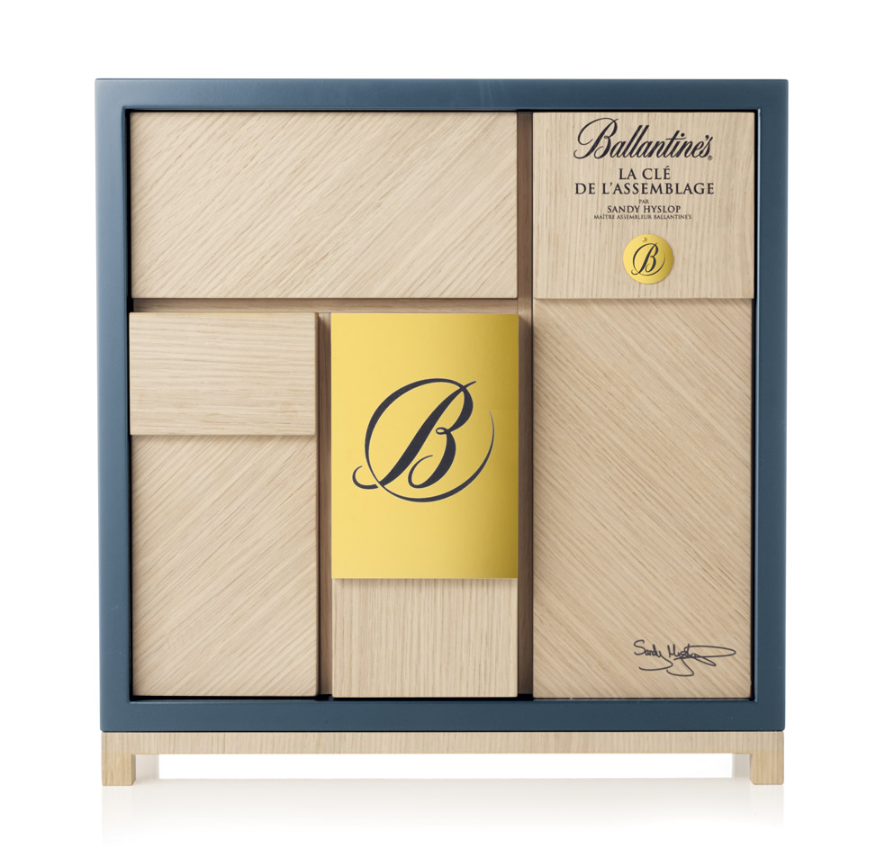 « La clé de l’assemblage » met en valeur l’équilibre si particulier du Ballantine’s 17 ans à travers trois éditions limitées, des signatures, que l’on retrouve chacun dans un rangement s’emboîtant avec le reste du coffret.