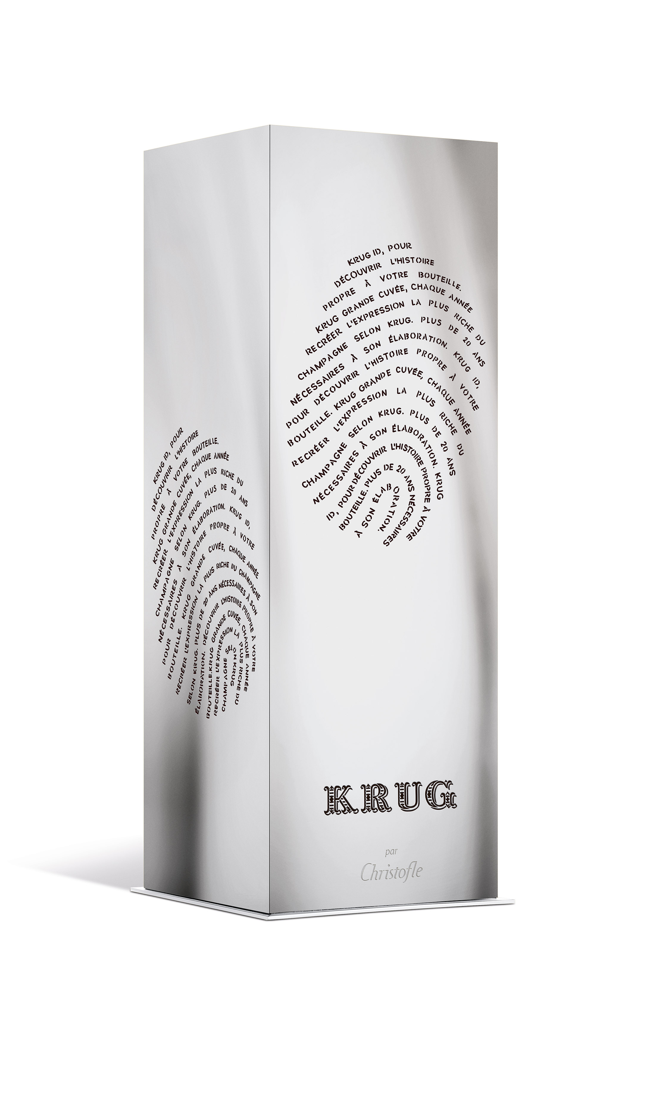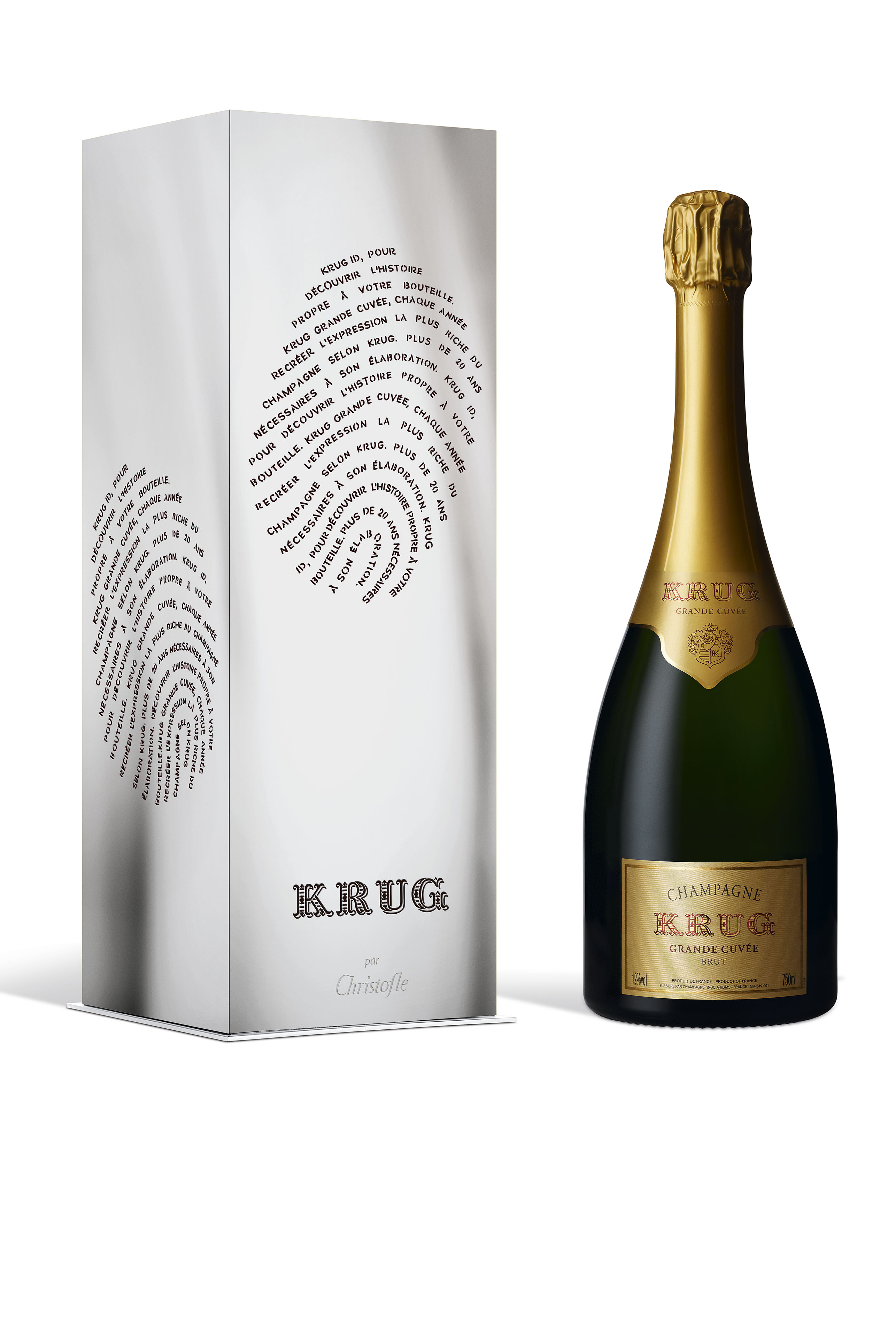 Symbole de l’alliance du luxe et de l’art de la création, l’édition limitée Krug par Christofle est inspirée du Krug ID, une empreinte unique. Vous trouverez le Krug ID sur la contre étiquette de votre flacon. Scannez ces 6 chiffres grâce à la nouvelle application mobile http://app.krug.com ou sur Krug.com, et découvrez l’histoire de votre bouteille et de son élaboration racontée par Eric Lebel, le chef de cave de la Maison Krug.