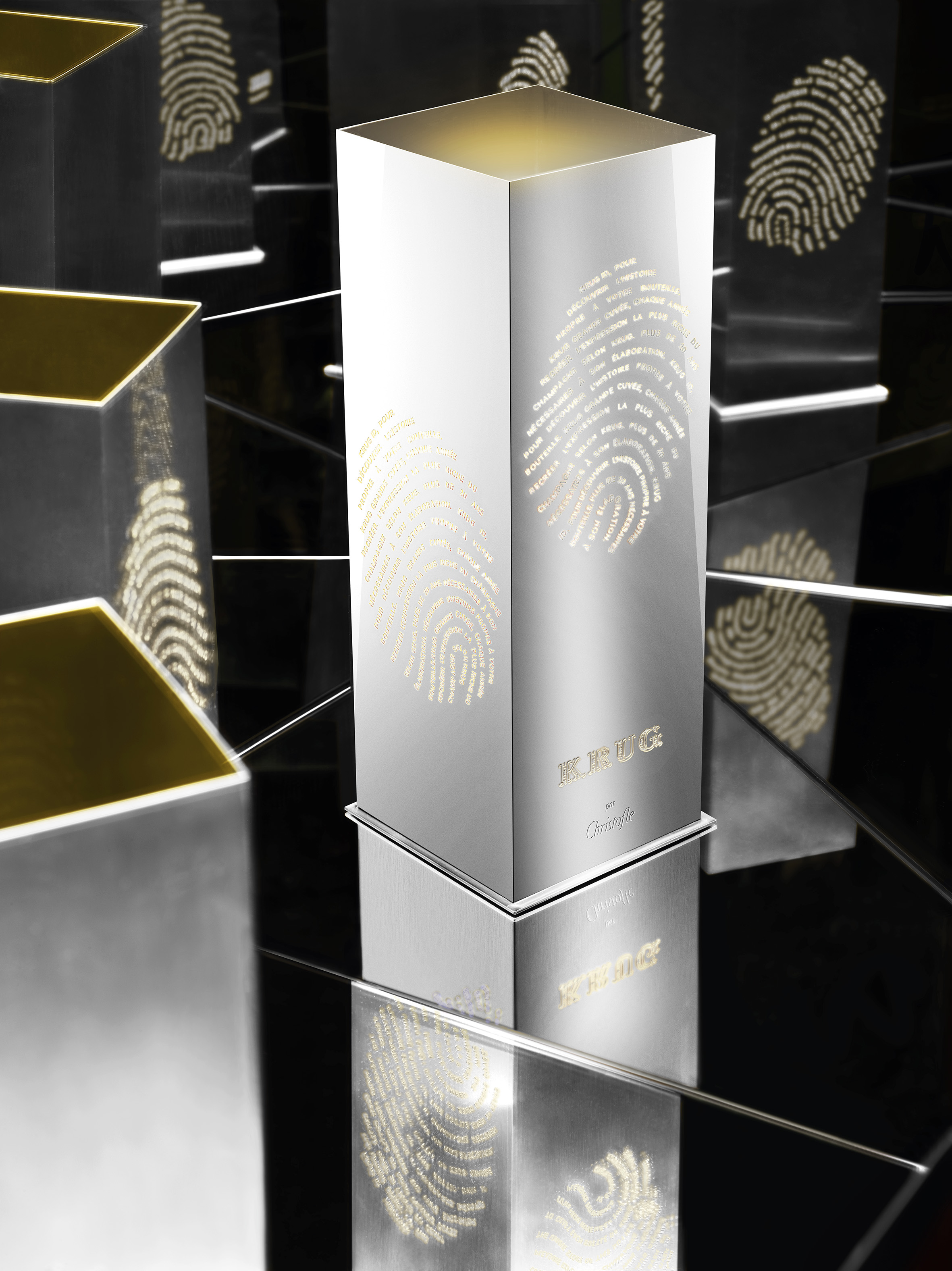 L’étui aux lignes élégantes et contemporaines est ajouré sur chacun de ses côtés, où des écritures composent des empreintes digitales, évocation de l’identité et l’histoire propre à chaque bouteille. Une fois retiré le coffret Krug Grande Cuvée, le fourreau servira de photophore, laissant filtrer la lumière au travers des empreintes découpées dans le métal.