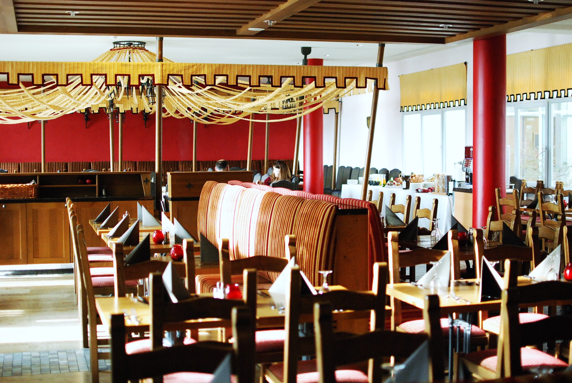 Côté restauration, vous aurez le choix entre deux restaurants : le restaurant Sanssouci, en référence au palais de Sanssouci du roi de Prusse Frédéric II, situé à Potsdam, principalement lieu du petit-déjeuner. Servi sous forme de buffet, un choix assez riche de plats chauds, froid et viennoiseries sont proposés tous les jours de 7h à 11h. Il dispose de 272 places.