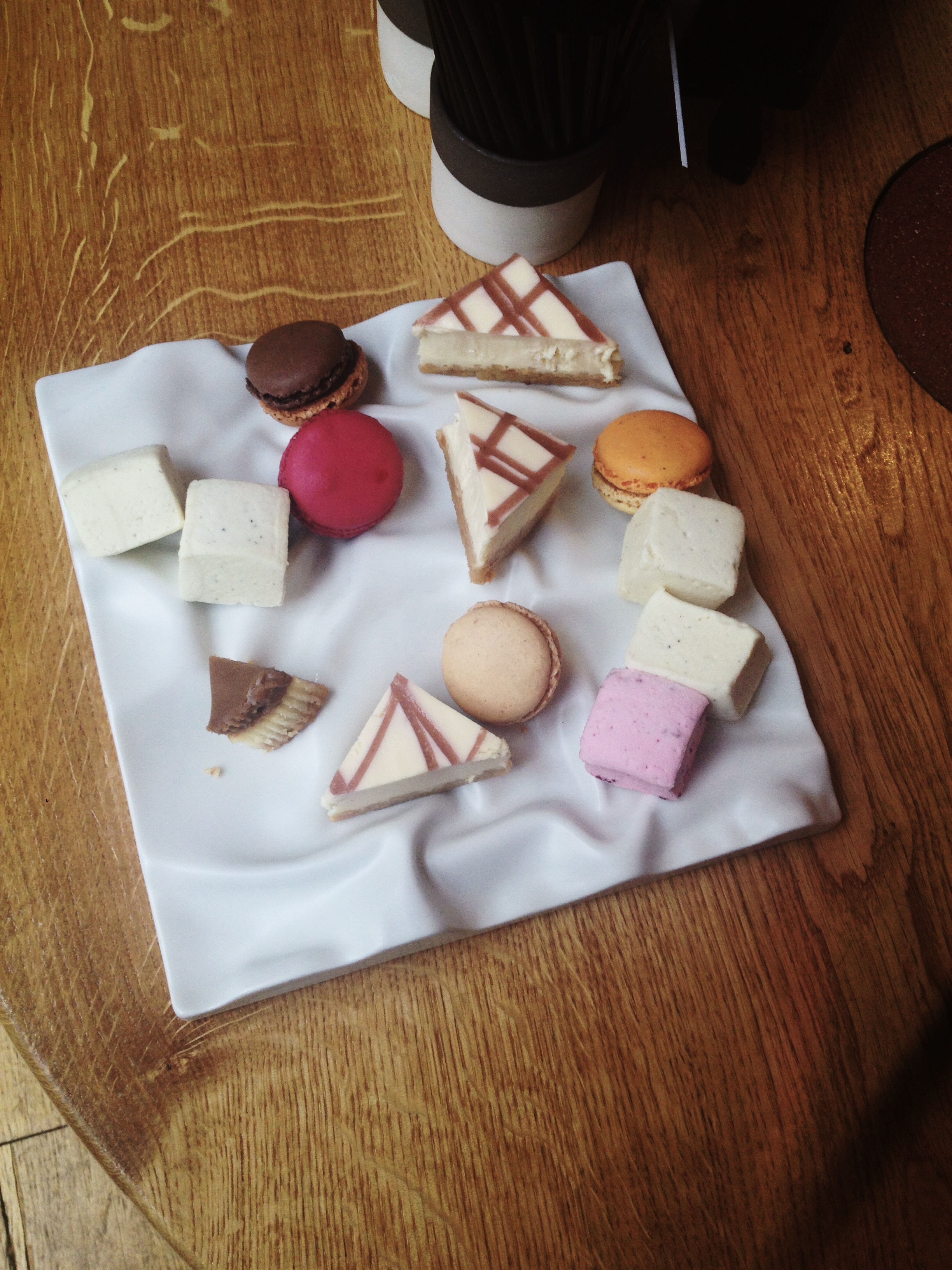 Le pré dessert composé de petites part de mille feuilles, guimauves et macarons.