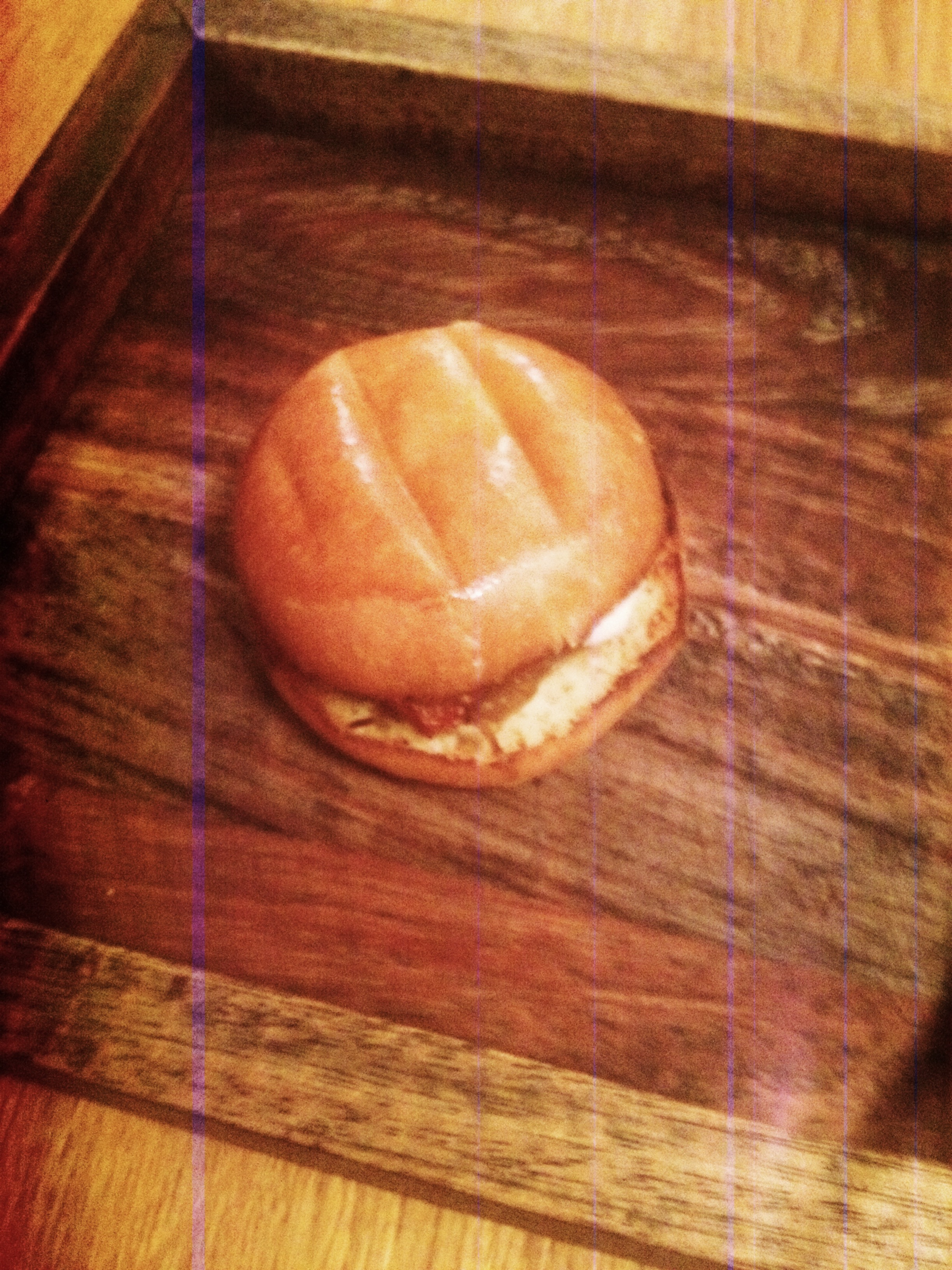 puis le mini burger Monop’ composé de mozzarella, vinaigre exquis, tomates séchées, du pesto alla genovese et relevé avec de la moutarde aux fines herbes