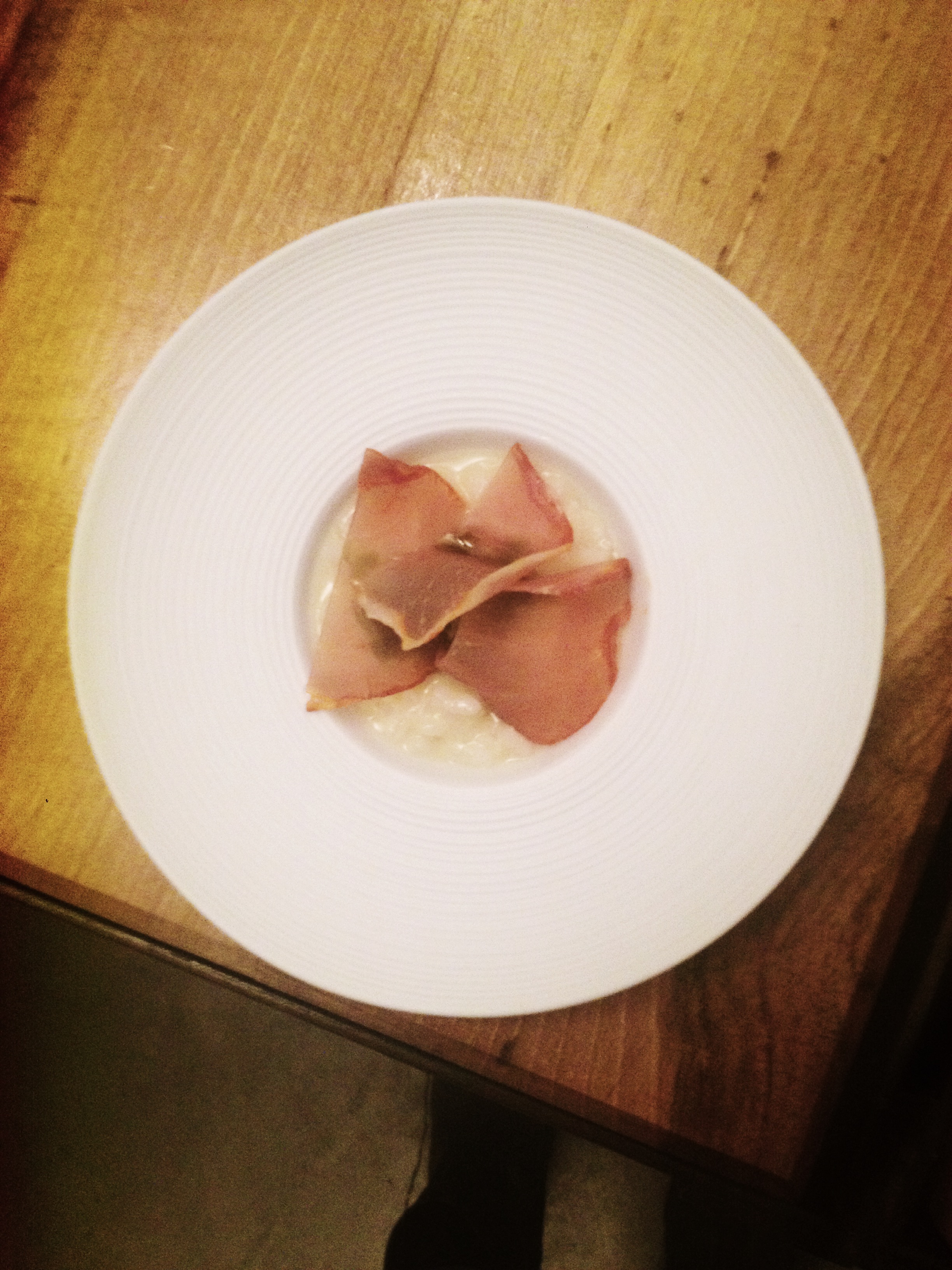 Voici le risotto réalisé avec le riz arrobio, importé d’Italie, du Lomo et le pesto