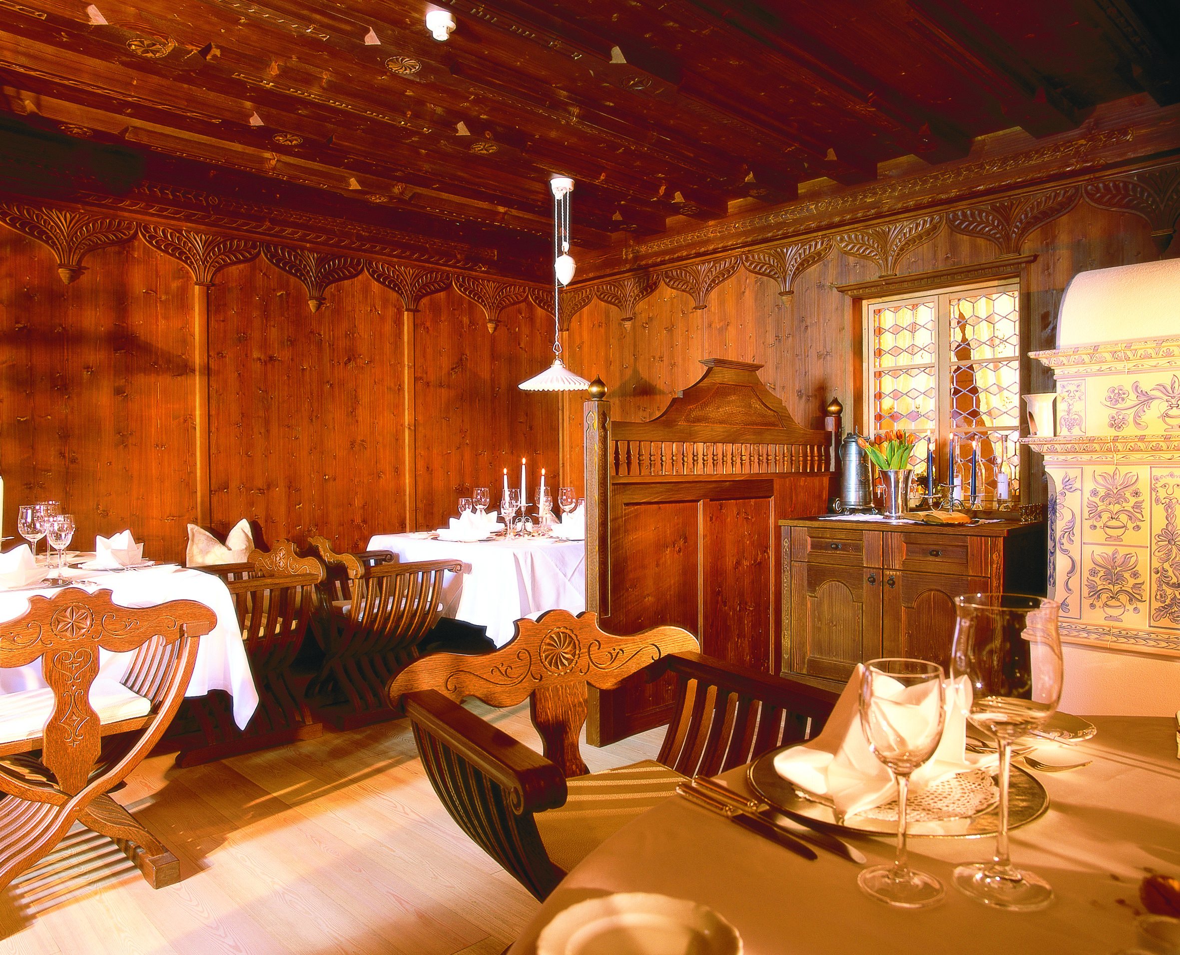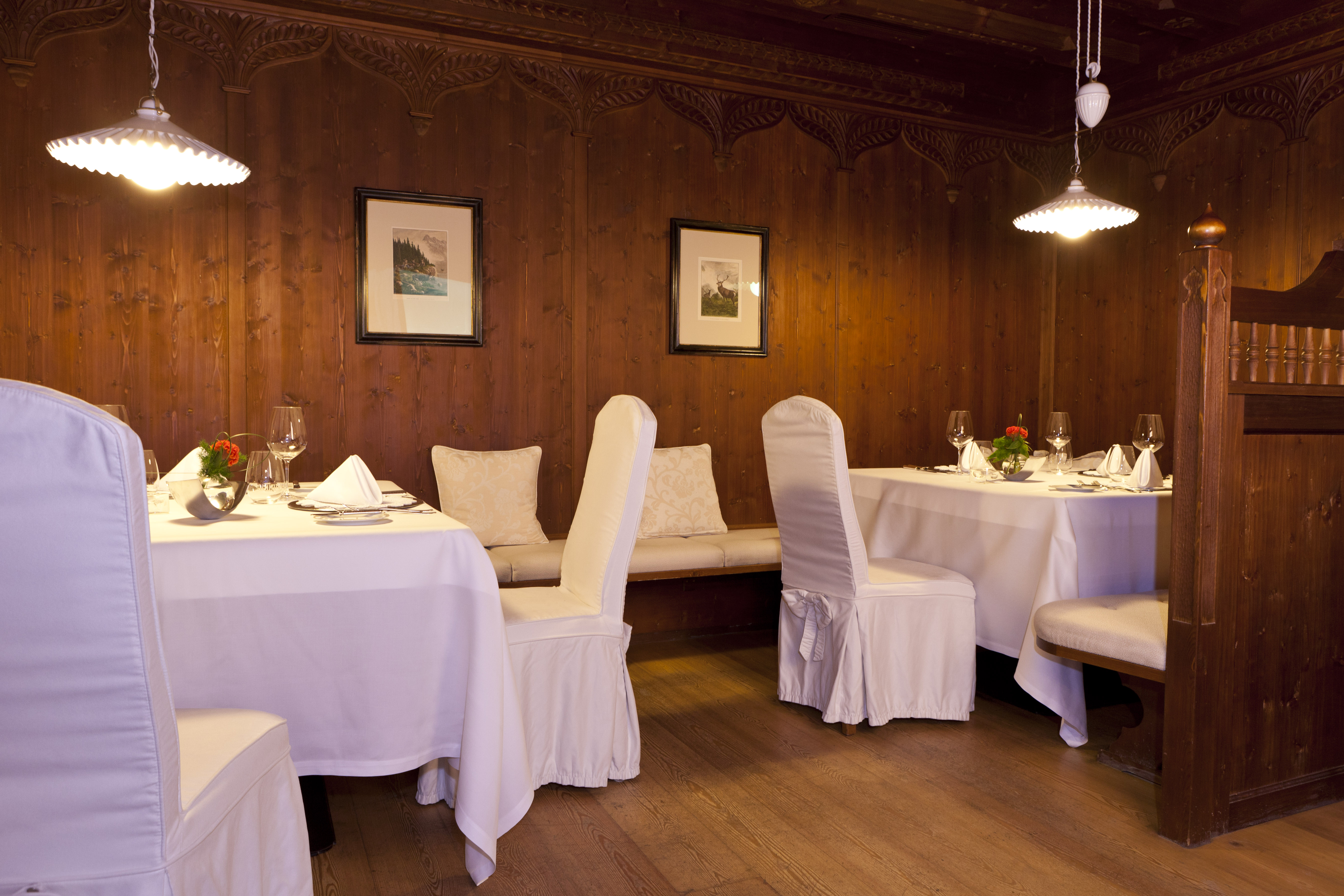 L’espace consacré à la restauration, composé de différentes salles à l’ambiance intimiste, a adopté un style contemporain de caractère, aussi raffiné que distingué. Avec ses lambris en bois clair et ses coquettes fantaisies décoratives, la traditionnelle « Stube » a, de son côté, gardé son esprit attaché aux traditions. Les 51 chambres et suites de grand confort ont, quant à elles, préservé l’empreinte d’un style classique où chaque détail a son importance.