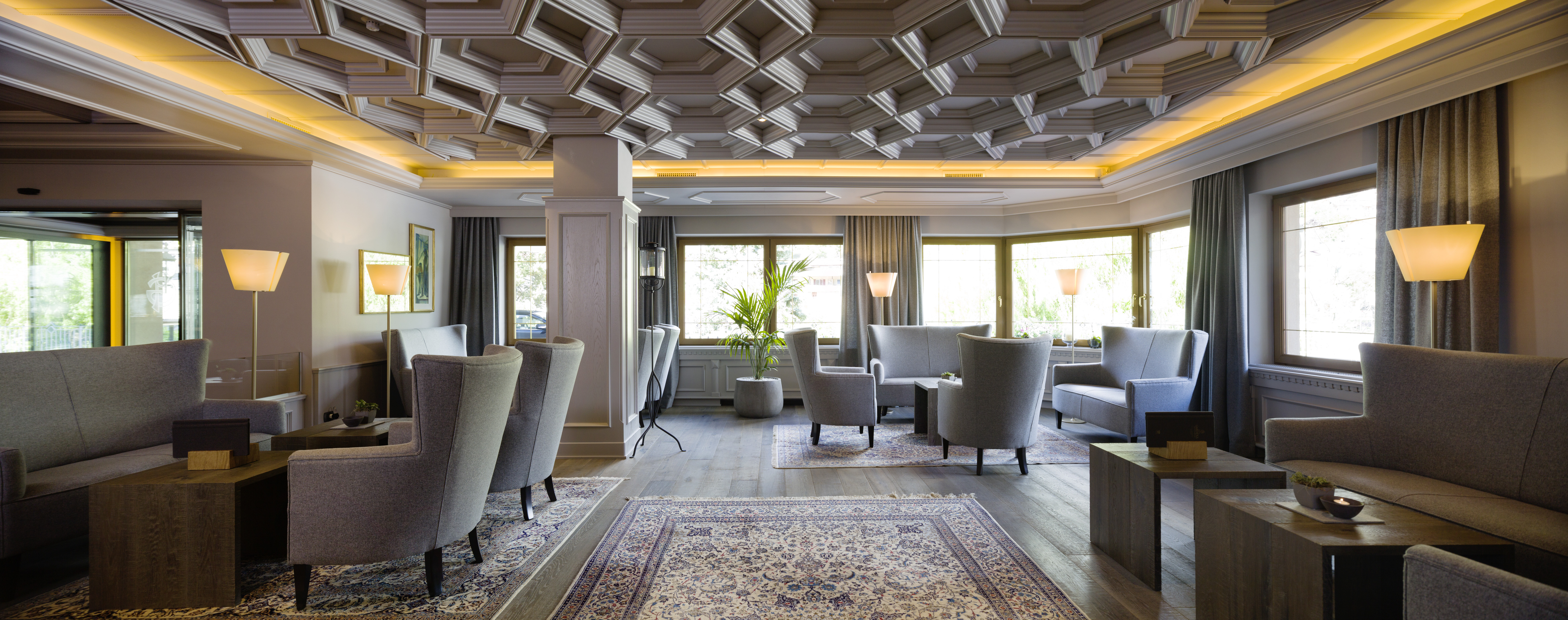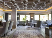À l’Hôtel Gardena Grödernhof, tout a été pensé pour cocooner le visiteur. Les ambiances feutrées et le décor élégant oscillent entre chic traditionnel et esprit contemporain. La réception de conception moderne, la bibliothèque attenante et le lounge bar avec sa magistrale cheminée en pierre et son mobilier aux lignes épurées, jouent une partition contemporaine dans une déclinaison de tons gris, taupe et blanc.
