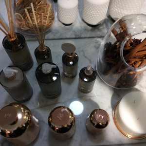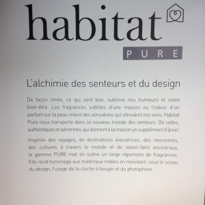 Une fois, remis de nos premières sensations, nous avons pu découvrir un concept vraiment très bien pensé. Rien que les noms de gamme sont pensés pour être en harmonie (pure impérial, pure oriental, pure thermal et pure cardinal), un vrai « al » de douceur pour nos petites oreilles. Puis quand on se promène on découvre une table de marbre blanc, noble, blanc, pure, en adéquation avec l’identité d’Habitat pure. Petit à petit à force d’observer flasques, flacons, bougies et autres produits, on se rends compte de la noblesse des matières (cuivre, céramiques, verres, ect…).