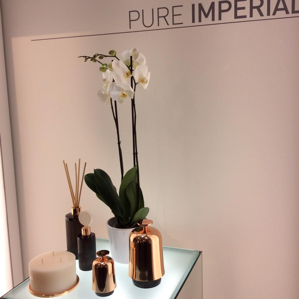La gamme pure impérial, nous fait voyager du coté plutôt de l’Asie avec des parfums comme « sentier de jade », « automne à Kyoto » et « bois de santal impérial ». Le tout mis en avant avec un objet datant du 19 ème siècle la cloche en métal cuivré. Toute la gamme bougie, céramique parfumée, vaporisateur d’ambiance et bouquet parfumé, bain moussant, lait pour le corps et gel lavant mains, possède un rappel de cette riche matière cuivré.