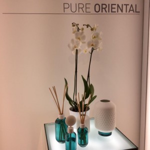 A l’opposé de cette gamme mais basée sur le même concept, la gamme pure oriental. Ici c’est l’orient qui exalte nos sens avec des senteurs comme « délice au palais d’été », « jasmin de nuit » et « basilic royal ». La bougie est sertie d’un photophore en céramique un symbole fort de la tradition arabe, le Moucharabieh. On retrouve les mêmes produits que dans la première gamme, à quelques différences près de design, de matières et de senteurs bien évidemment.
