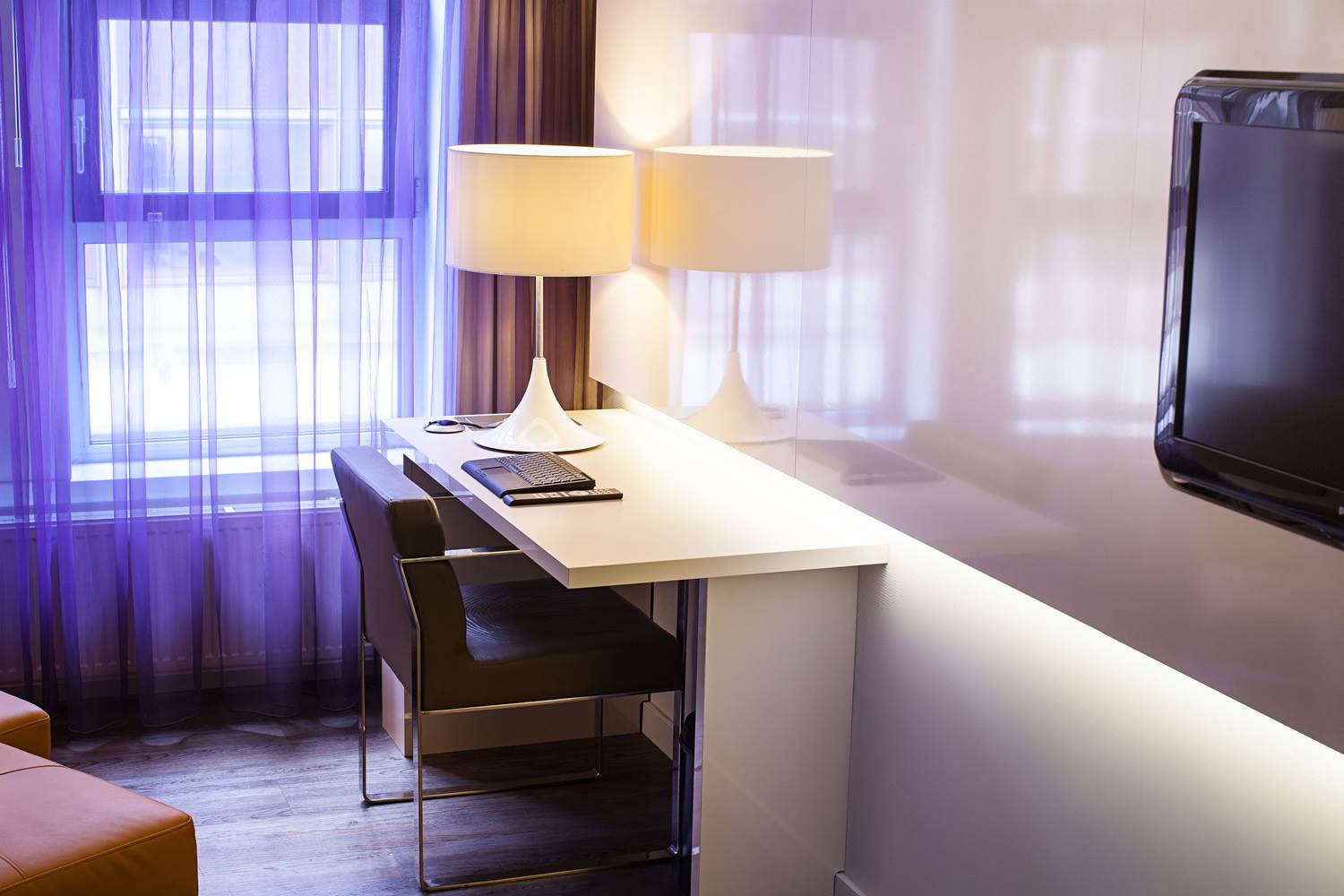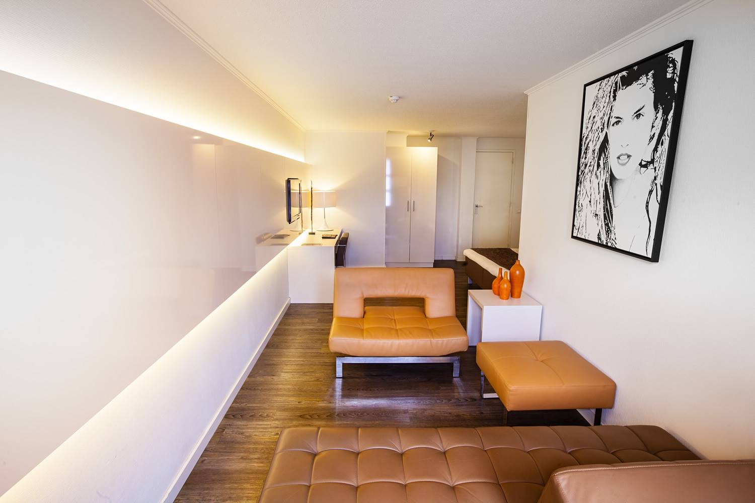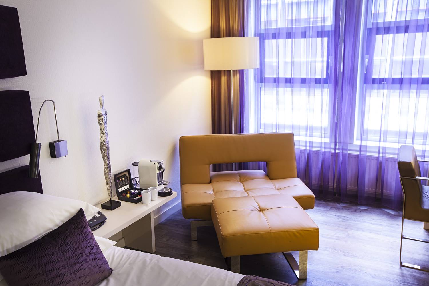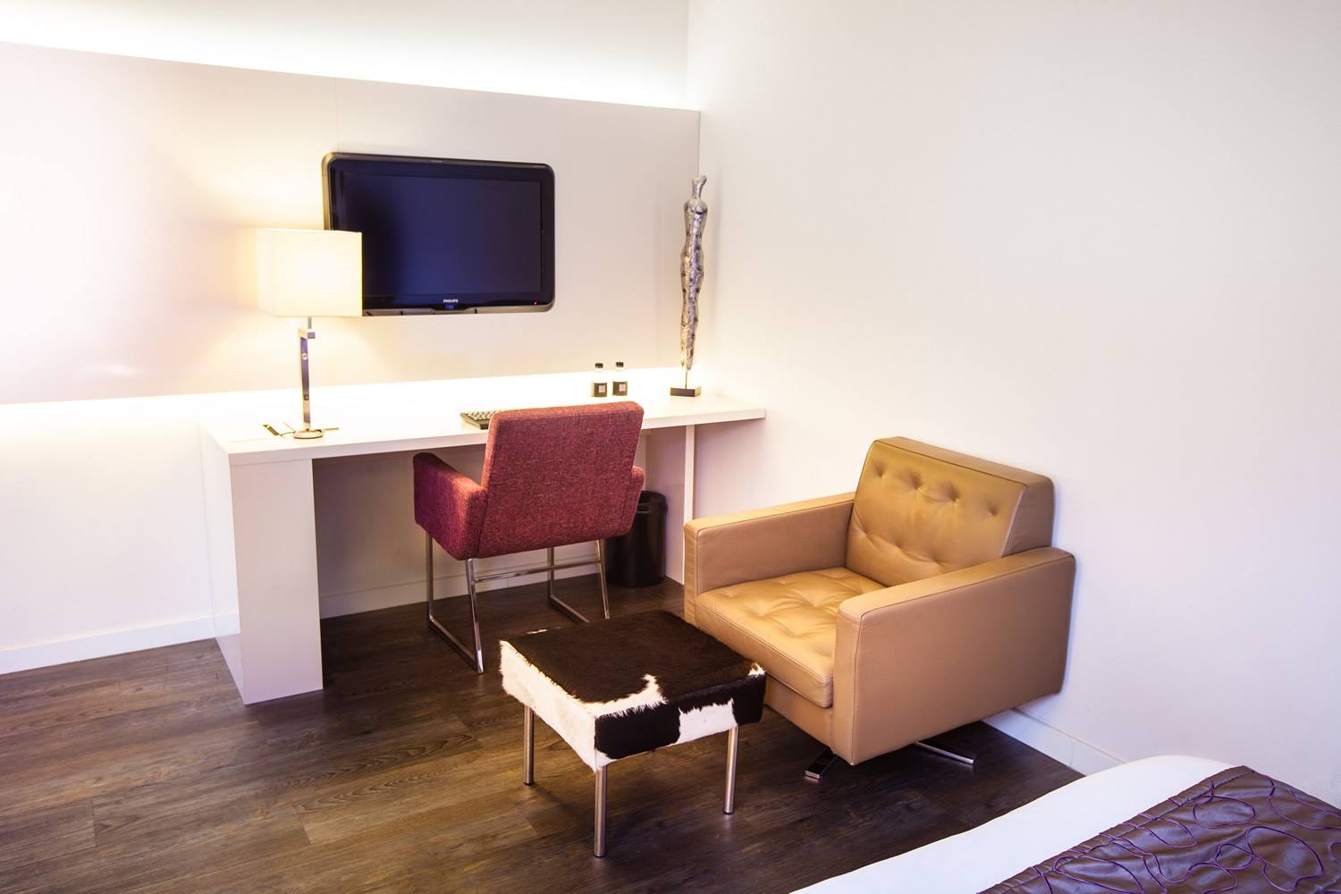 Profitez de vous prélasser dans un fauteuil design beau et confortable (Andrew Lund, Flemming Højfeldt et Per Weiss) du dernier système de divertissement ‘Sensiq’ sur un écran plat Full HD 32 ». Les lampes de chevet sont du célèbre designer italien Enzo Catellani.