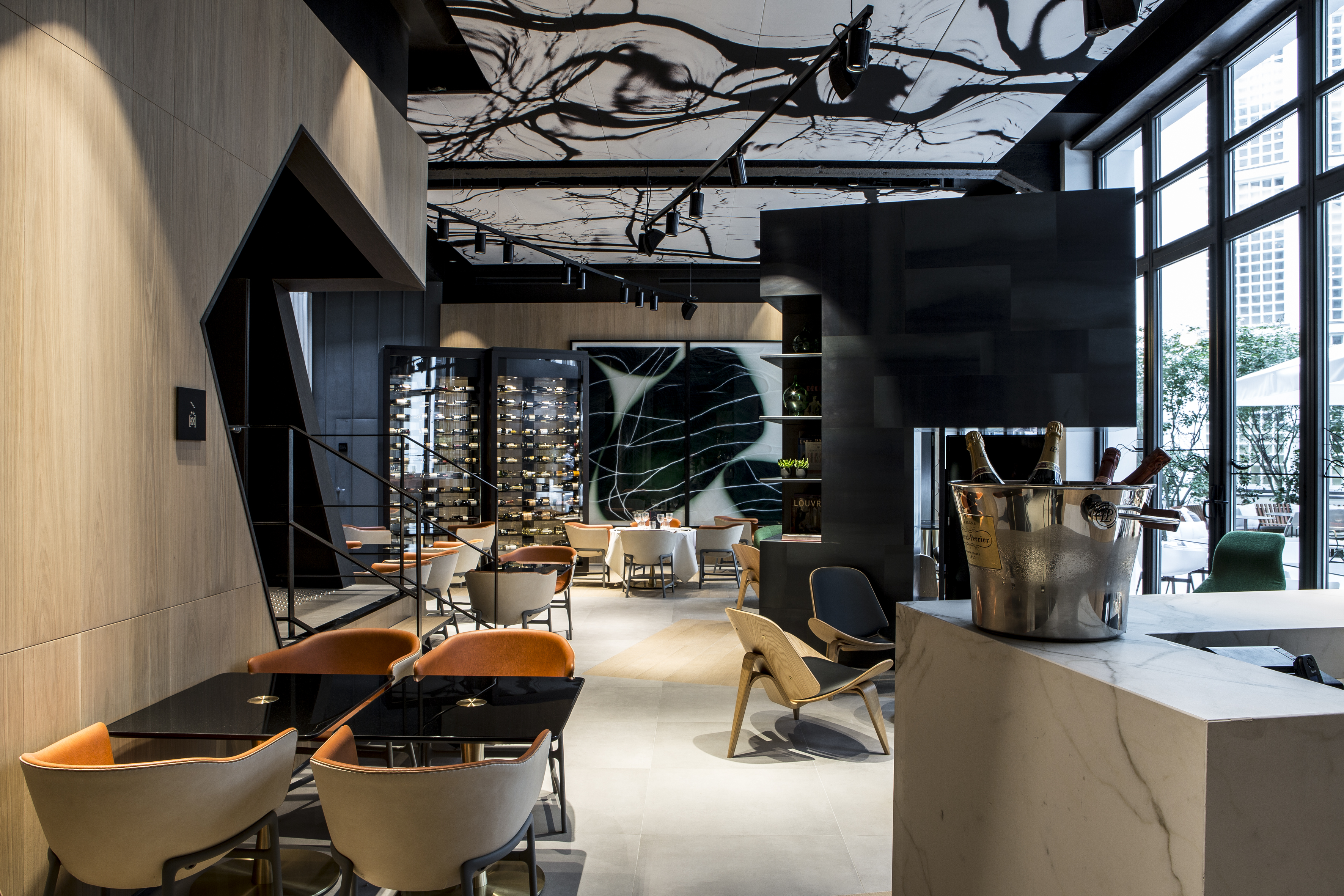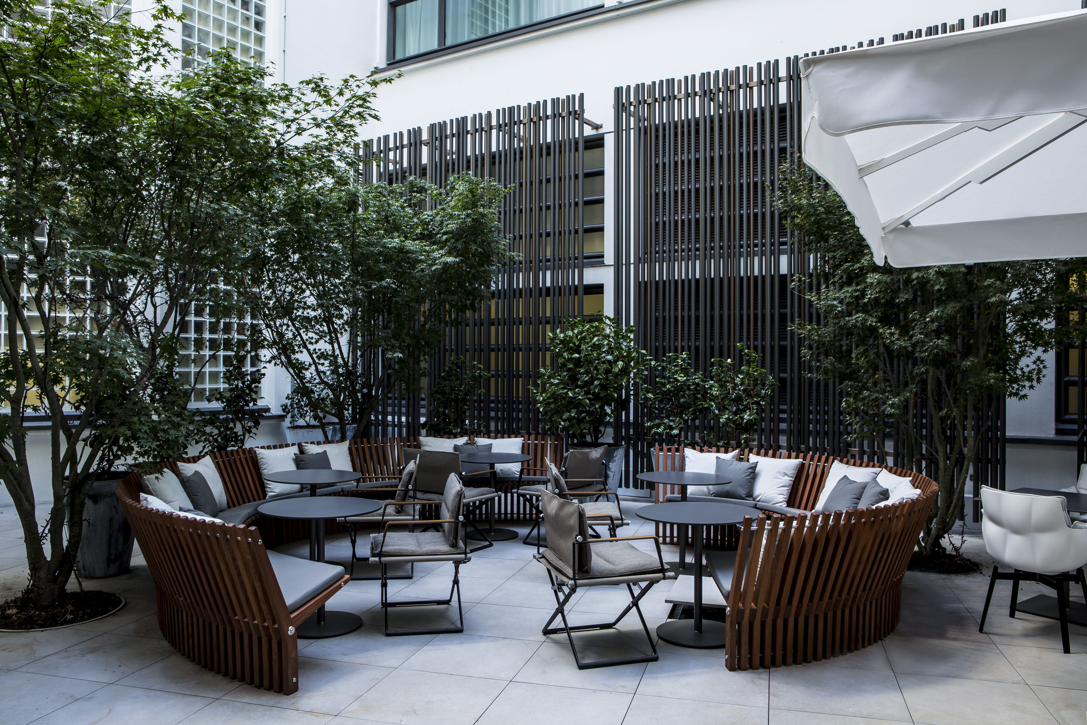Élément central de l’hôtel, le patio verdoyant offre un abri naturel apaisant et soustrait à l’environnement urbain. Un claustra en jeu d’orgue invite à se rendre dans un havre où les essences végétales forment une canopée protectrice. D’amples banquettes circulaires en frêne conversent avec de confortables chaises à coussins blancs, parasols, chaises longues. Photophores et éclairages poétiques confirment le charme d’un lieu à part. Un sentiment éprouvé dès la découverte du lobby. Courant sous les fenêtres en bandeau, les bibliothèques enrichies d’oeuvres d’art et livres dialoguent avec un mobilier exclusif. A l’image des desks repensés en deux monolithes de marbre qui semblent attendre le ciseau du sculpteur, en écho aux photographies monumentales de Jean-Pierre Porcher, réalisées à partir des oeuvres de Rodin. De gigantesques abat-jours cubiques se déploient jusqu’au plafond et impriment le « concept de boîtes objets » développé dans l’hôtel. Emblématique du raffinement des éditions Charles, le bureau organique du concierge Clé d’Or,dessiné par l’Agence Nuel, confirme la personnalité de l’établissement. Pensé comme le prolongement naturel du patio, le lounge bar cultive l’ambiance d’un lumineux loft atelier avec canapés, vert ou noir, d’inspiration années 30-40, tabourets de bar teinté chêne clair, paravents d’acier percé. Un mobilier imaginé pour parfaitement s’adapter aux besoins des hôtes. Rendez-vous d’affaires informel au coin de la cheminée, thé post-expositions – le quartier regorge de musées, Rodin, Invalides, Orsay -, ou encore pause post-shopping dans les rues voisines (Clerc, Saint-Dominique).Le petit-déjeuner est lui aussi réinventé : servi autour d’une table d’hôte créée sur mesure en ilot central, elle permet au chef de converser avec ses clients et de concrétiser directement leurs envies dans sa « show kitchen ».