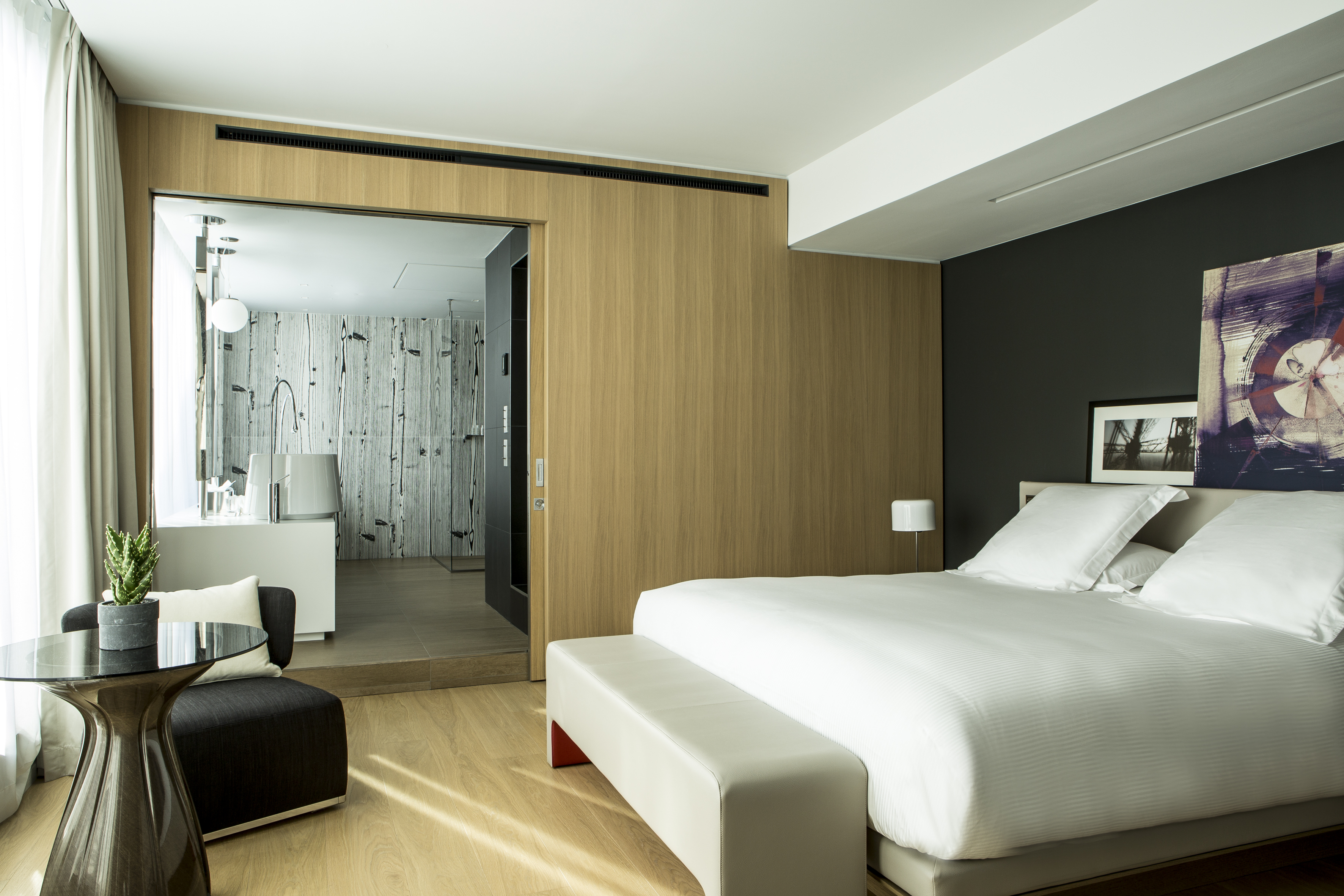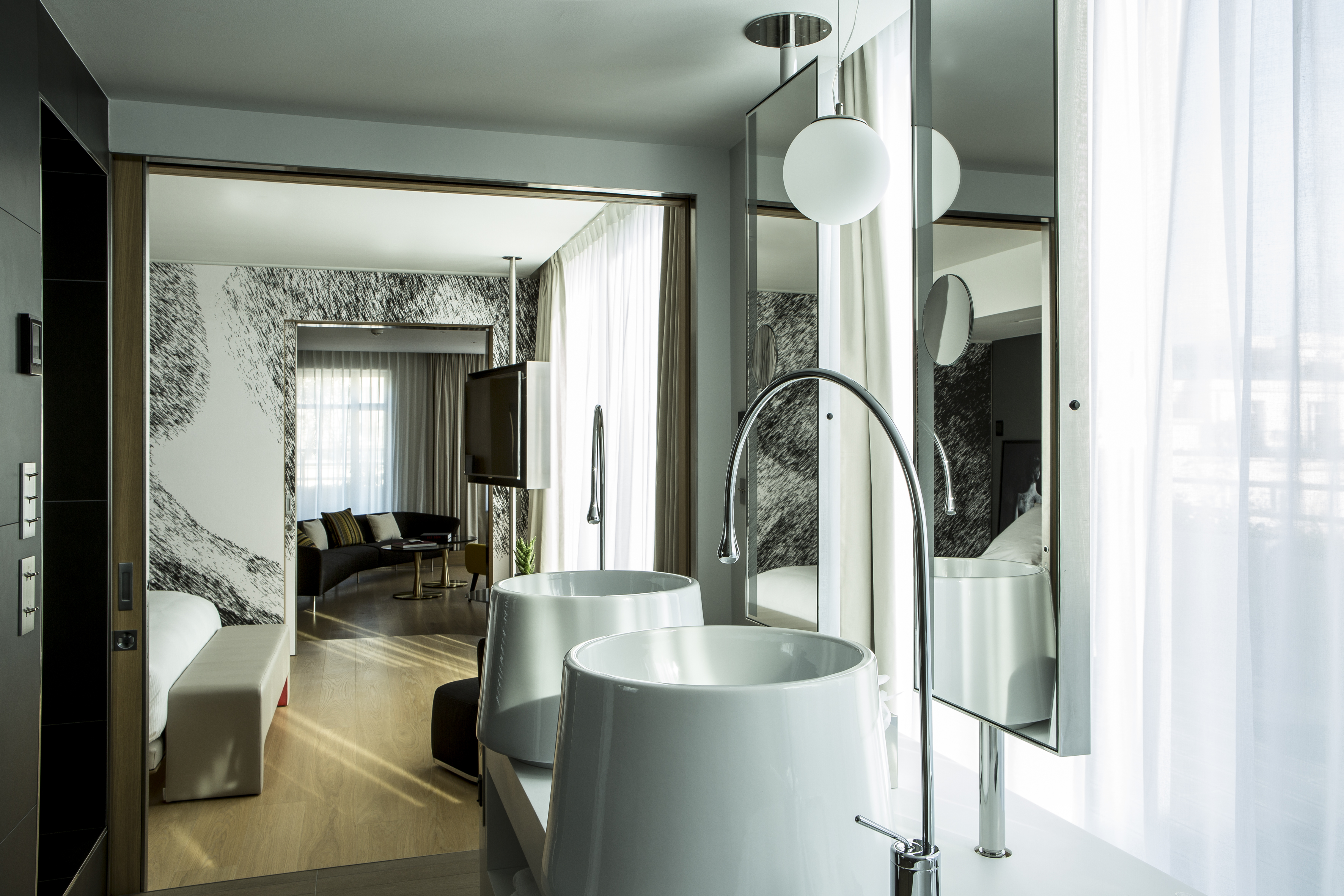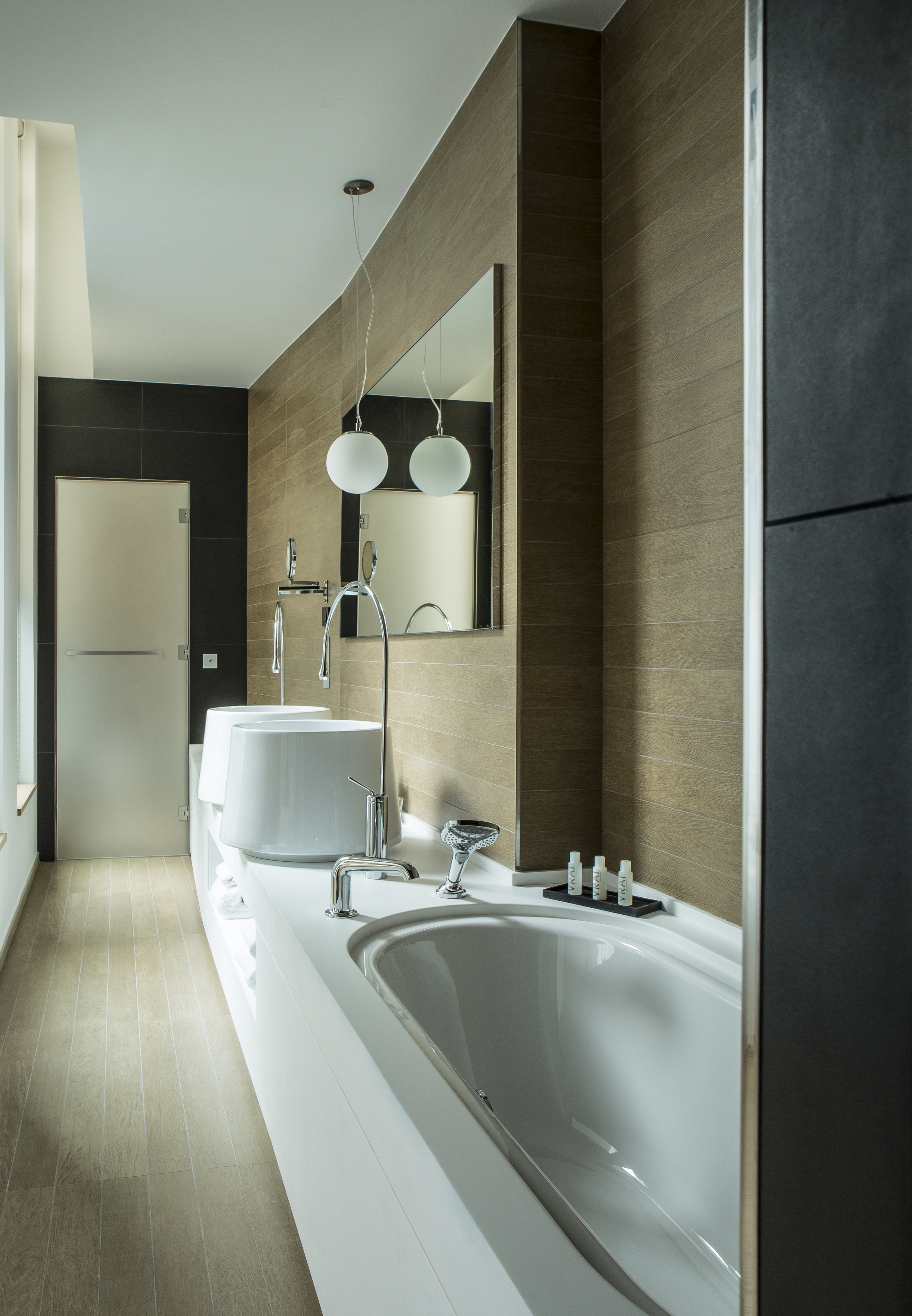Au dernier étage de l’hôtel, quatre suites exceptionnelles avec terrasse paysagée dévoilent une vue unique sur Paris. Au premier plan, le Dôme tricentenaire des Invalides révèle ses trophées ciselés dans l’or, un spectacle à savourer confortablement installé sur un transat ou même dans son jacuzzi privé, enveloppé des parfums des plantes voisines : oliviers de Bohême, gauras, menthe australienne, roses, camélias. De l’autre côté, la Tour Eiffel se dresse fièrement, entourée des toits, jardins et monuments parisiens. Baignée de lumière naturelle, chaque suite au luxe non ostentatoire, cultive un agencement atypique, offrant de nombreux scenarii de vie. Les portes coulissantes permettent ainsi de réunir les différents lieux, chambre au lit king size face au panorama fascinant, salon évocateur d’un loft de collectionneur avec parquet de chêne huilé, canapé magistral, totem lumineux, en laiton patiné bronze habillé de boules de verre soufflé. Placée elle aussi face à la terrasse et la vue sur Paris, la salle de bain marie mur de chêne, carrelage blanc et foncé, avec vasques « abat-jours » et baignoires posées devant la baie vitrée, une expérience inoubliable.