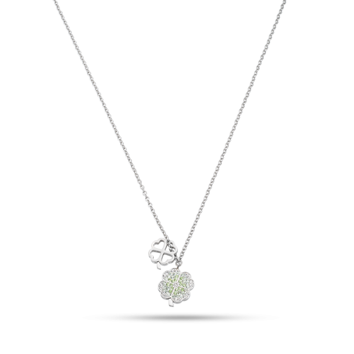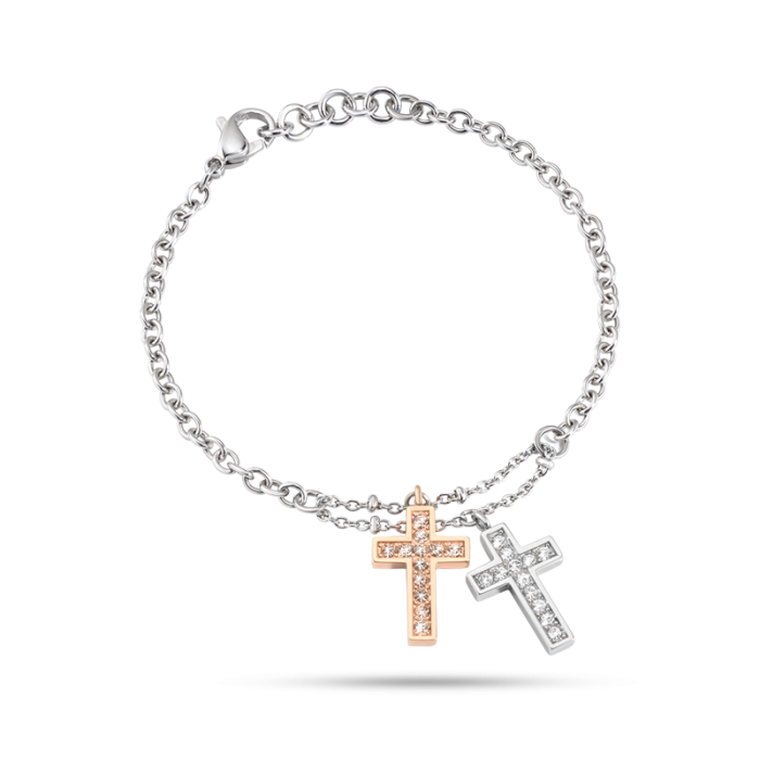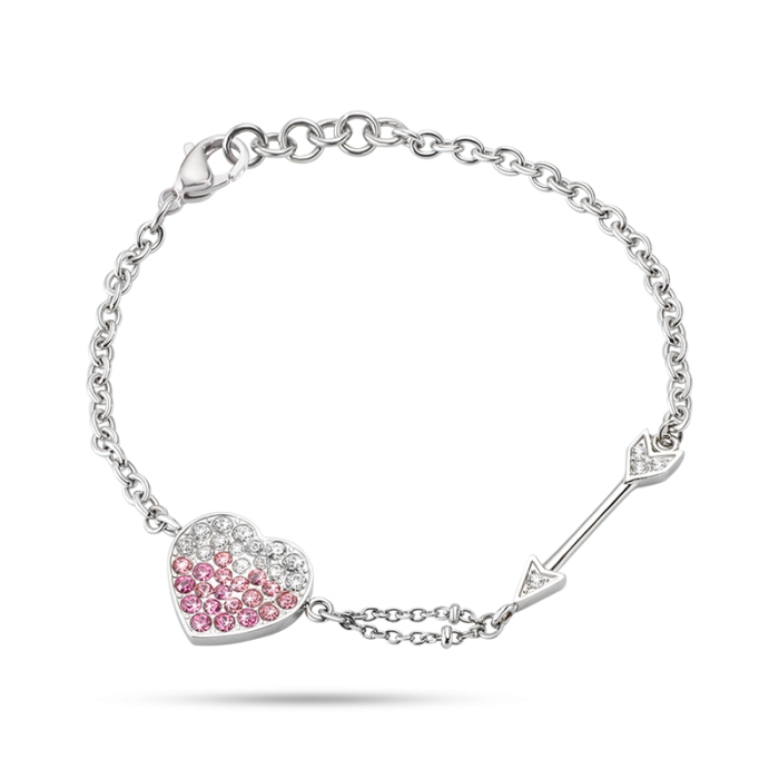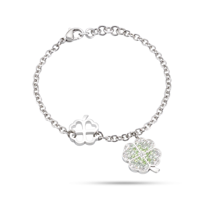 Liez-vous à la chance et à l’amour avec la collection Love, composée de bracelets et colliers. L’acier se mêle aux cristaux blancs et colorés, prenant la forme d’un trèfle à quatre feuilles vert ou d’un cœur rose. De petites croix en acier et or rose mêlées de cristaux viennent compléter les bijoux.