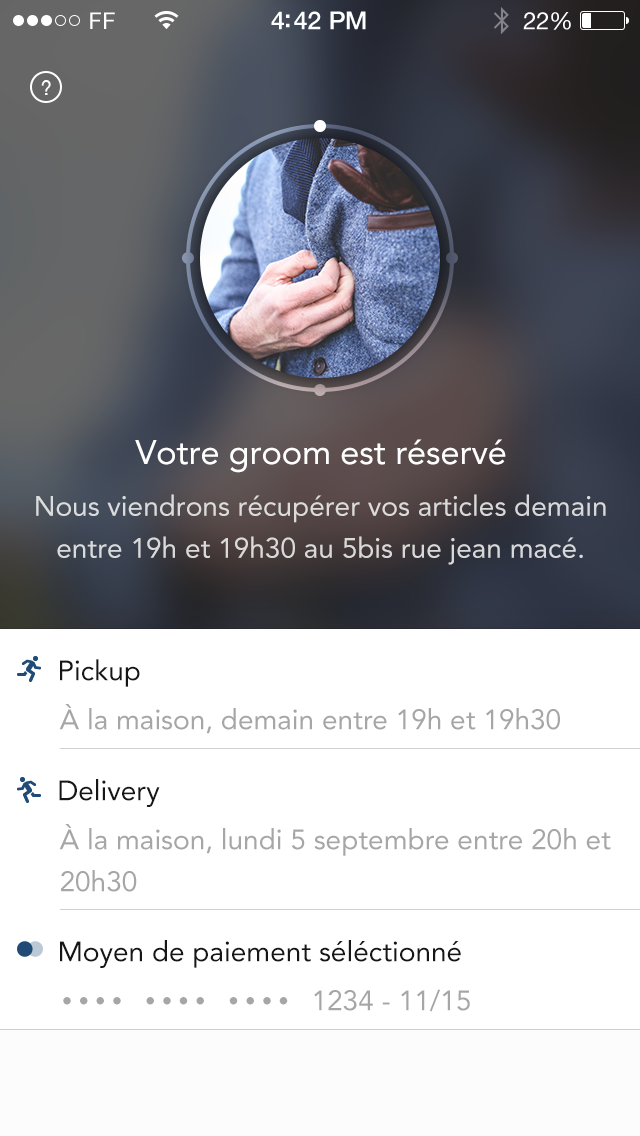 Réserver un Groom Cleanio ne prend pas plus d’une minute. Une fois que l’utilisateur a ajouté son adresse, il lui suffit de sélectioner un lieu et un horaire pour le ramassage et la restitution de ses vêtements. Avec Cleanio, pas de besoin de se répéter. L’utilisateur renseigne ses informations à l’inscription (adresses, téléphone, moyen de paiement) et n’a plus besoin de le faire ensuite.