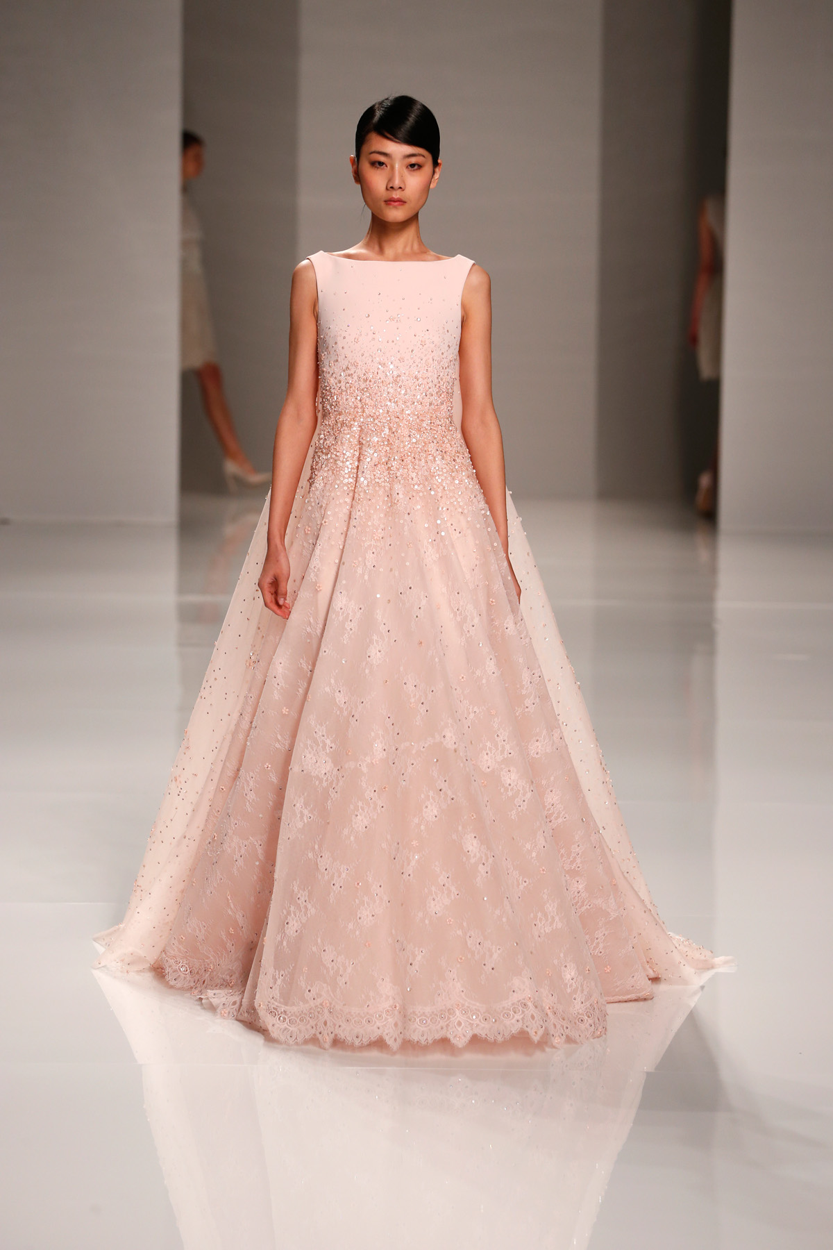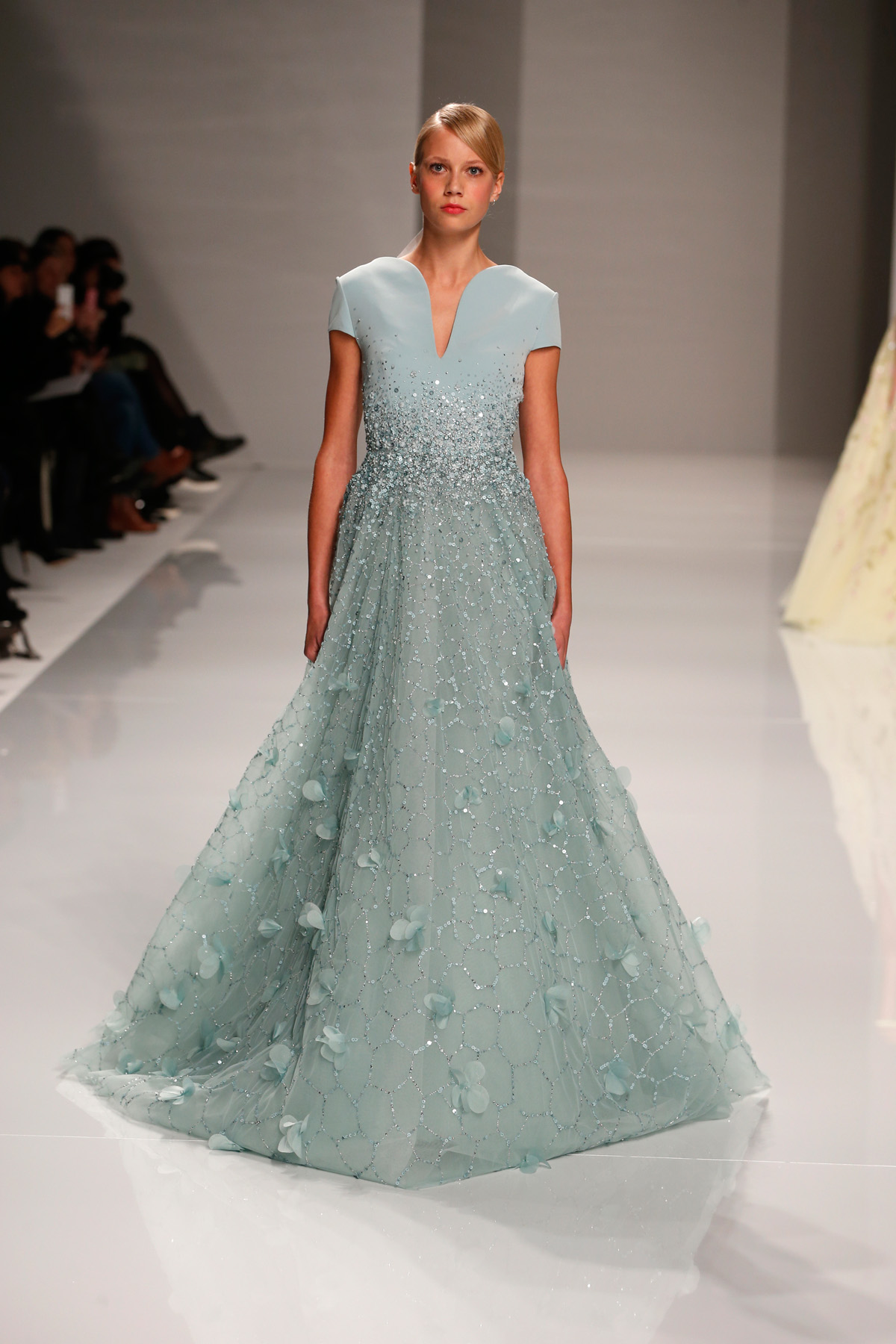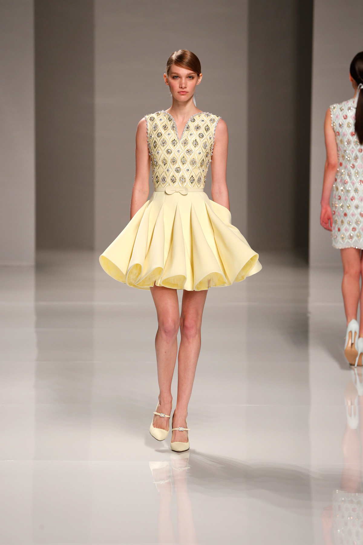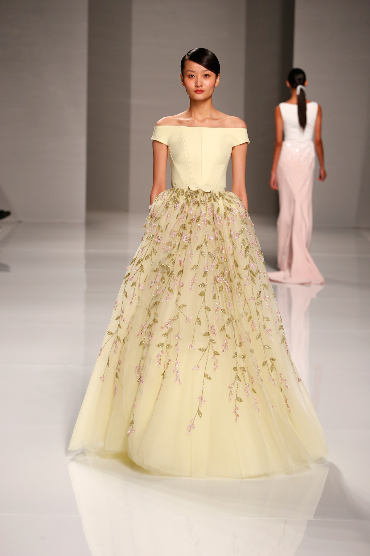 Sa collection printemps/été propose des couleurs pastels aux touches fleuries réchauffant l’hiver, embellies dans des pièces aussi longues que courtes. De véritables tenues issues tout droit d’un conte de fée, aussi scintillantes que légères.