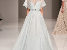 L’élégance prend la forme de robes de mousseline, de capes sophistiquées ou encore de papillons éphémères et de fleur de pensées brodées à la main.