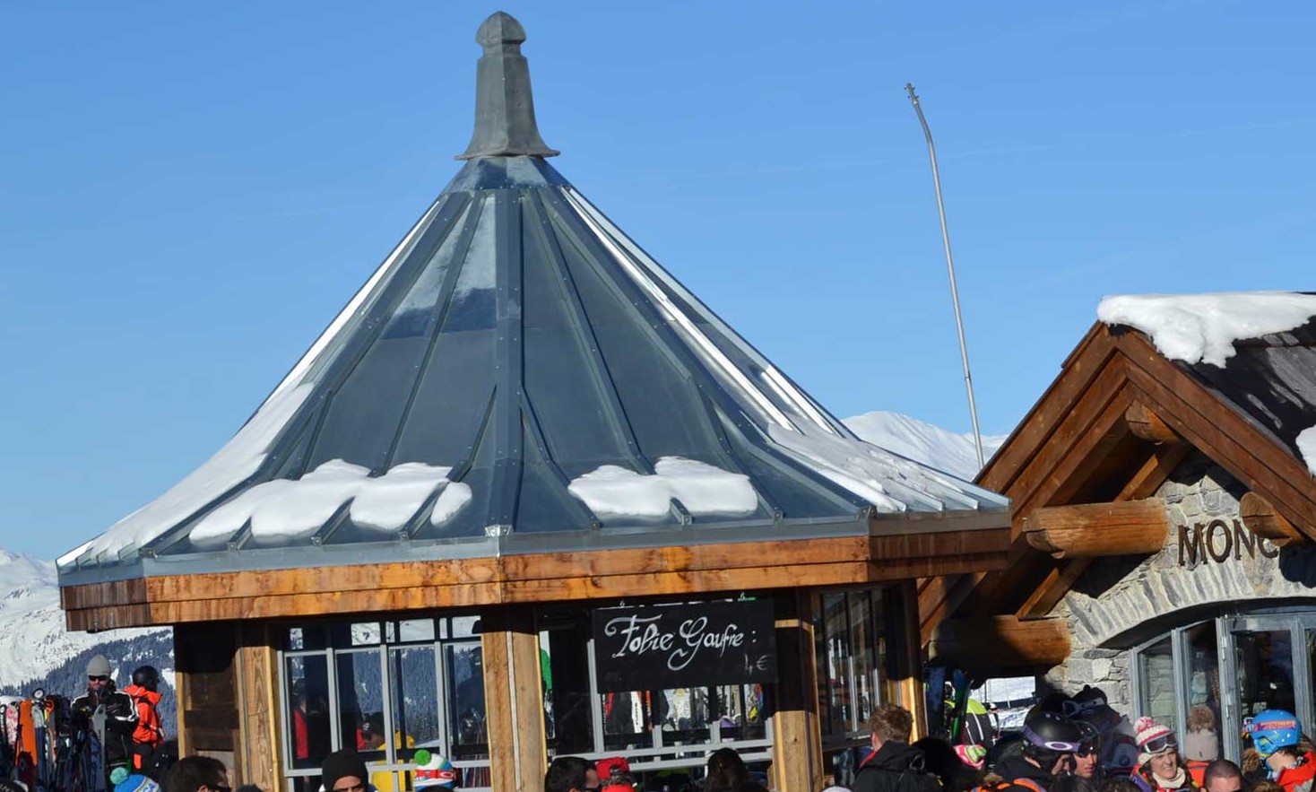 Surplombant la piste de danse, ce chalet fait de baies vitrées est décoré de lustres en plexiglass et, de grosses tables de bois (disposant de coffre pour les accessoires de ski) offre une vue imprenable tant sur les pistes que sur la piste – de danse..
