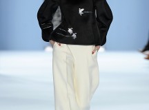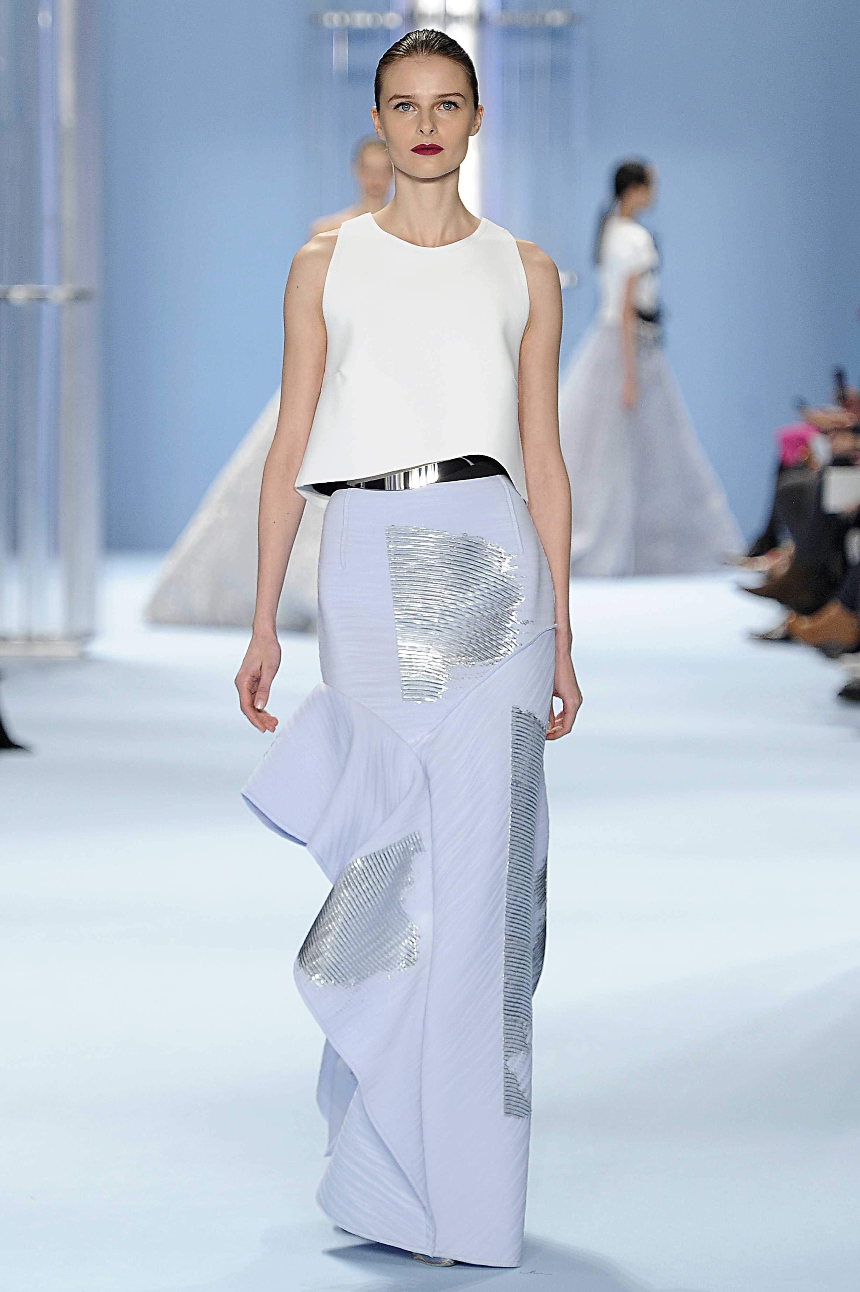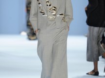 Dans un flot de jupes virevoltantes, de pantalons et de robes aux volants ondulants, la styliste surfe sur des tons gris eu bleus, réchauffés par des touches pourprées.