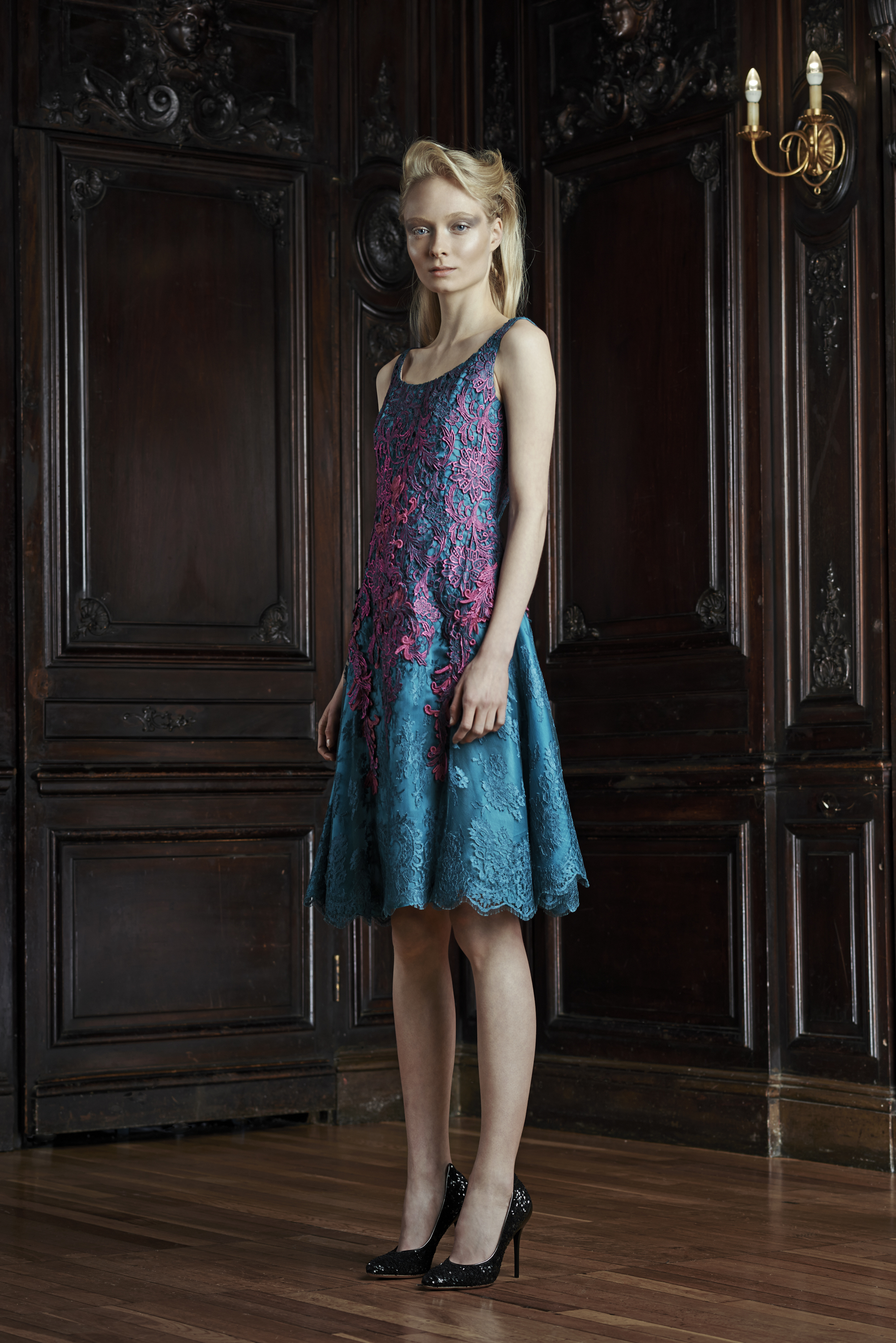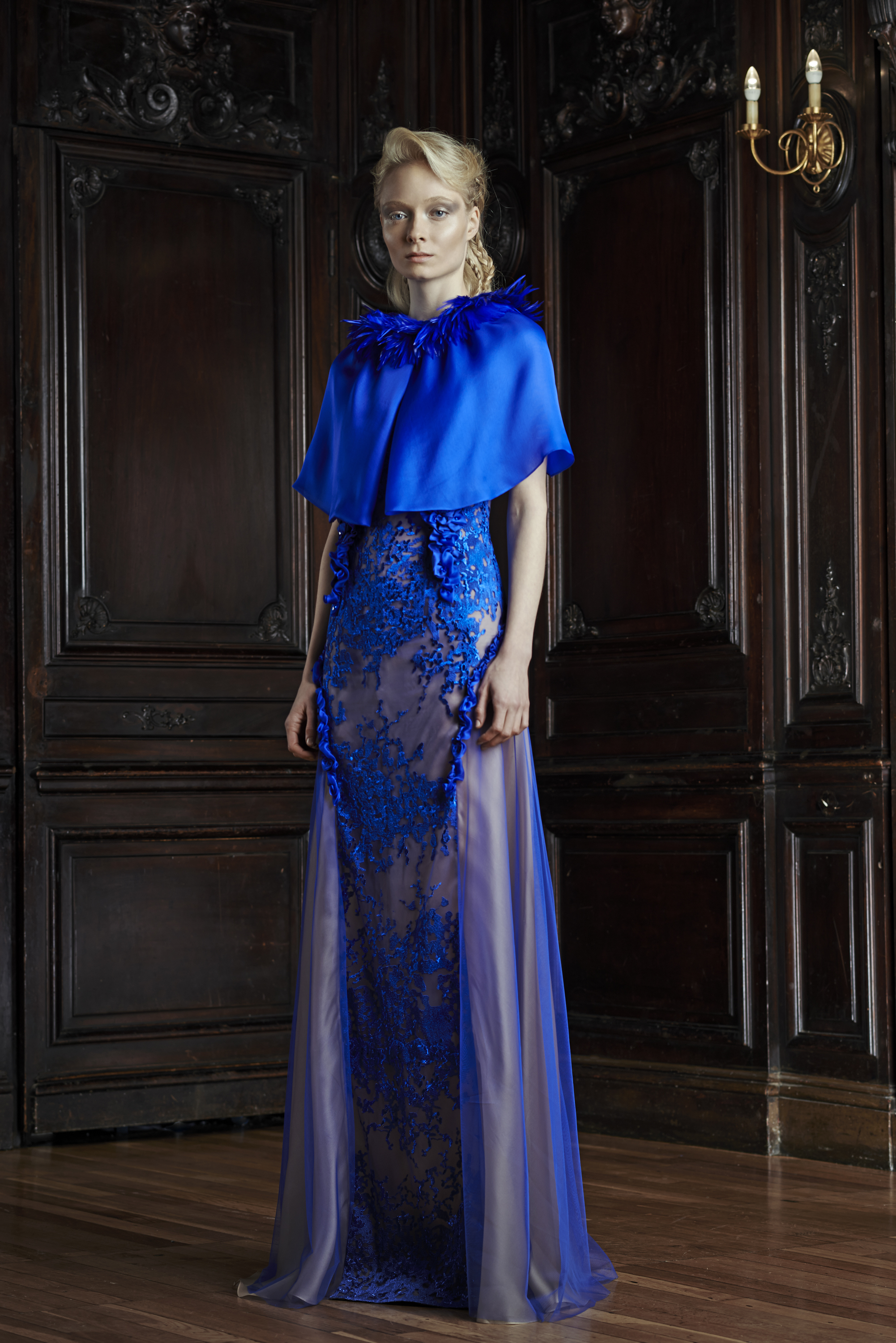 La maison de prêt à couture thaïlandaise a présenté la collection Reines-de-la-nuit, en référence au nom d’une fleur nocturne qui ne pousse qu’une fois par an. Busardi nous emporte dans un imaginaire dans lequel la reine est absolue et toute-puissante, icône suprême d’élégance. La simplicité des coupes révèle l’attention portée sur la matière même : c’est ainsi que les robes se brodent de fleurs en guipure ou en dentelle Chantilly. Toute la collection oscille entre bleu profond et bleu roi en se teintant par moments d’un violet vif, une palette qui se calque sur les tons sombres de la nuit. Virtuose de l’ornementation, Busardi a créé des robes inspirées de l’époque victorienne, tout un vestiaire digne d’une reine. Les mannequins adoptent donc un port altier en parfait accord avec les créations qu’elles portent. Ce thème permet surtout de faire valoir l’ingéniosité de cette maison qui s’appuie sur l’héritage de l’artisanat thaï et de ses sublimes matériaux. En mêlant codes occidentaux et matières orientales, la griffe obtient une ligne dont on ne démentirait pas l’excellence.