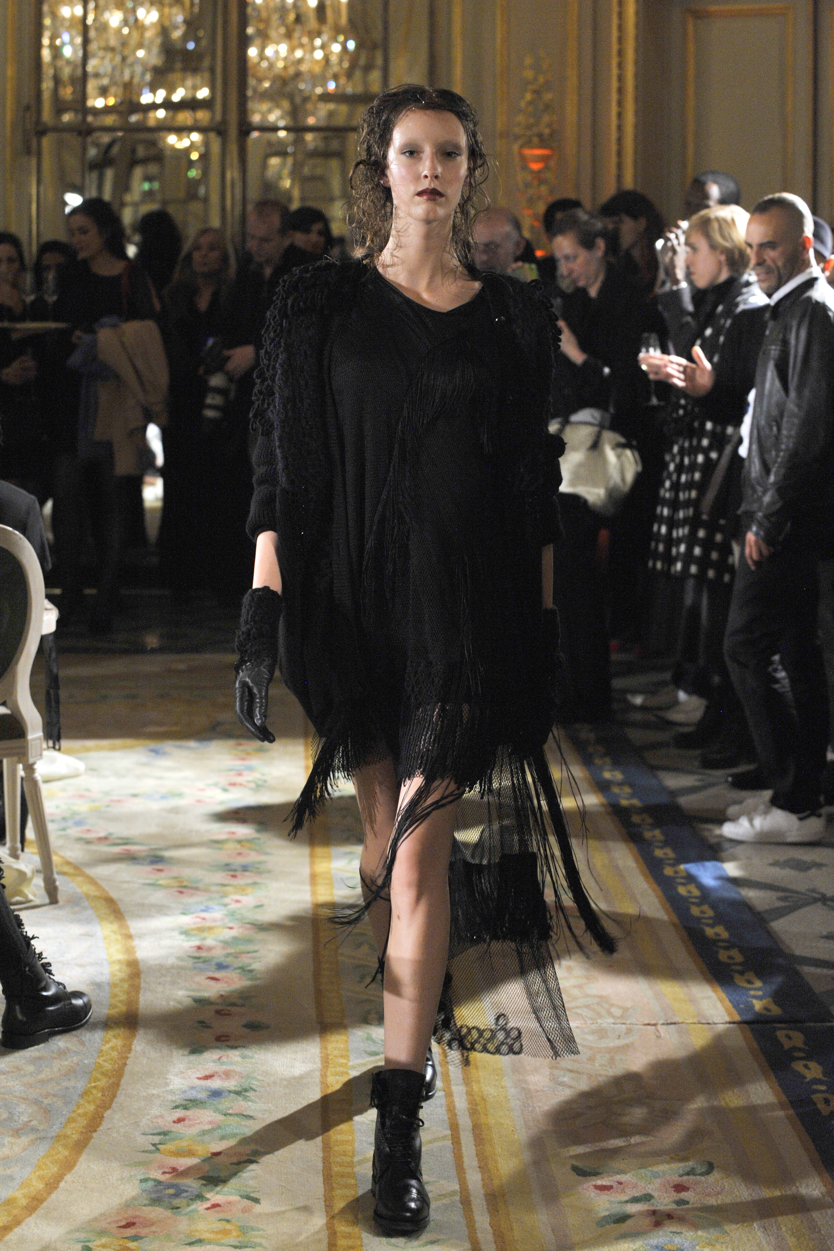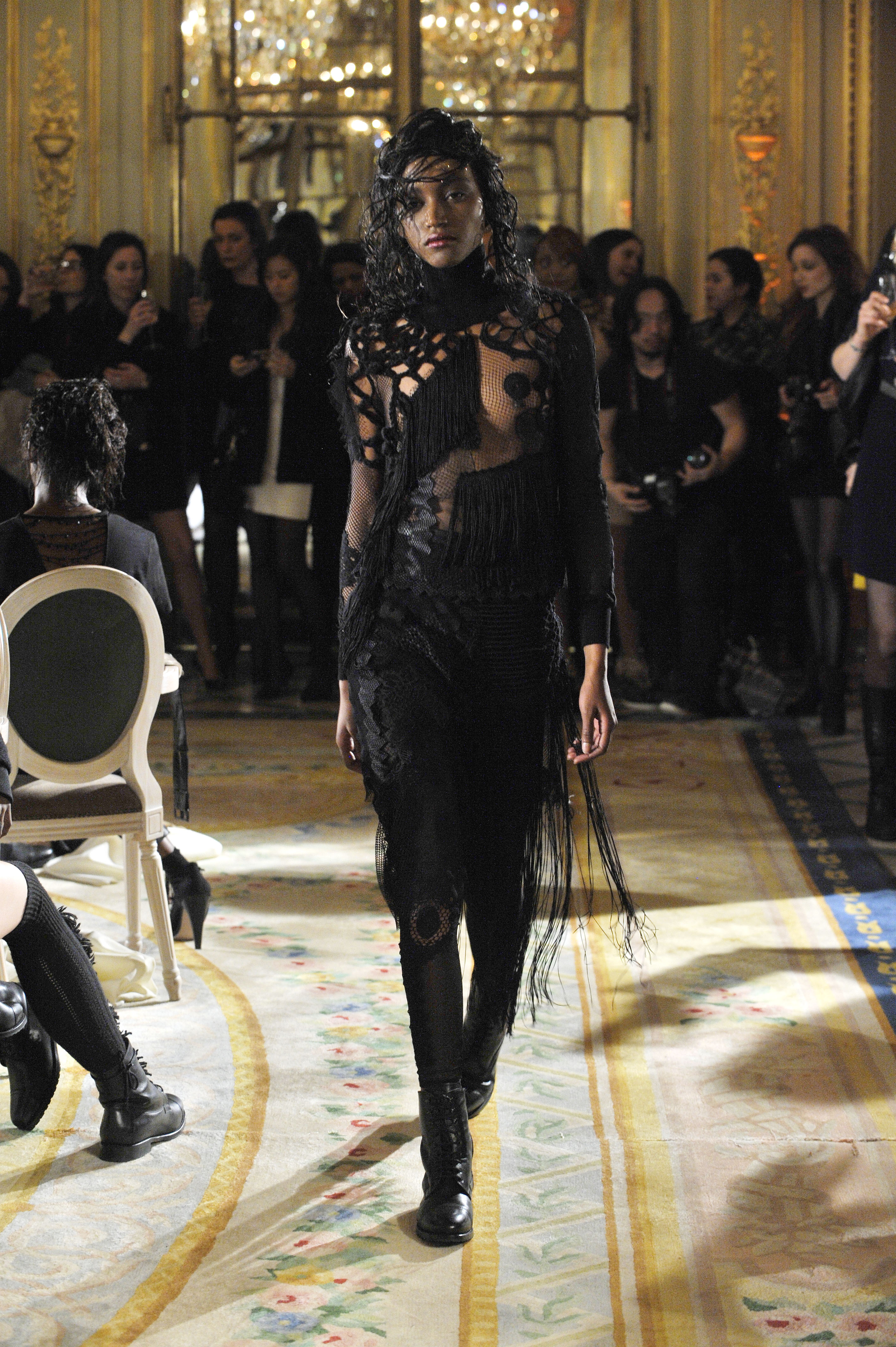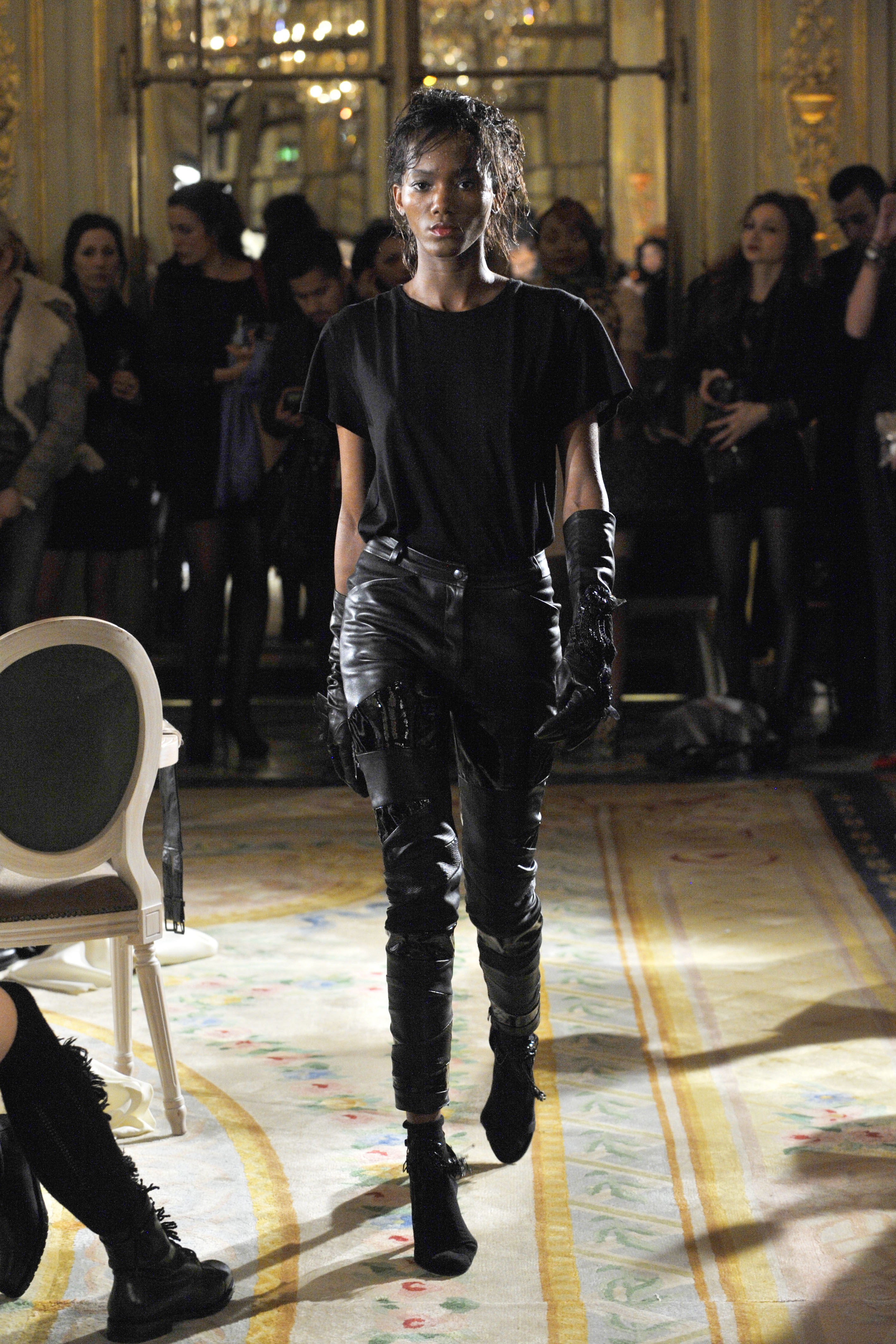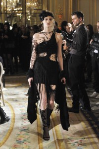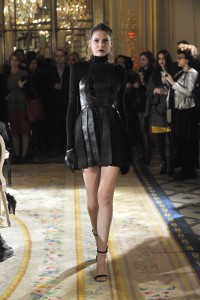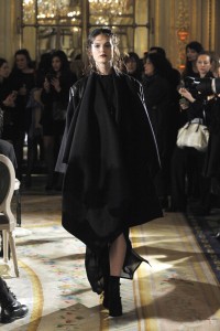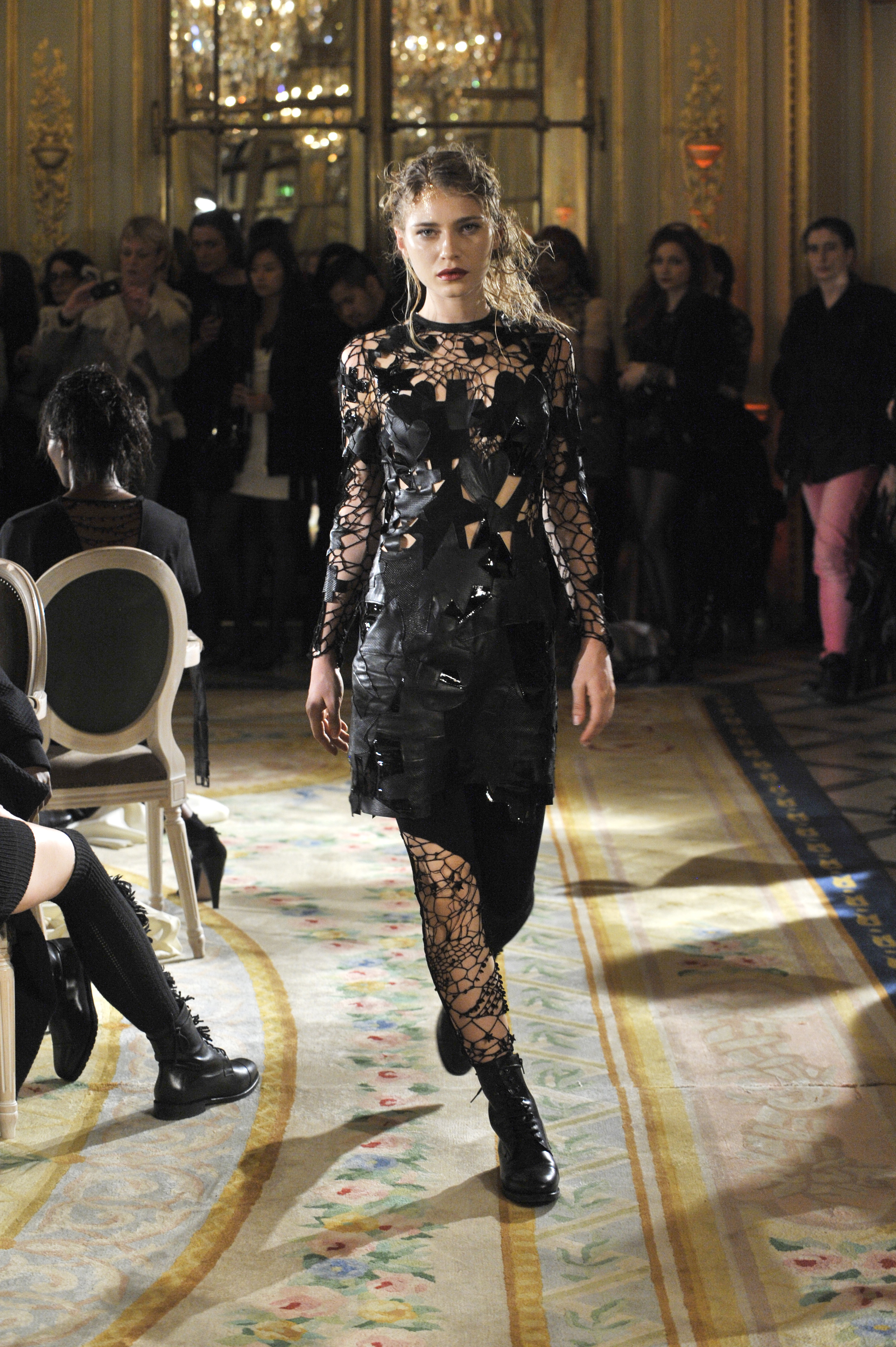 Toute l’esthétique d’Augustin Teboul se base sur un thème grunge chic. Certes, les collants sont effilés, les cheveux des mannequins sont en bataille mais l’usage et le traitement de la matière ne laissent aucun doute sur le talent d’Annelie Augustin et d’Odély Taboul. Si le look se revendique extravagant, les pièces sont plus sobres et intemporelles. C’est le mix des matières qui modernise les pièces et crée des vêtements hybrides (le cuir, le coton et la soie se retrouvent sur une seule et même robe). Pourtant, cette déstructuration du vêtement ne le rend pas importable. Les pulls sont décousus volontairement créant des motifs graphiques. Nul besoin d’imprimés ou autre artifice, le travail fait sur la matière se suffit à lui-même.