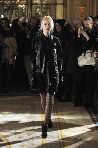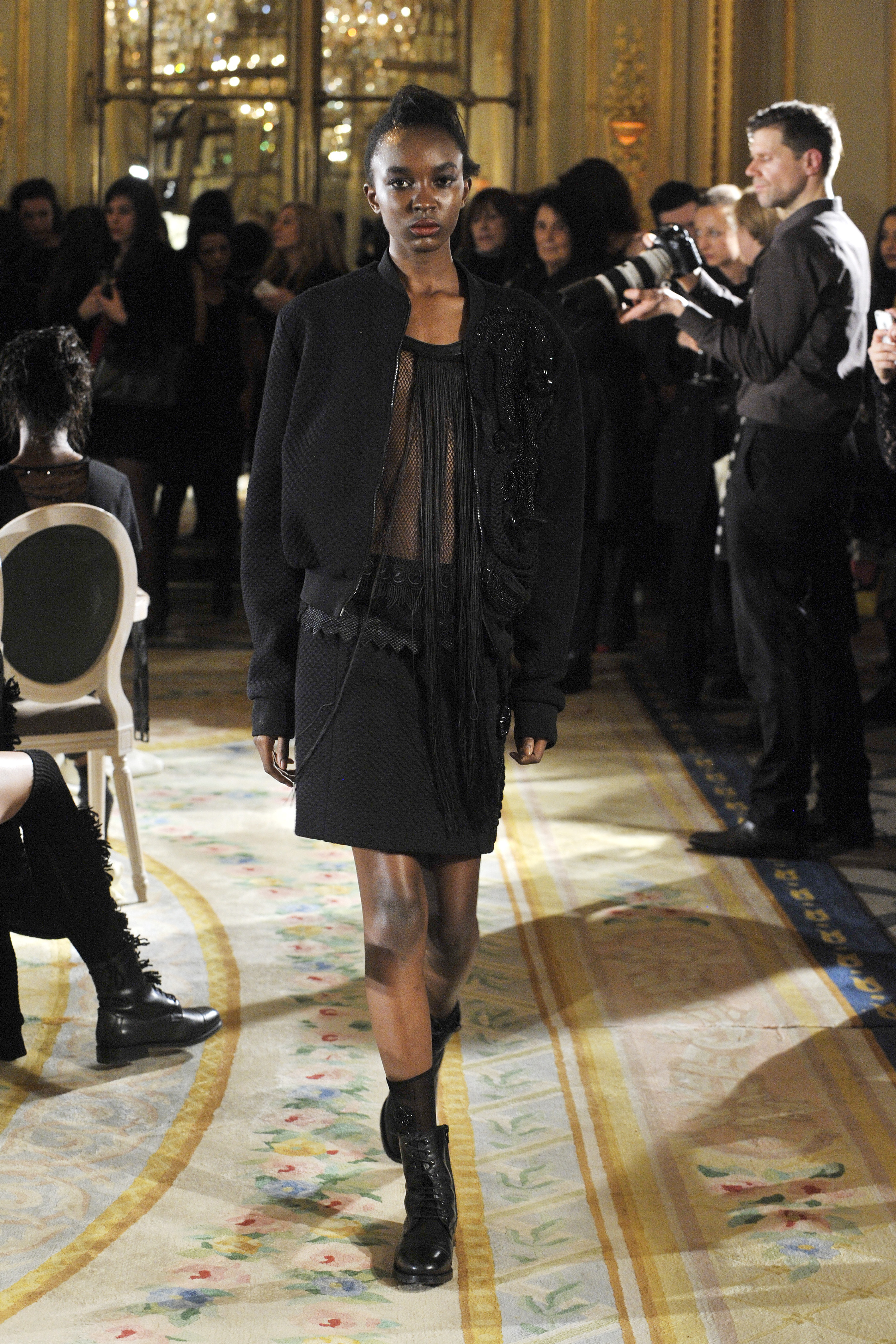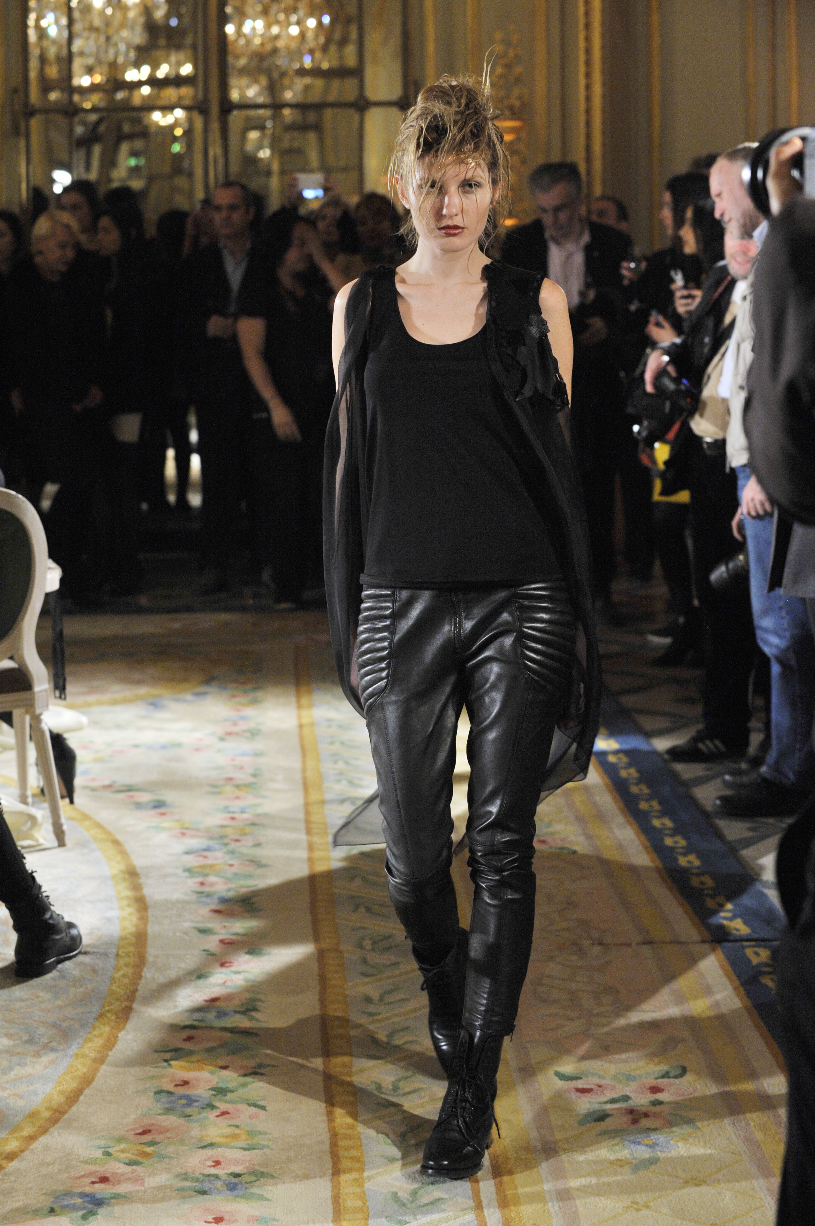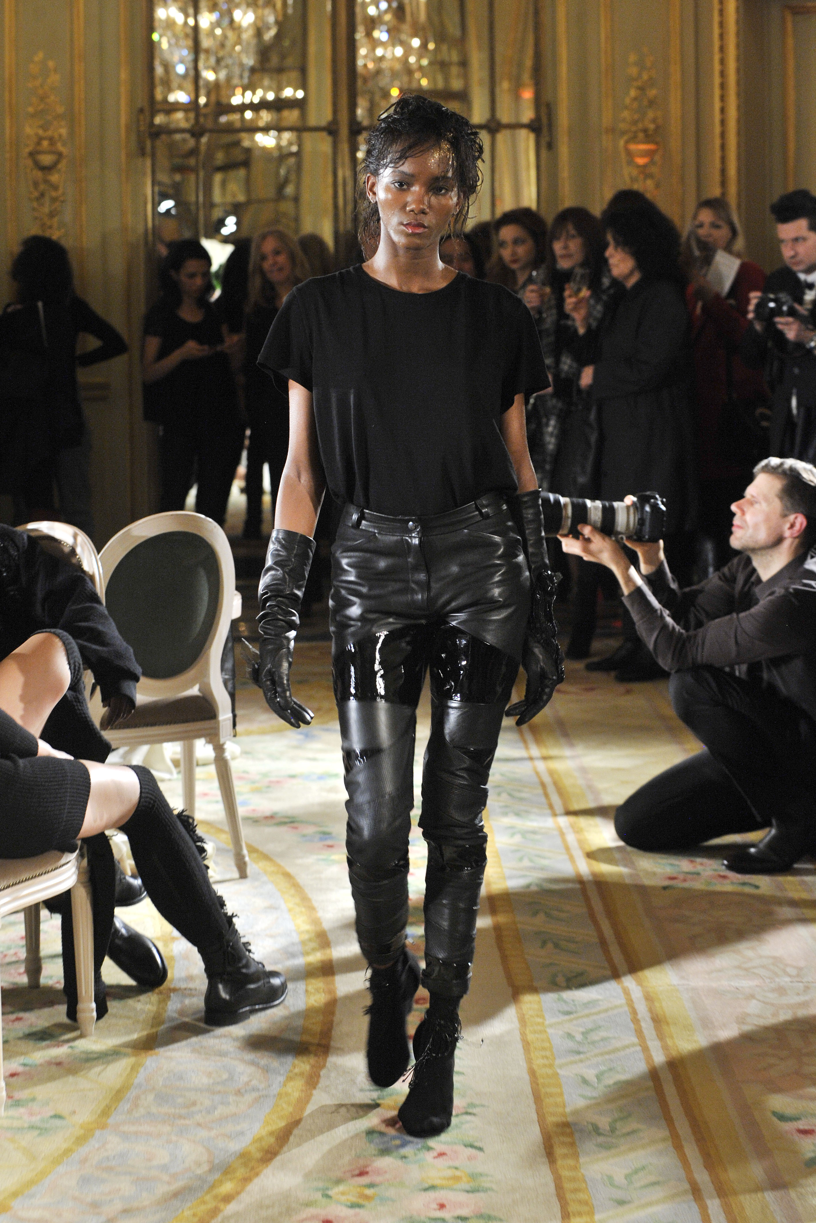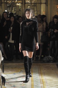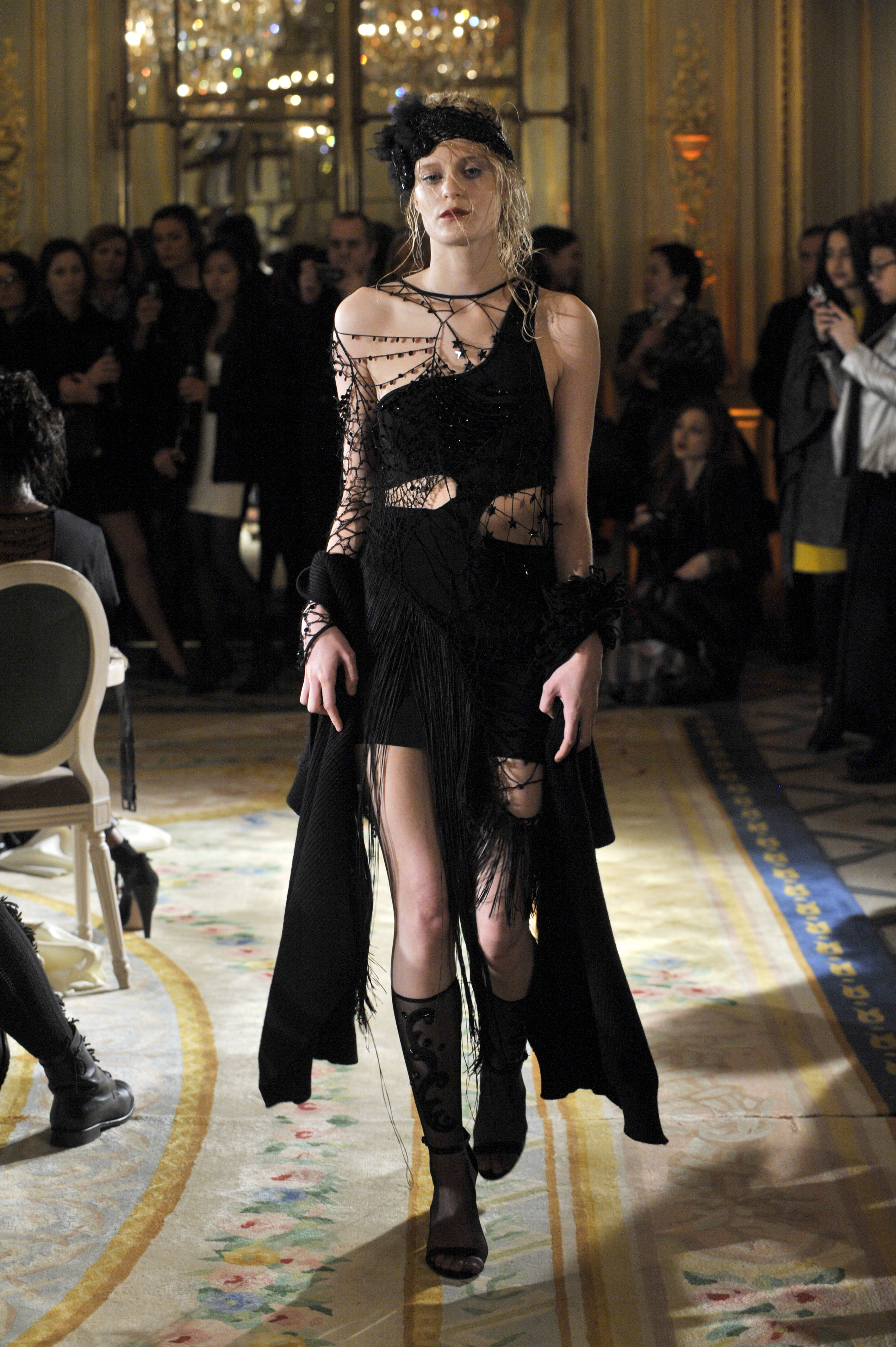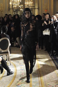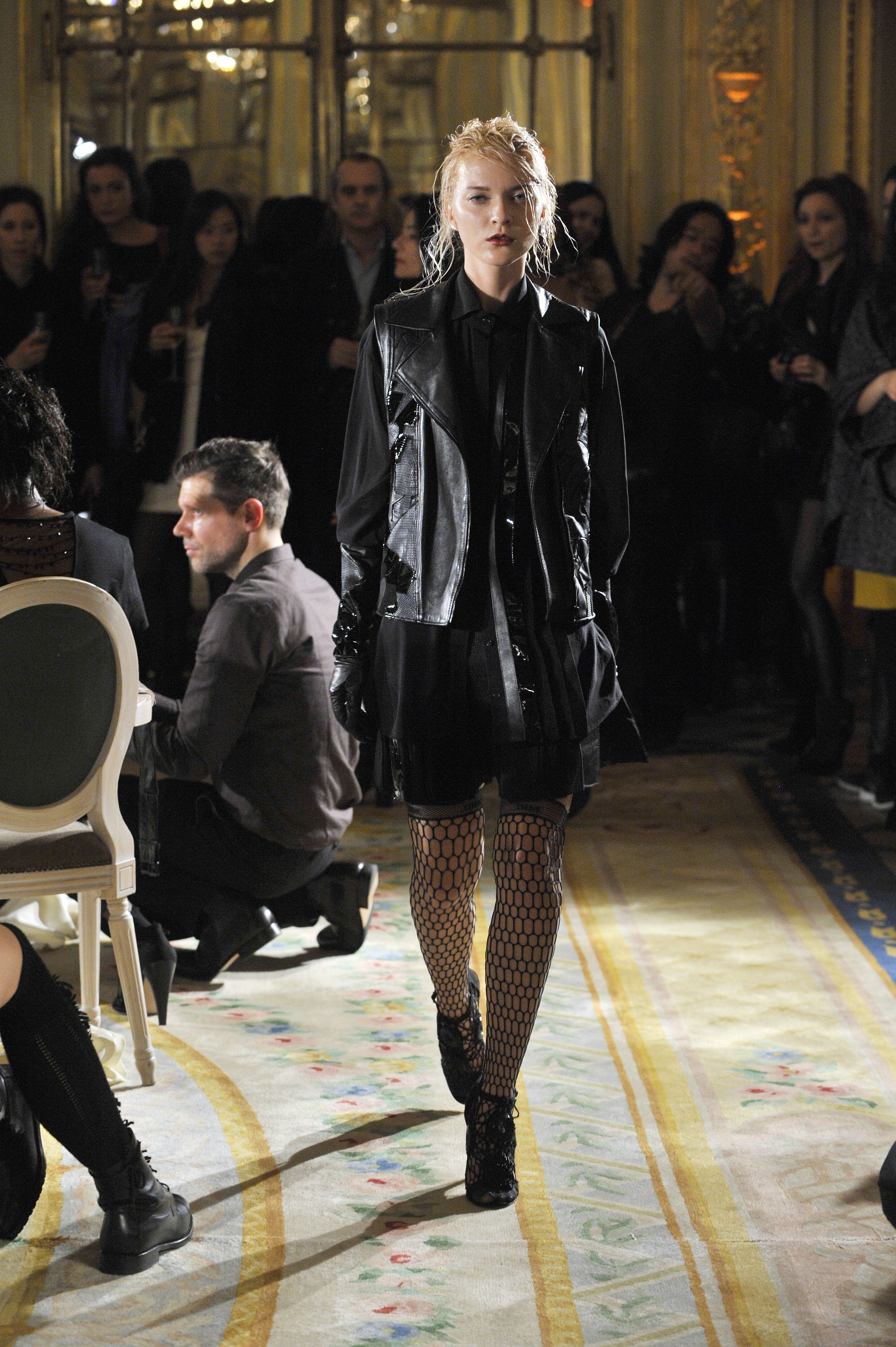 Toute l’esthétique d’Augustin Teboul se base sur un thème grunge chic. Certes, les collants sont effilés, les cheveux des mannequins sont en bataille mais l’usage et le traitement de la matière ne laissent aucun doute sur le talent d’Annelie Augustin et d’Odély Taboul. Si le look se revendique extravagant, les pièces sont plus sobres et intemporelles. C’est le mix des matières qui modernise les pièces et crée des vêtements hybrides (le cuir, le coton et la soie se retrouvent sur une seule et même robe). Pourtant, cette déstructuration du vêtement ne le rend pas importable. Les pulls sont décousus volontairement créant des motifs graphiques. Nul besoin d’imprimés ou autre artifice, le travail fait sur la matière se suffit à lui-même.
