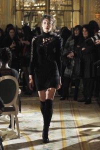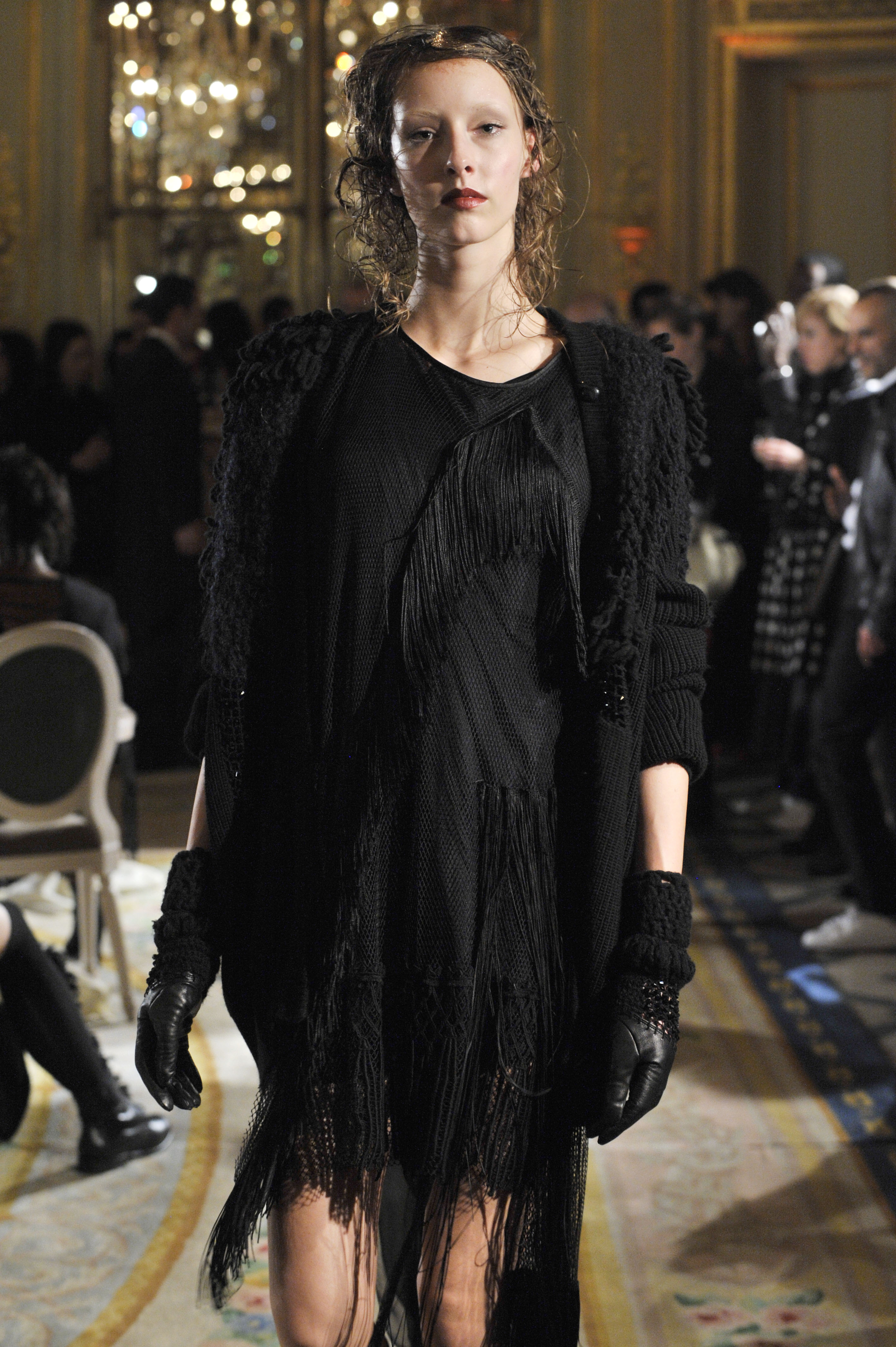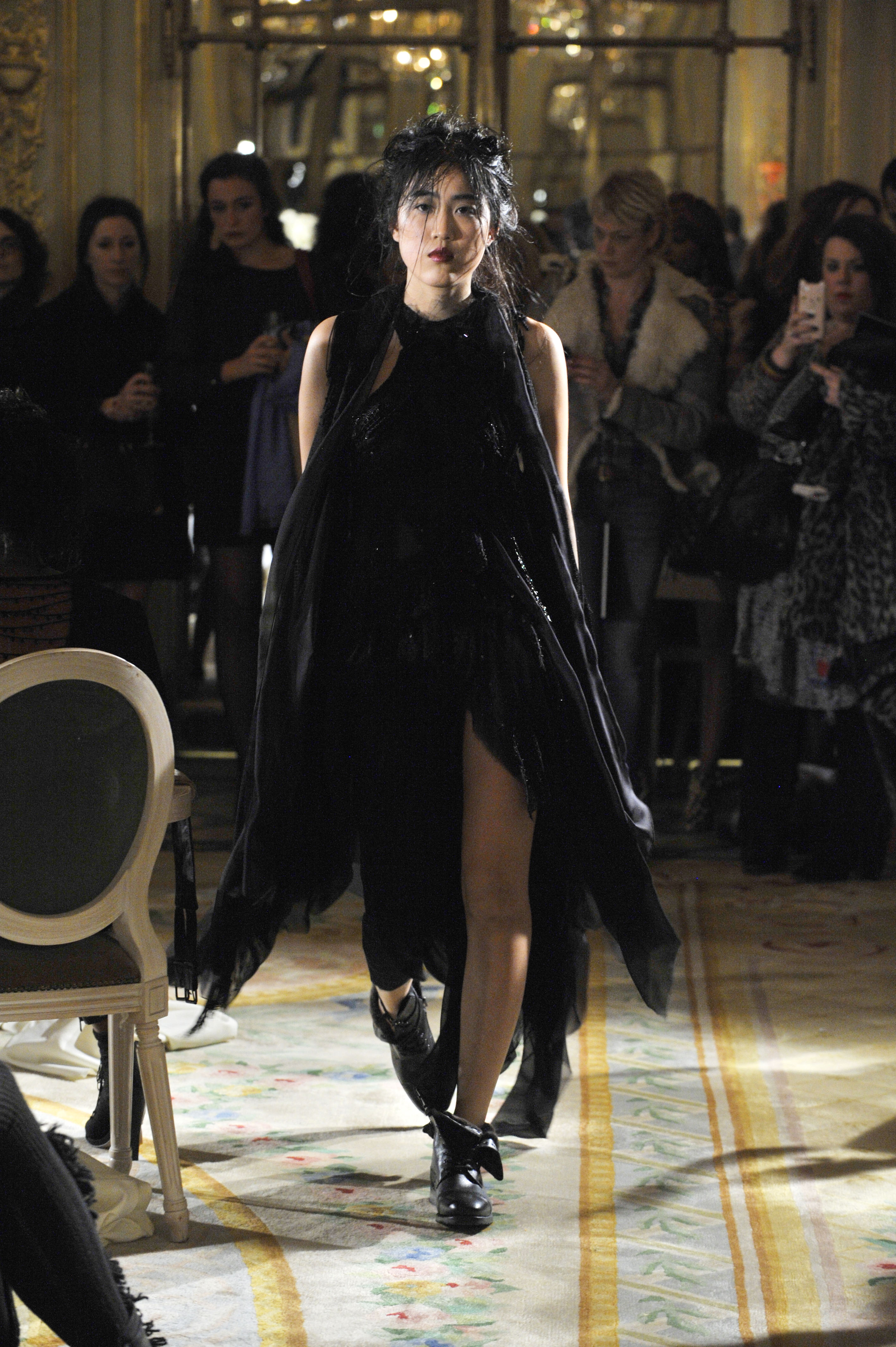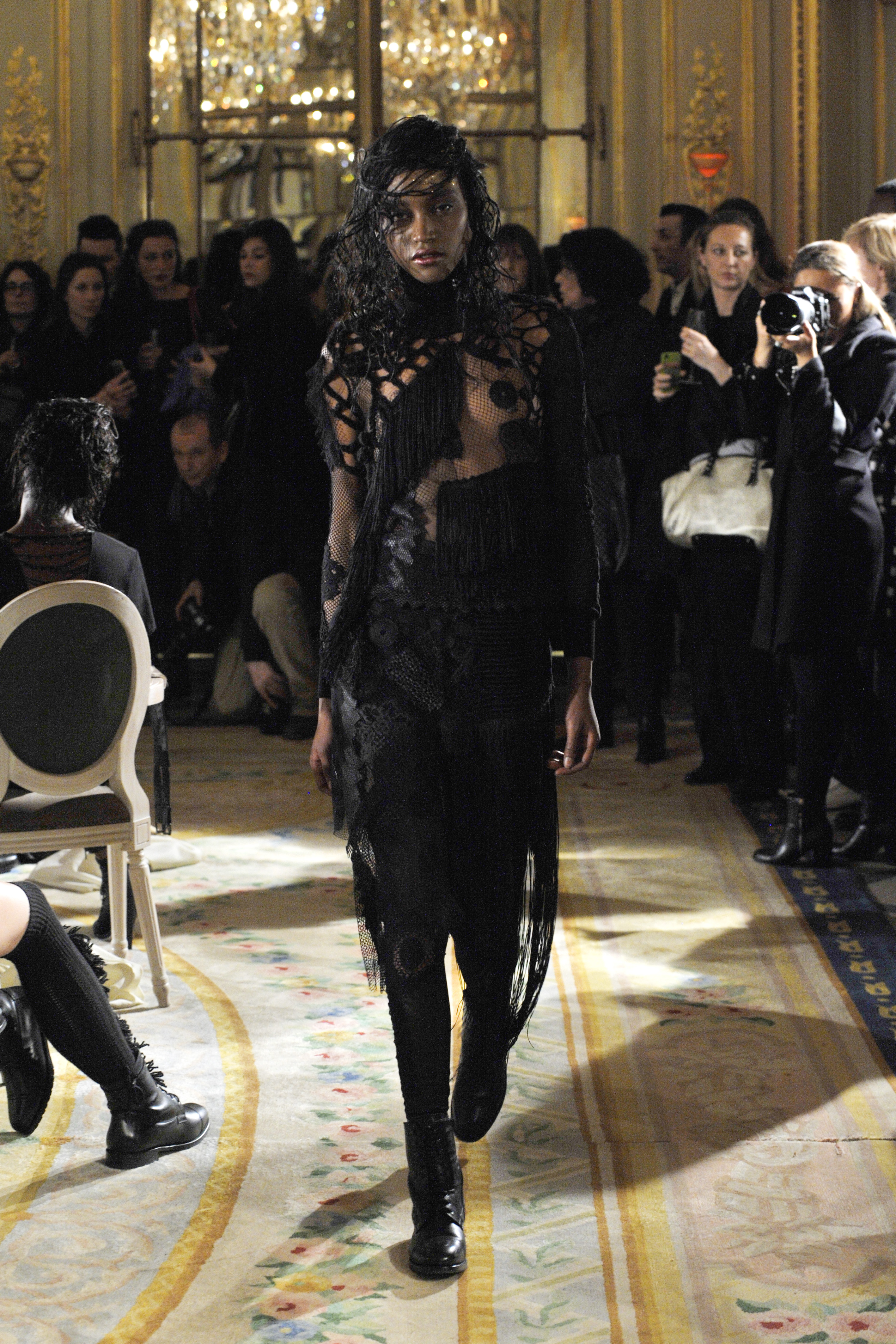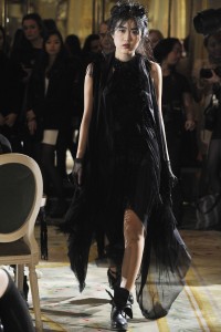 Le défilé se compose en une véritable performance : les mannequins telles des poupées sont regroupées autour d’une table avant de s’animer et de défiler. Intitulé «Sound of Black», la lligne se veut uniquement monochrome, déployant une palette de noirs mat, velouté ou brillant.