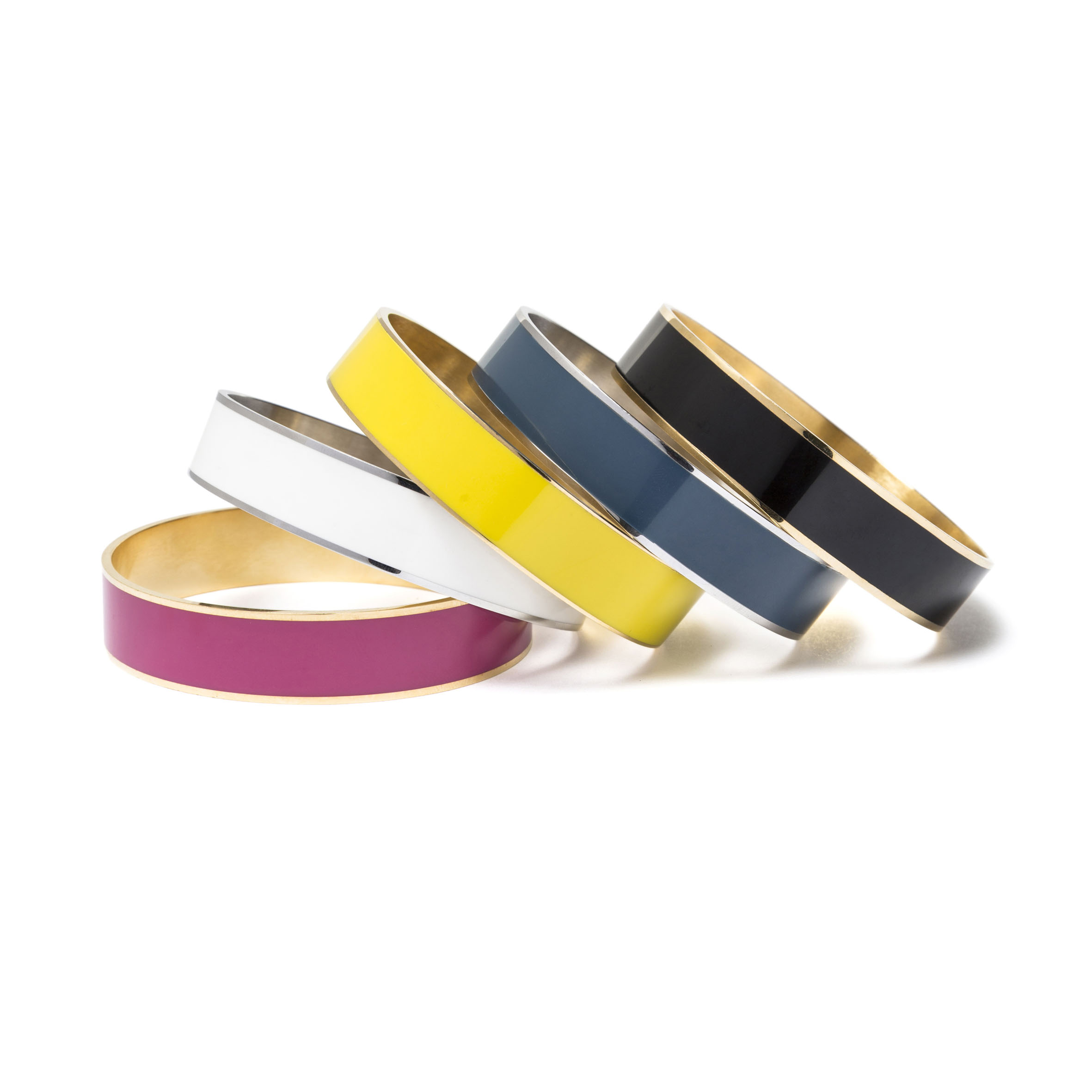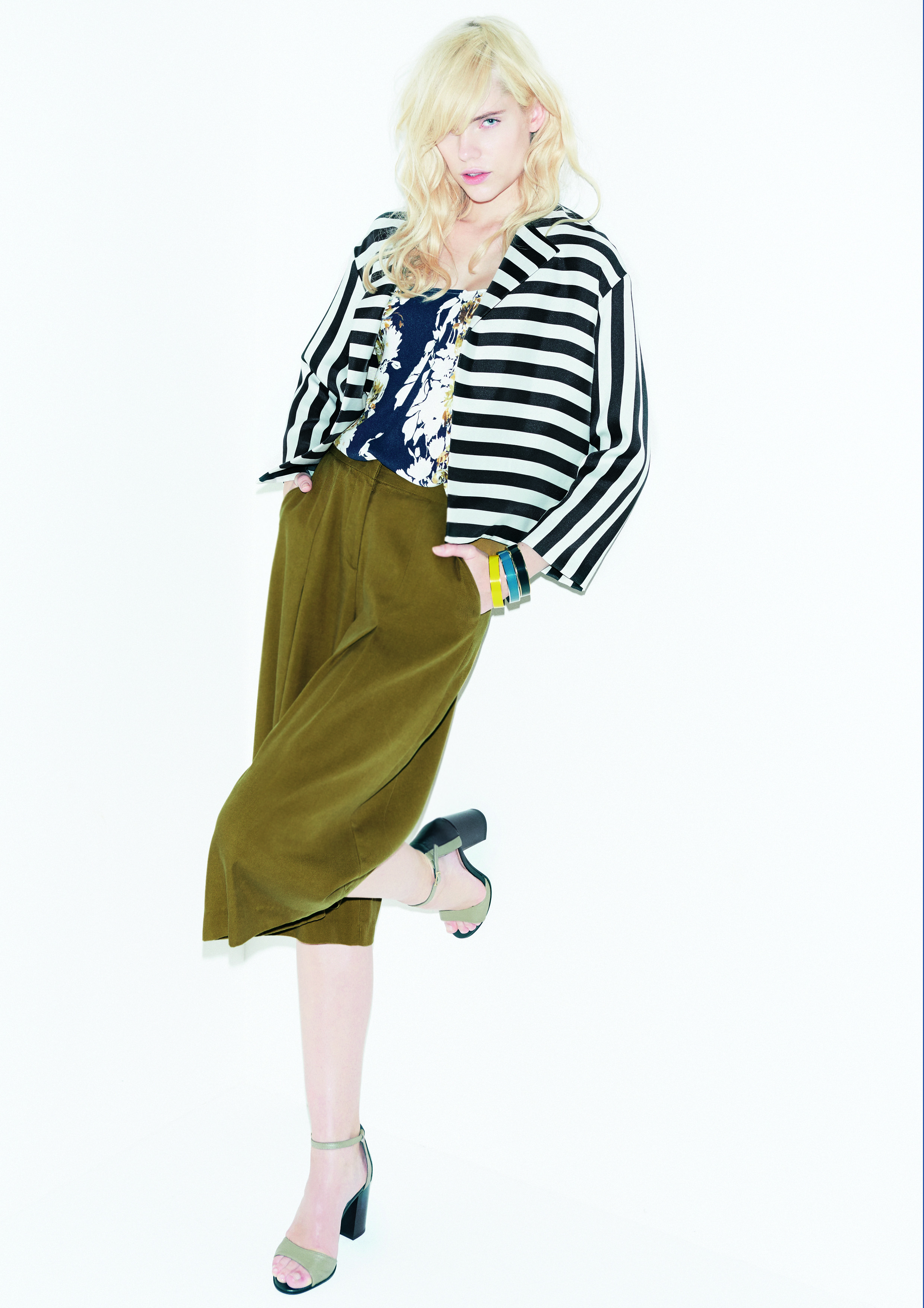 Des tenues modernes qui se complètent avec des accessoires des style vintage: des bracelets laqués multicolores et un sac polochon nude. Les Sixties sont le mot clé de cette collection, et donnent une allure d’insouciance à l’été prochain !