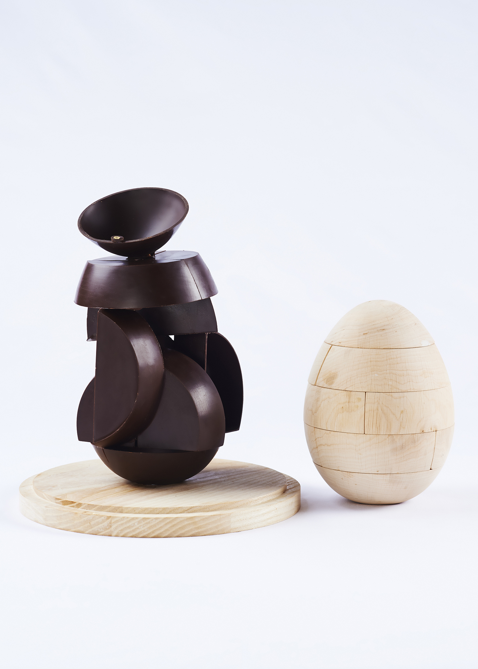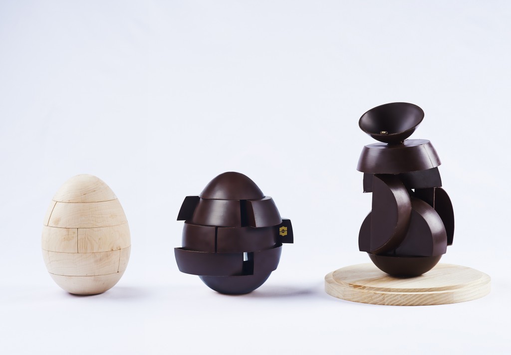 Passionné par le travail du chocolat sous toutes ses formes et débordant d’imagination, François Perret a fait appel à un tourneur sur bois afin de créer des emboitements parfaits. Celui-ci a façonné un prototype sur-mesure permettant ensuite au Chef de réaliser ses propres moules. Ainsi, chaque pièce s’assemble délicatement et harmonieusement. Les enfants, quant à eux, pourront réinventer leur propre œuf selon leur créativité et fantaisie !