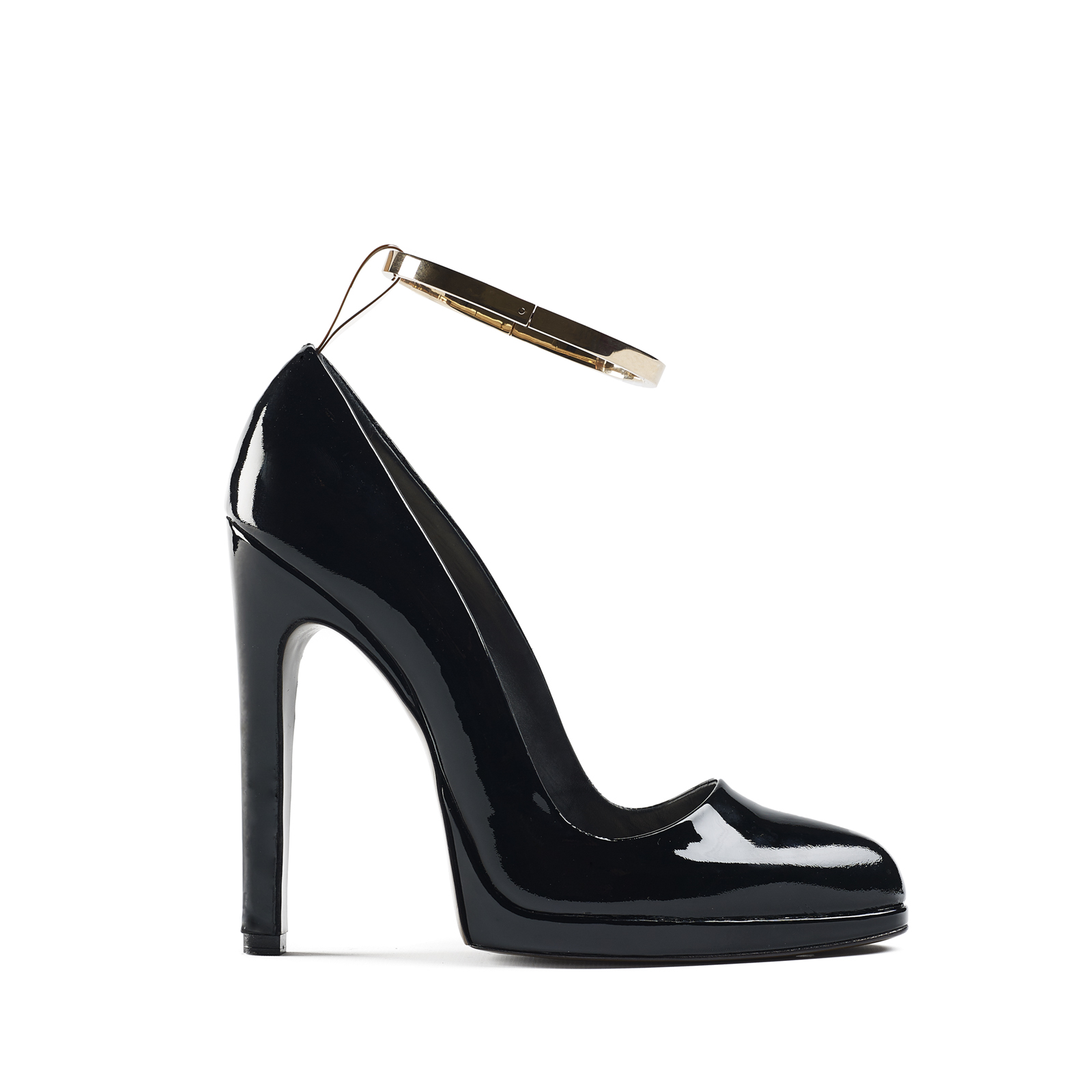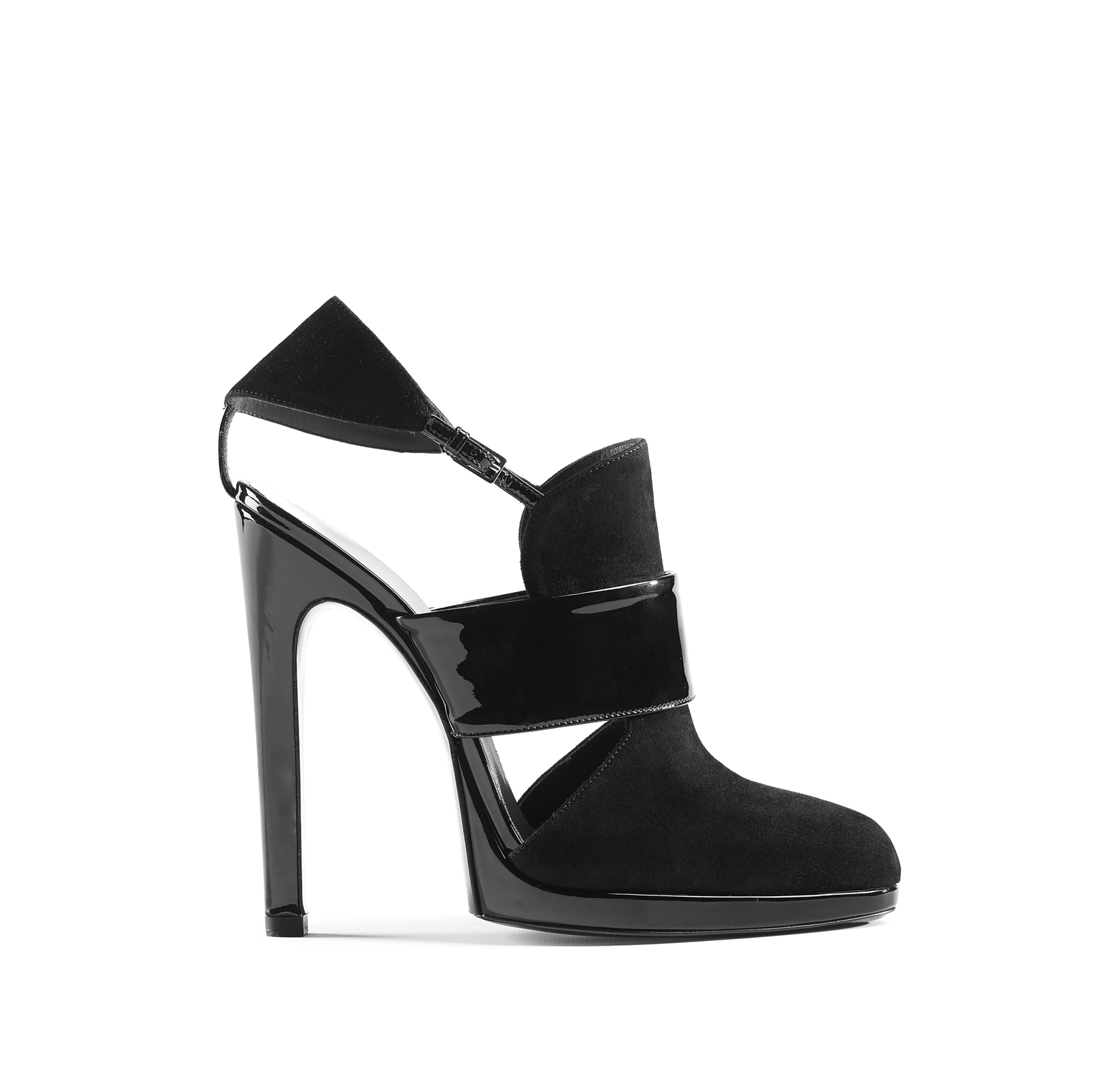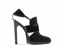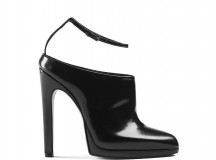 FETISH. Des inspirations néo-bondage se mêlent au ‘savoir-faire’ du bottier. Il s’agit d’un hommage aux talons vertigineux avec une approche architectonique très nette qui débouche sur la création de bottes hautes et pump audacieuses. Choisissez l’effet ‘tuxedo’ qui s’associe parfaitement au daim noir et au cuir de veau verni noir, ou une touche de cuir Tejus pour les mules hautes, les mules et les sandales fermées. Pour les chaussures de soirée de la femme déterminée, le styliste propose à nouveau son approche fetish pour le pied et la chaussure.