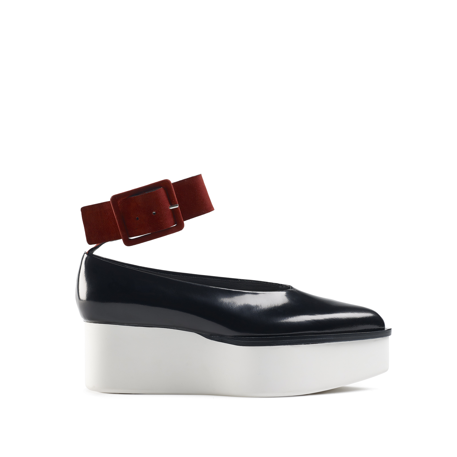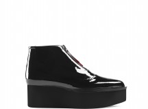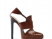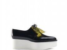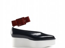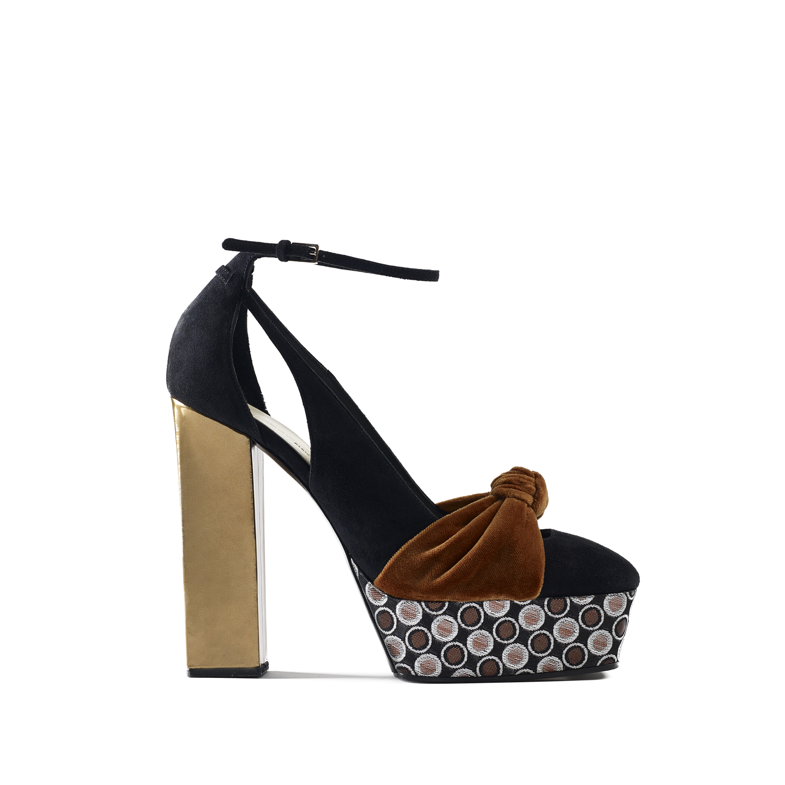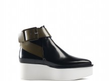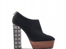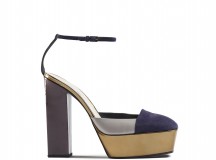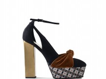 IDOLE. Design trapézoïdal, plateformes hautes et talons carrés volumineux, marquent cette collection pour le jour et le soir, typique du marché de Camden à Londres réputé pour son côté underground, et qui évoque les années 70. Toute une mosaïque de styles accentuée par les matériaux précieux et exclusifs.