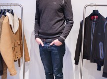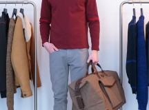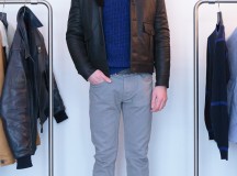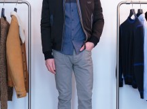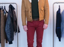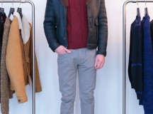 Beaucoup de cuirs, nappa, agneau plongé, nubuck, nubuck ciré ou encore peau lainée, parfois associés au nylon et au drap de laine pour un aspect graphique et contemporain. On sait l’attention portée par la marque aux matières, toujours de haute qualité, et aux poids de celles-ci, des mailles ultra légères, des cuirs souples ou raides. Quelques chemises ajustées, de flanelle, chambray, popeline, oxford, des polos en jersey lourd ou piqué de coton,  des T-shirts jouant les figures acrobatiques, et des pantalons en gabardine de coton.