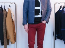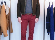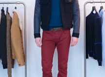 Les couleurs empruntent encore à l’univers de l’aviation, les bordeaux, kaki, acier, bleu gris ou soutenu, chocolat et noir profond composent une palette nuancée à  jouer en monochrome ou combinaisons subtiles. La simplicité prime encore avec ces tons de tôle et de peinture qui s’accordent avec évidence. Parfois bicolores, les chemises affirment la construction du vêtement, les pulls brouillent les pistes avec des mélanges de fils. Le corps devient toile sur laquelle se compose la silhouette comme autant de principes graphiques, de jeux de lignes, d’aplats de couleur, de dynamiques dans le mouvement. Des lignes surlignent encore toutes ces compositions et courent sur les vêtements comme sur le corps.
