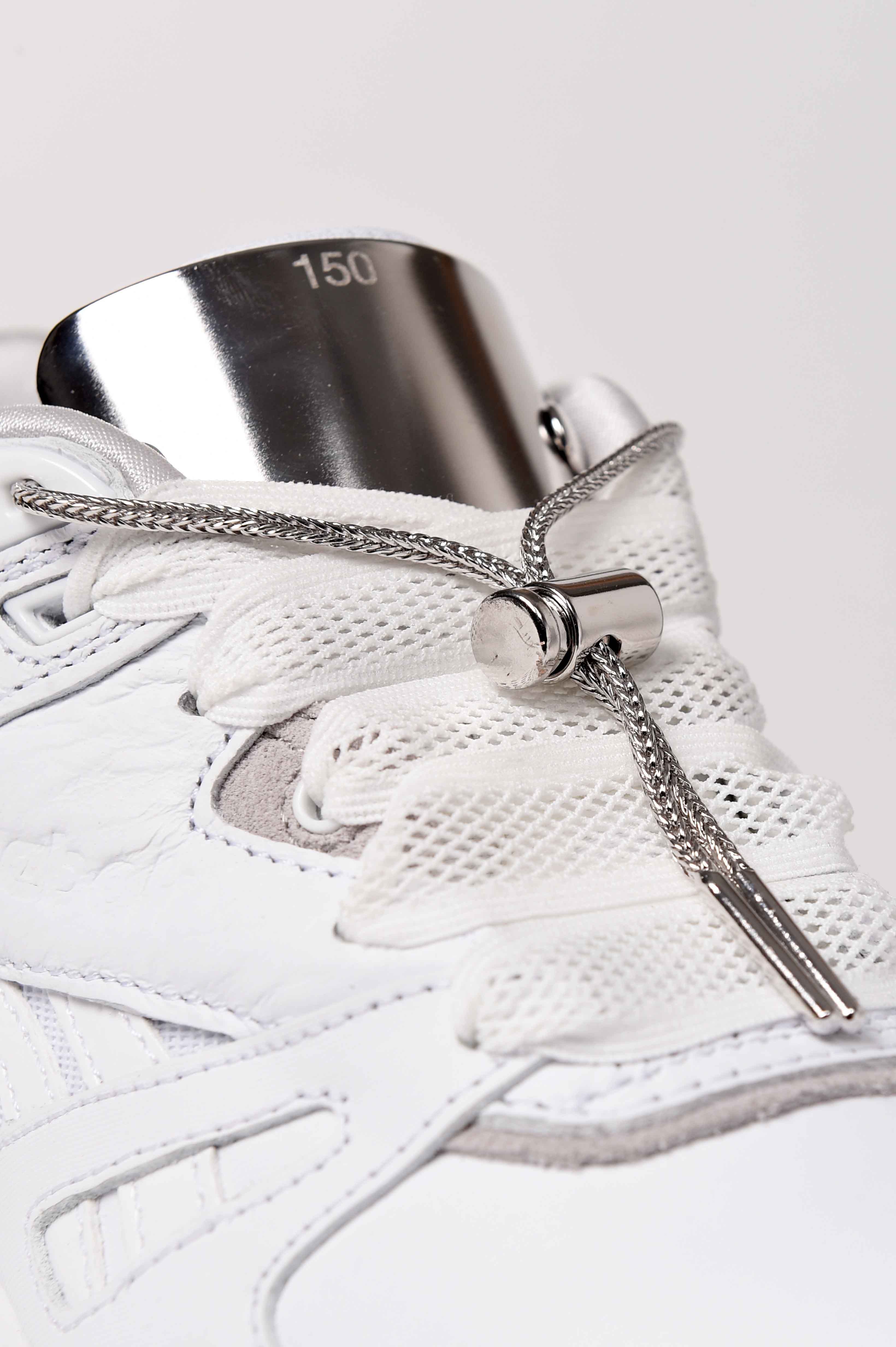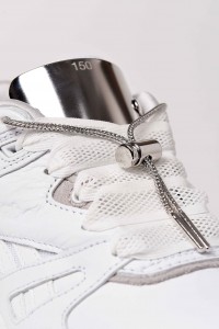 De délicats lacets en ruban résille élastique blancs (technique empruntée à la fabrication de dessous chics), terminés à l’intérieur de la chaussure par un bijoux plaqué argent, permettent d’enfiler la basket en un clin d’œil !