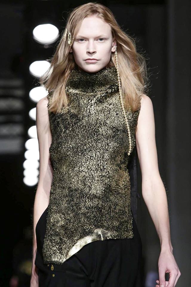 Précieux et non précieux, pulvériser de l’or sur une peau lainée, froisser une soie et l’imprimer de feuilles d’or, utiliser des épingles à nourrice comme des broderies ou des éclaboussures de peintures cousues d’or, envelopper bien au chaud dans les longueurs de laine ou juste jeter par-dessus l’épaule,