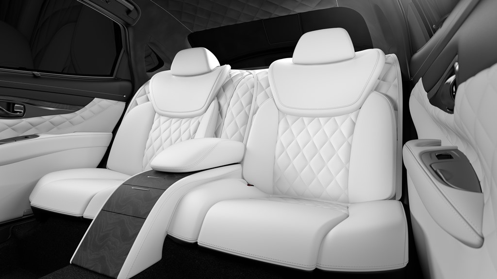 L’intérieur du Q70L Bespoke Edition s’inspire de l’habitacle des derniers concept cars de la marque. La version spéciale du Q70L, à l’empattement plus long de 150 mm, se caractérise par ses quatre luxueux sièges recouverts de cuir fin matelassé blanc. Cette étude vise à réduire l’écart existant entre l’aménagement intérieur des modèles de série et ceux très luxueux des concept cars.