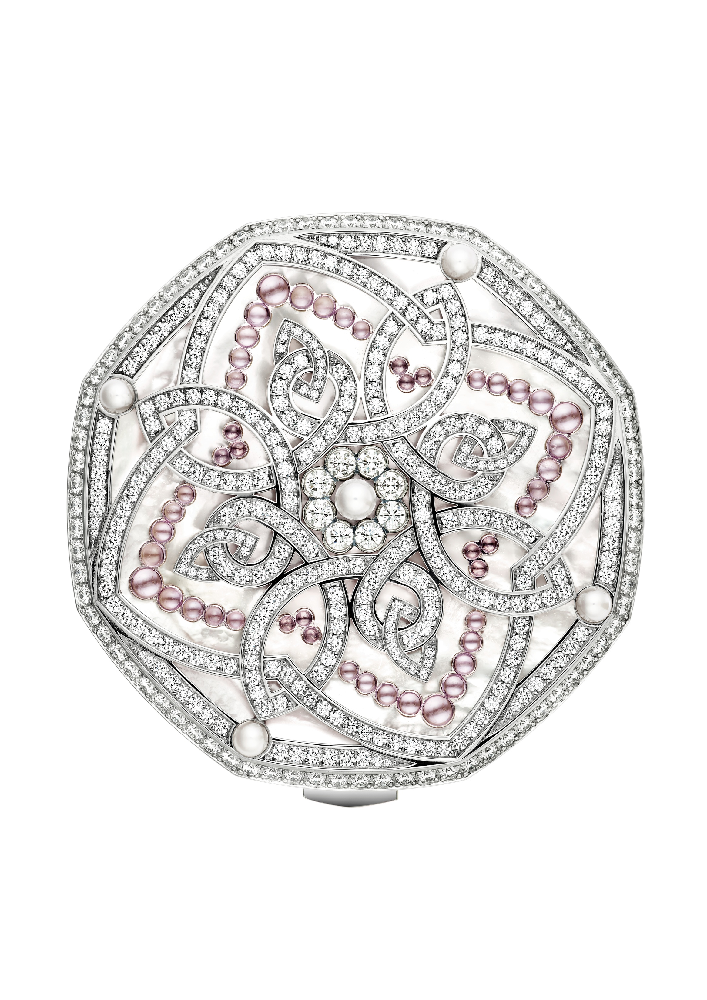 Tout l’esprit de la Maison Harry Winston s’exprime dans ce luxe de détails époustouflants. Paré de 752 diamants, 48 cabochons saphir roses et 5 perles rosées, ce garde-temps de poche est un véritable objet de désir.
