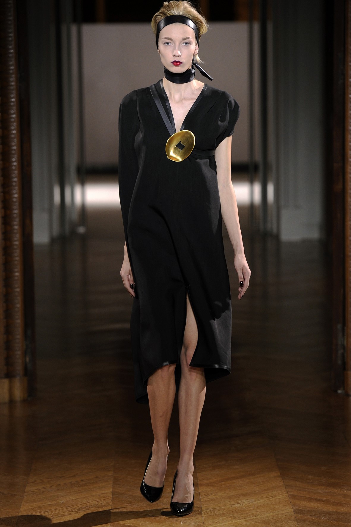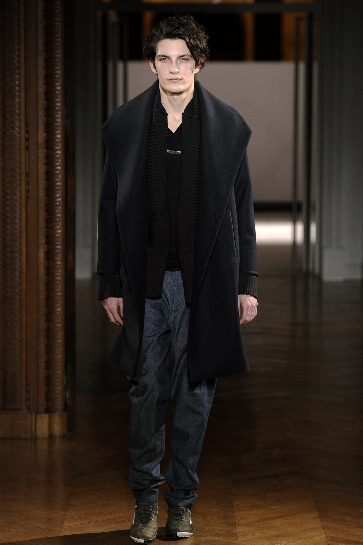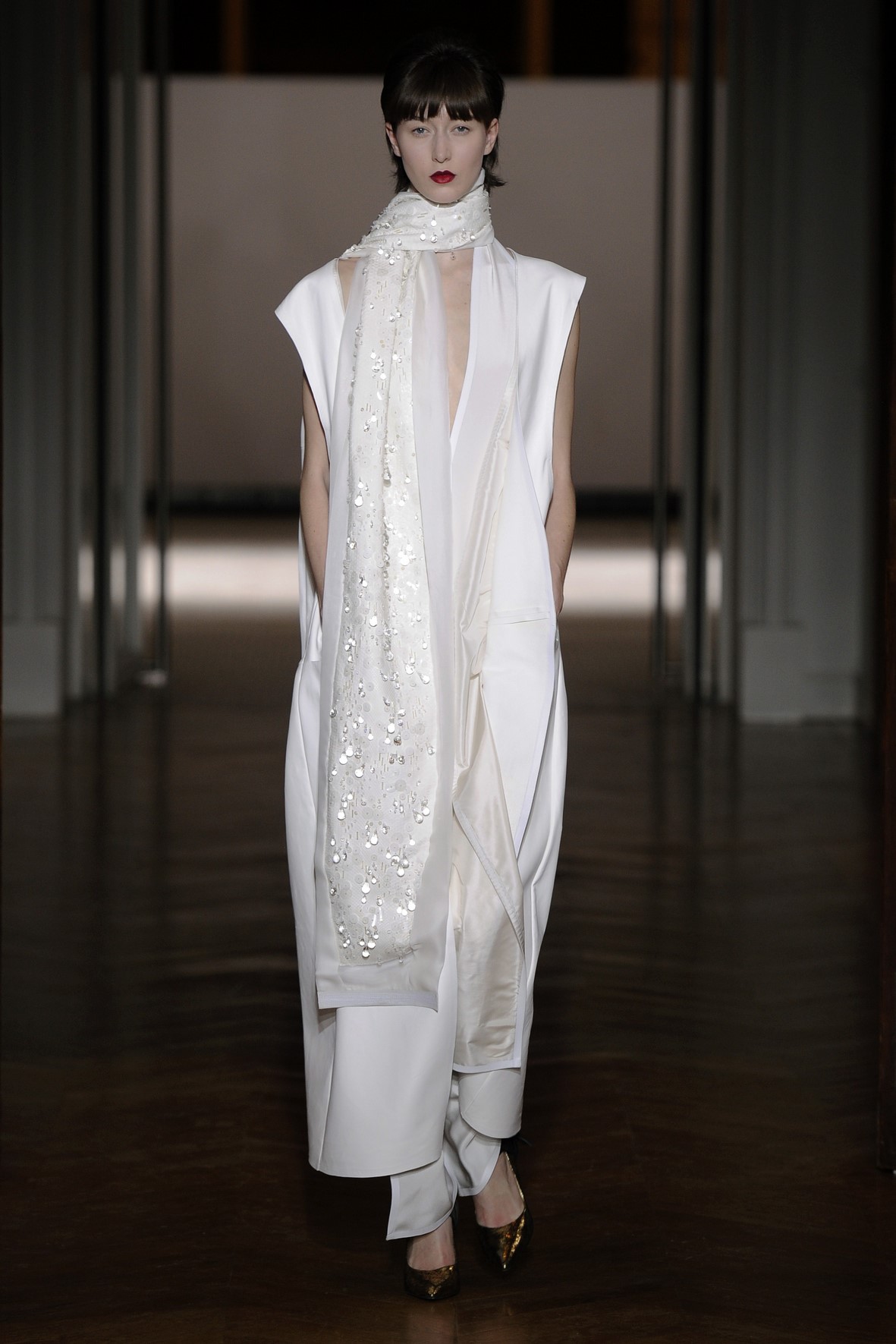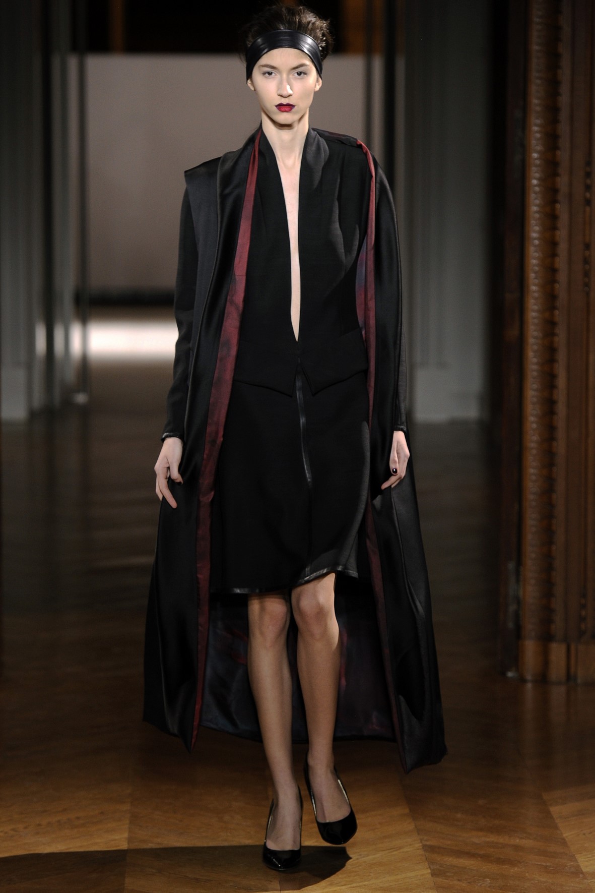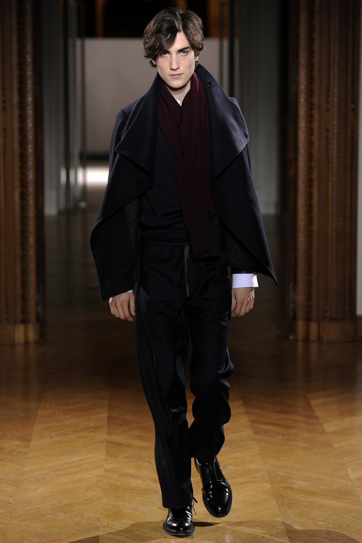 Une collection très ondoyante constituée de formes enveloppantes et souples: les manteaux se portent avec nonchalance, comme des peignoirs, les longues robes-fourreau très largement fendues comme des déshabillés de soie, les larges kimonos du soir se portent ouverts, les pantalons immenses, fluides…