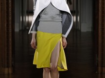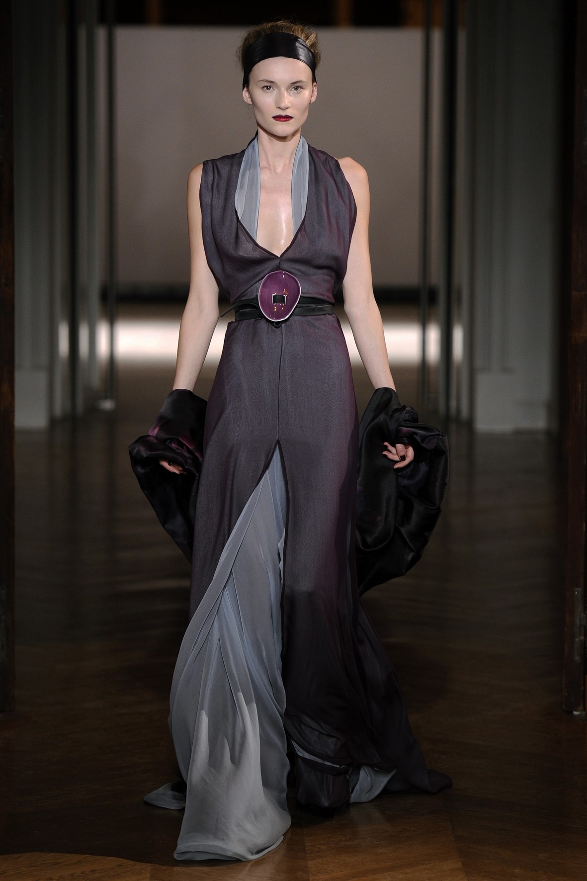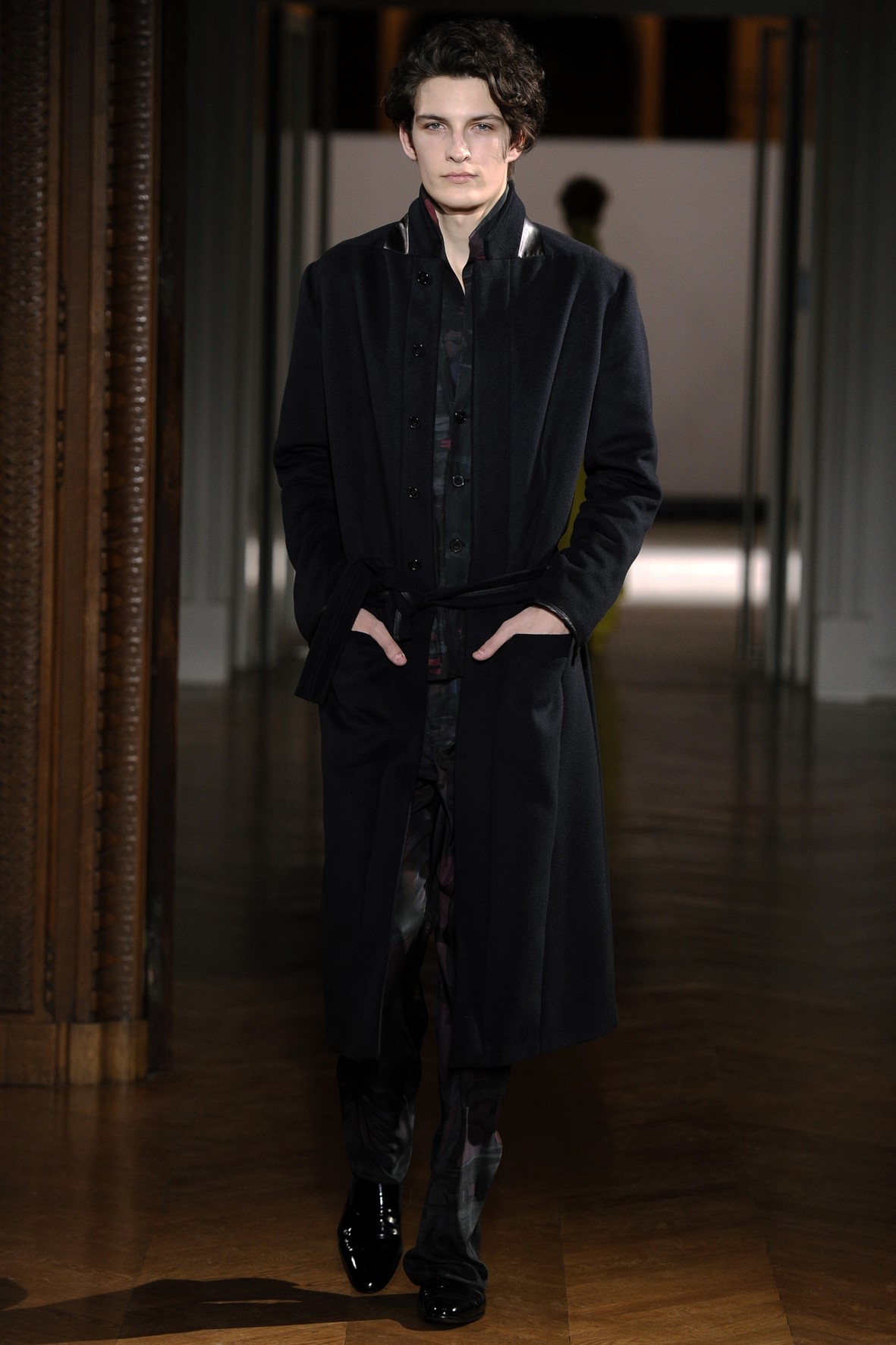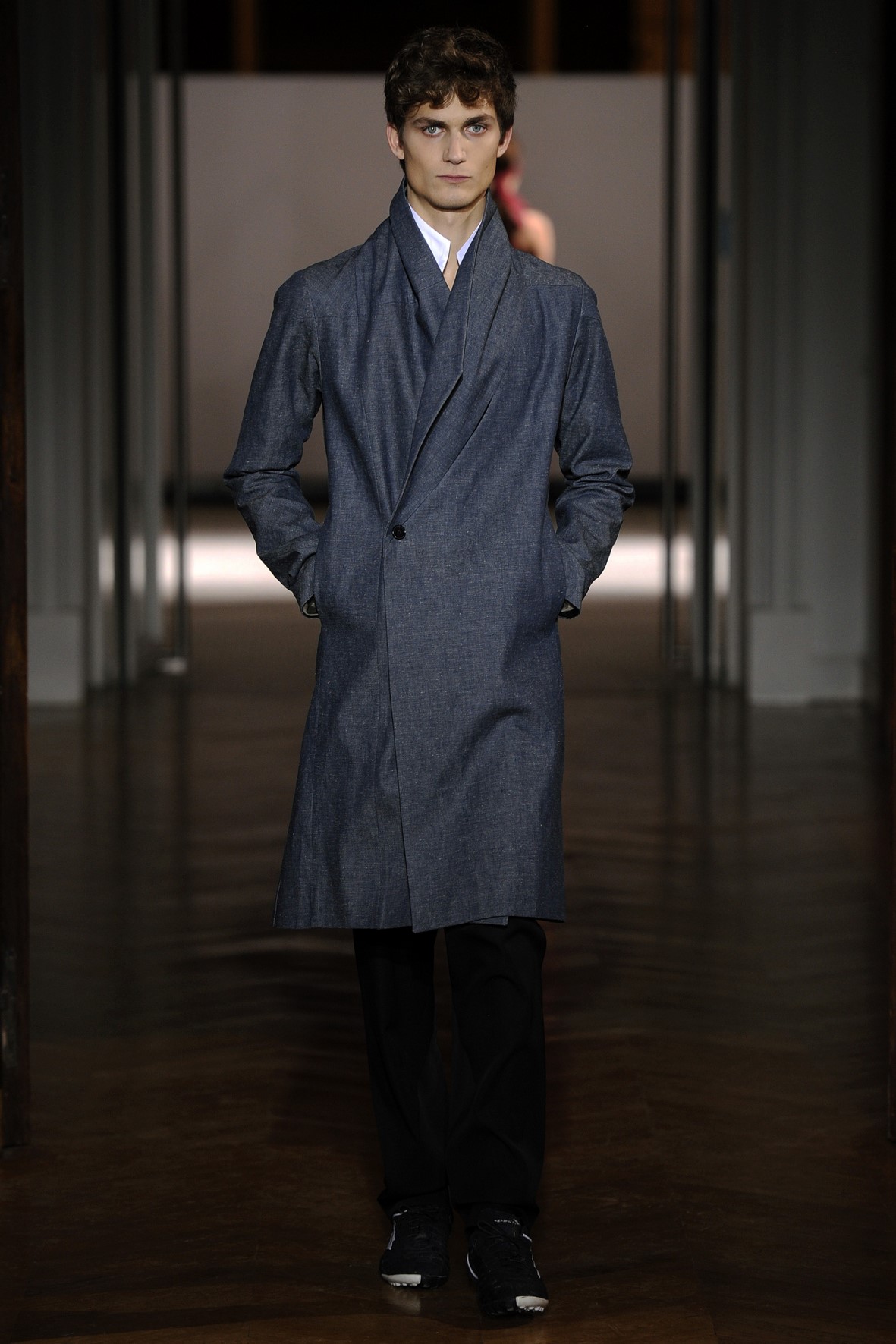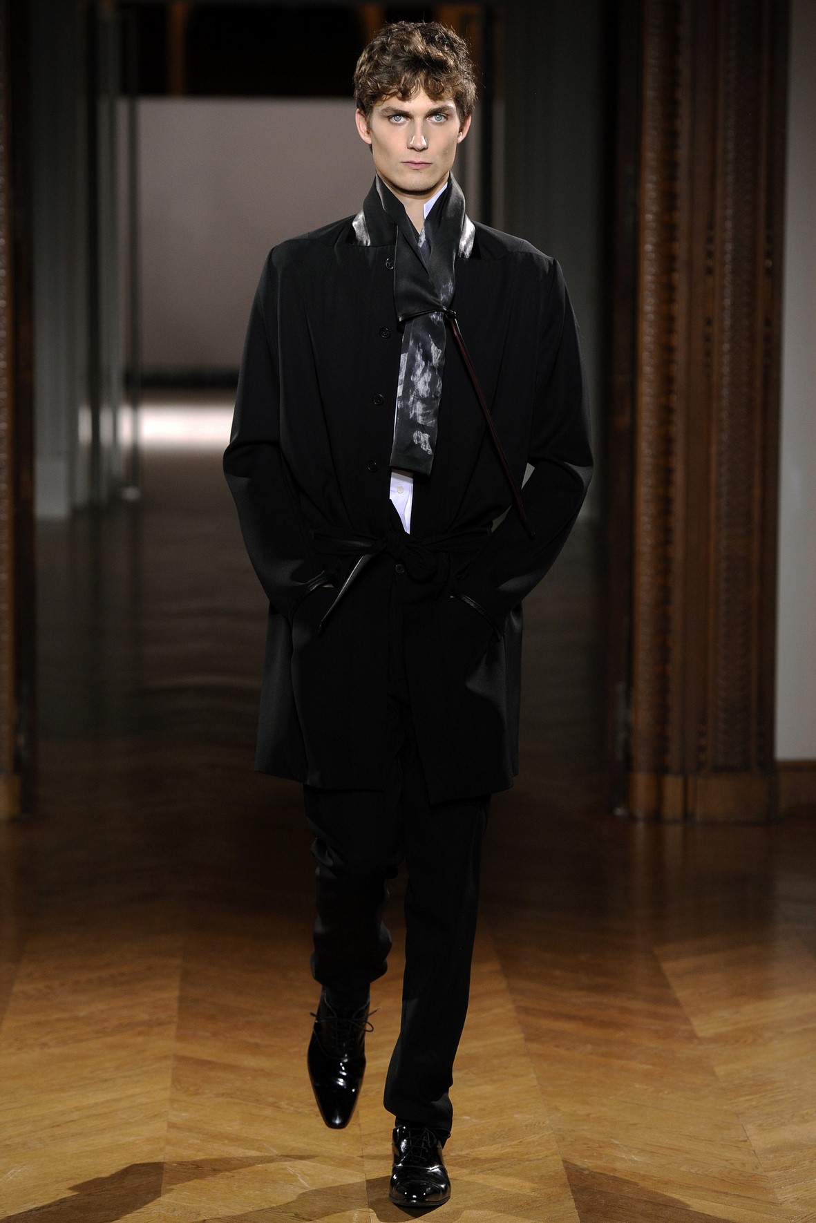 Une collection très ondoyante constituée de formes enveloppantes et souples: les manteaux se portent avec nonchalance, comme des peignoirs, les longues robes-fourreau très largement fendues comme des déshabillés de soie, les larges kimonos du soir se portent ouverts, les pantalons immenses, fluides…