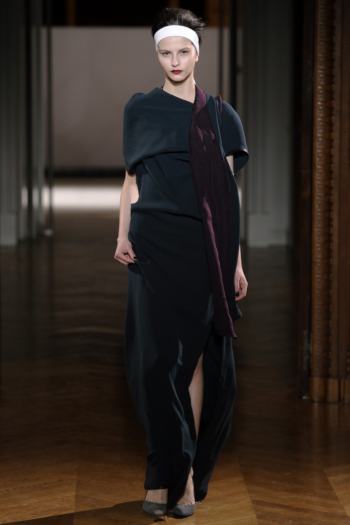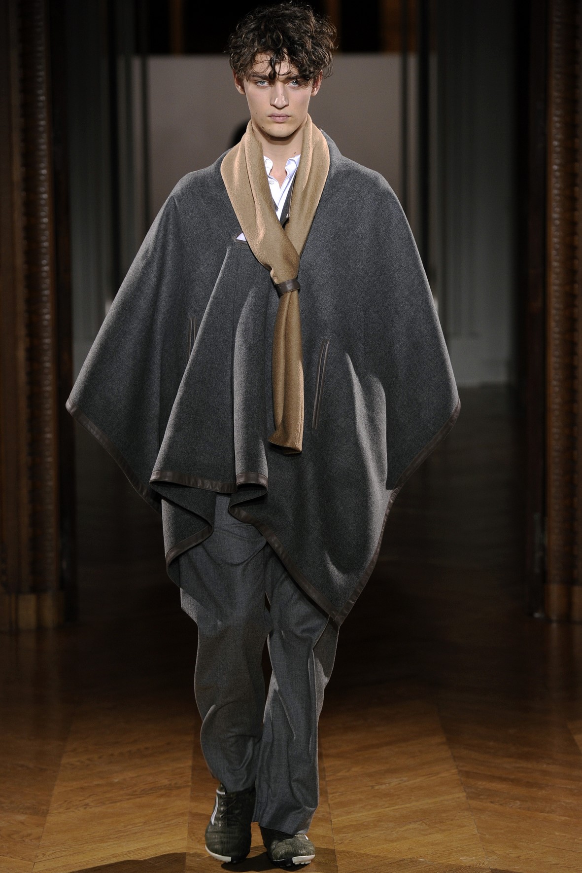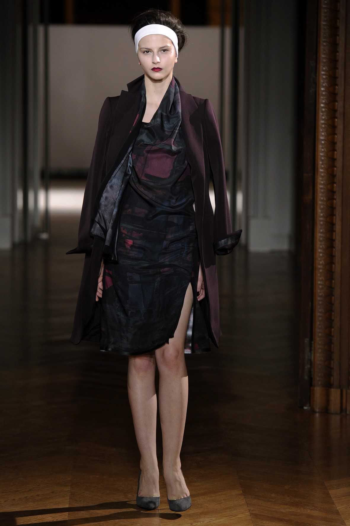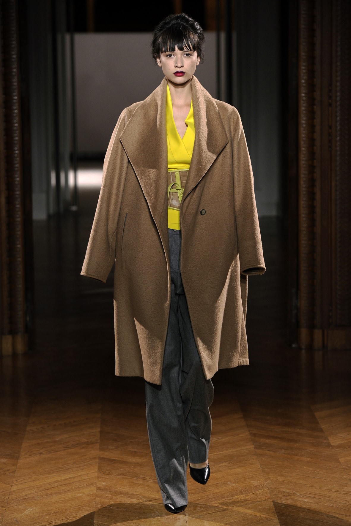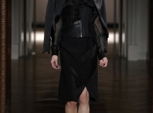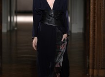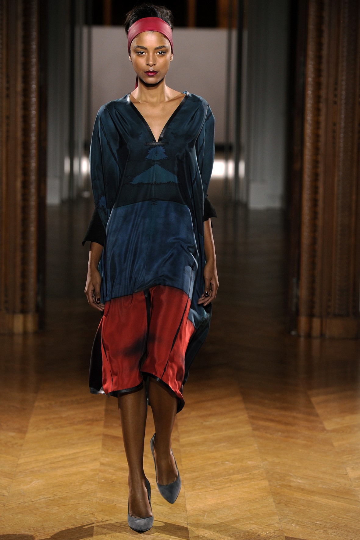 Une collection très ondoyante constituée de formes enveloppantes et souples: les manteaux se portent avec nonchalance, comme des peignoirs, les longues robes-fourreau très largement fendues comme des déshabillés de soie, les larges kimonos du soir se portent ouverts, les pantalons immenses, fluides…