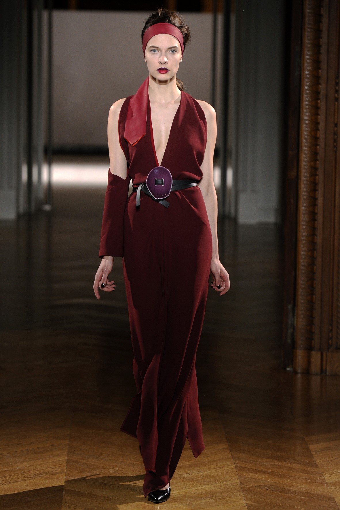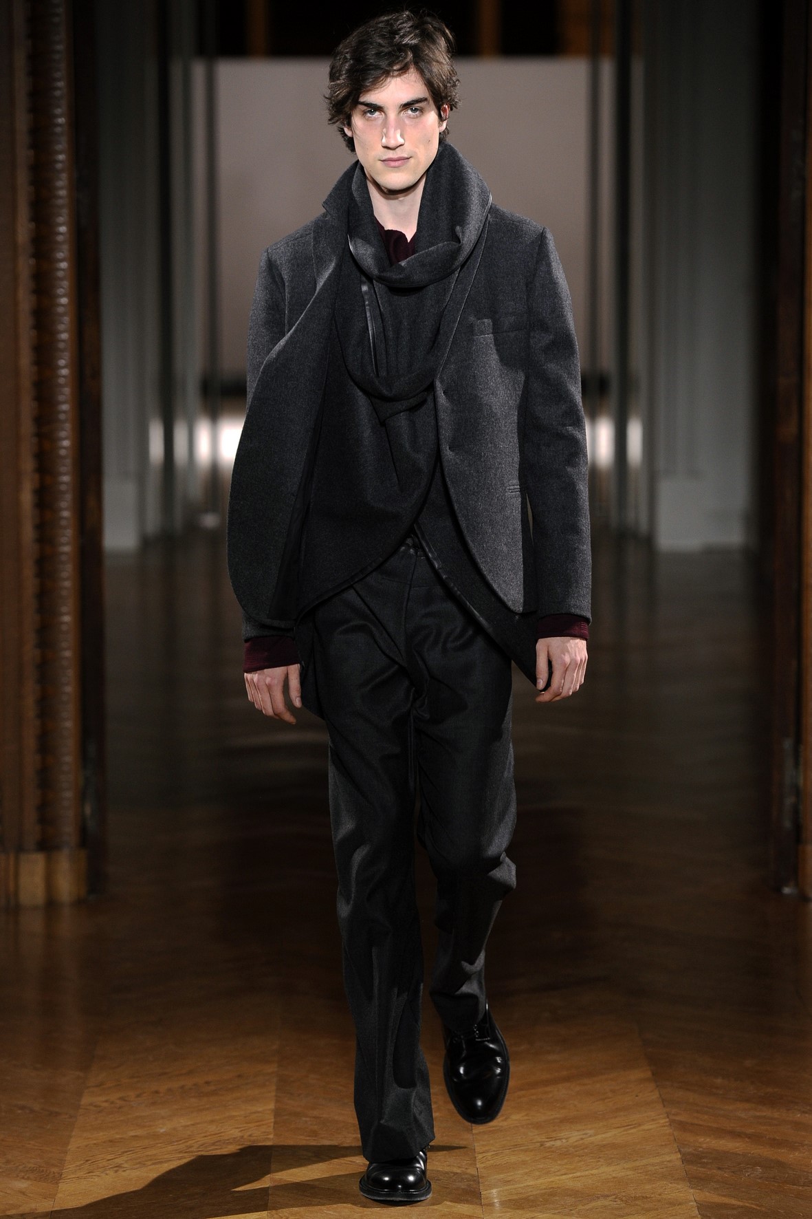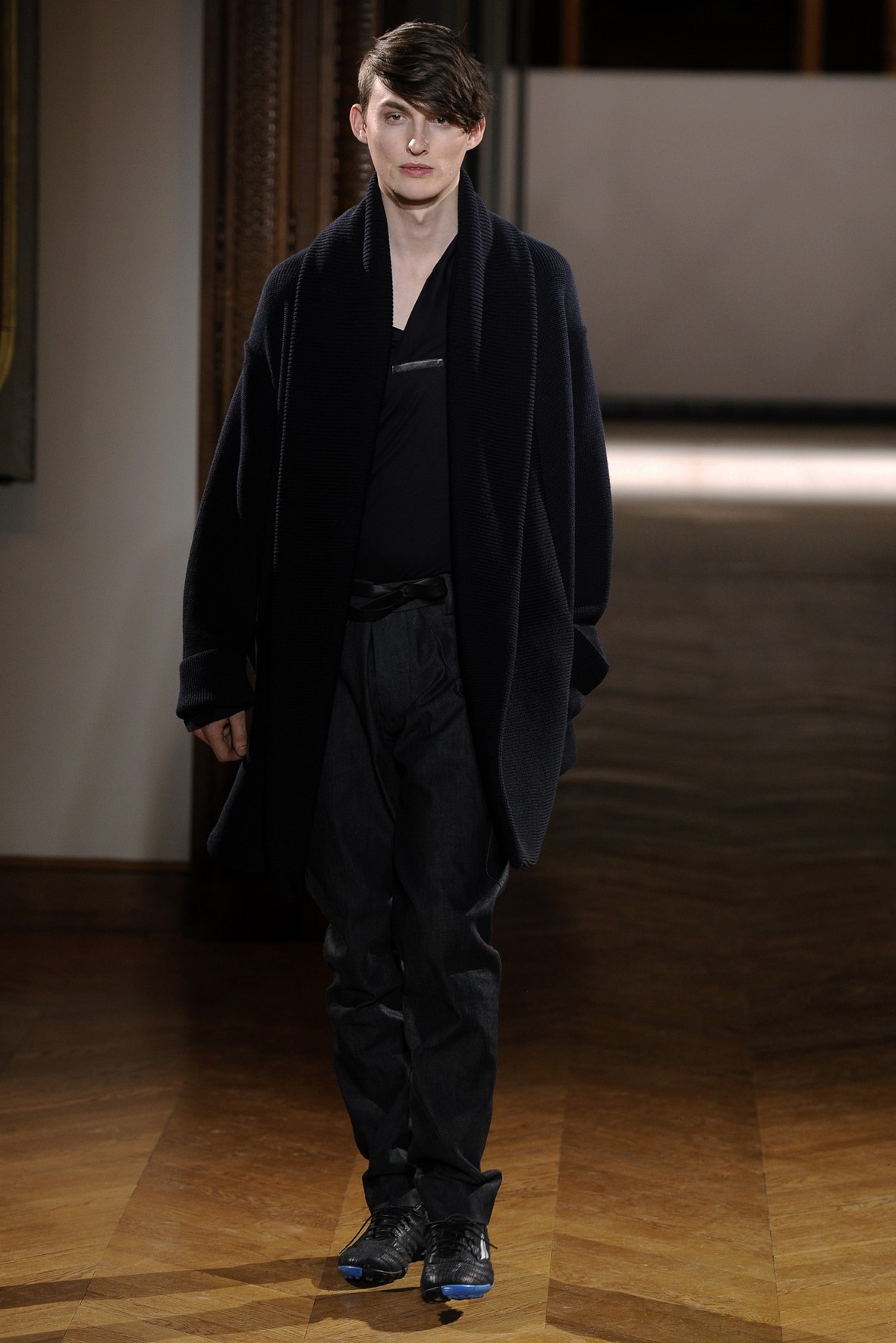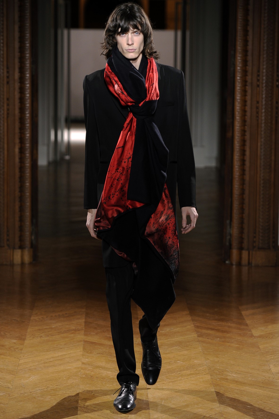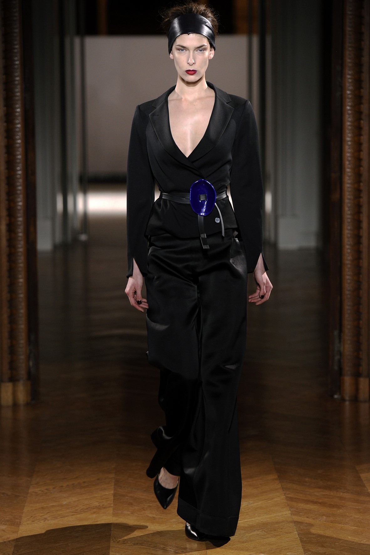 Une collection très ondoyante constituée de formes enveloppantes et souples: les manteaux se portent avec nonchalance, comme des peignoirs, les longues robes-fourreau très largement fendues comme des déshabillés de soie, les larges kimonos du soir se portent ouverts, les pantalons immenses, fluides…