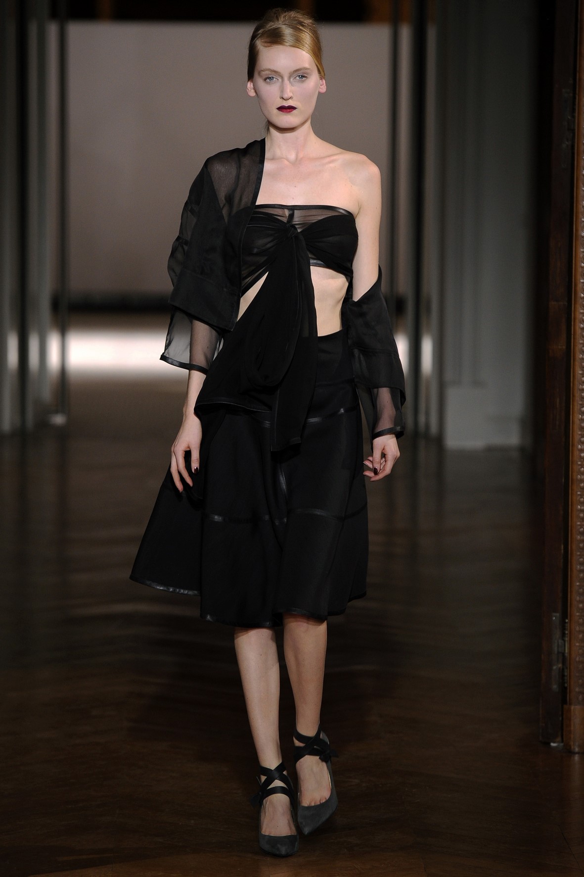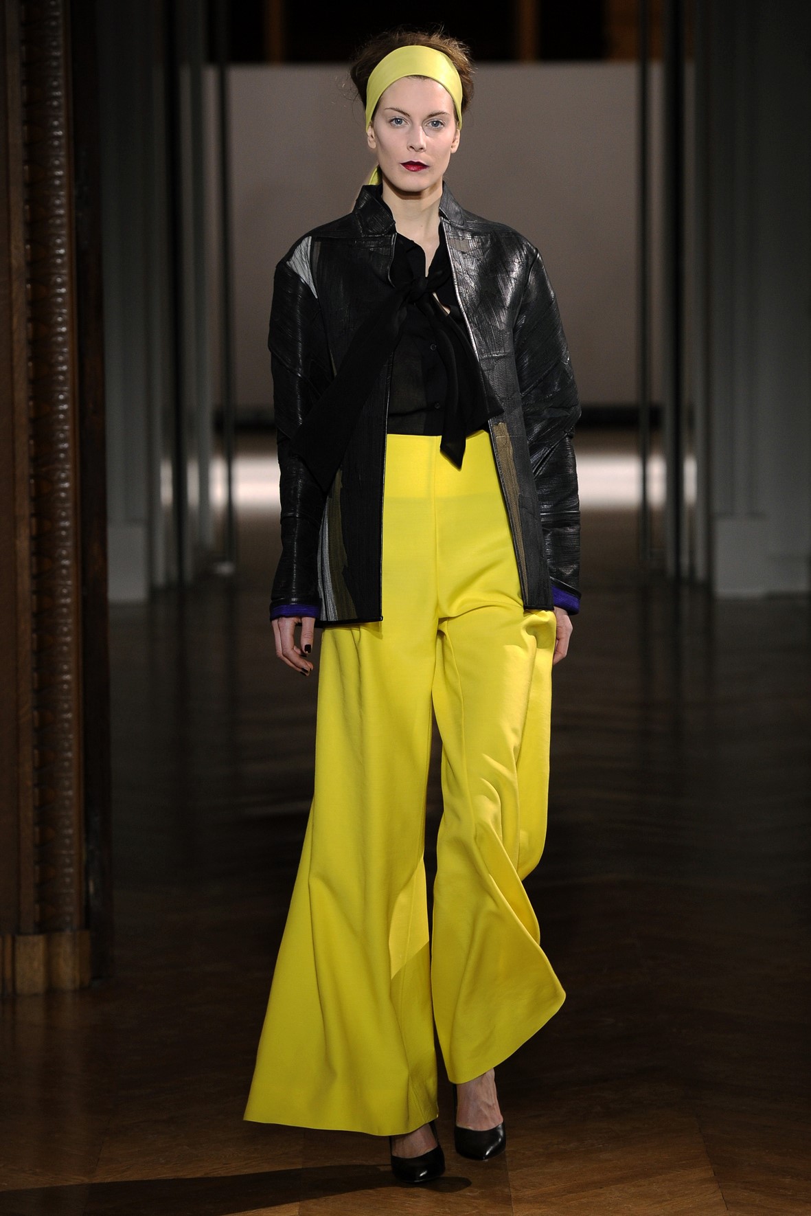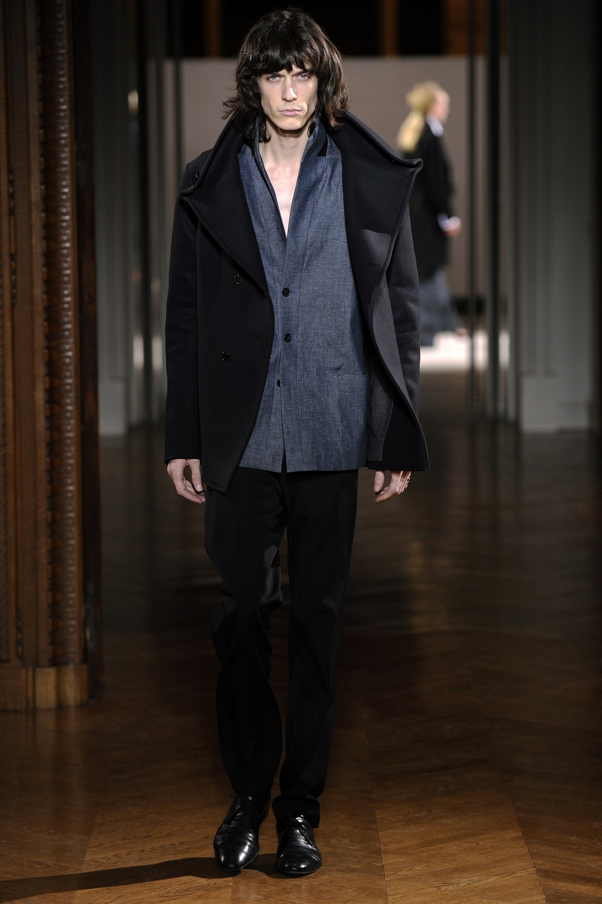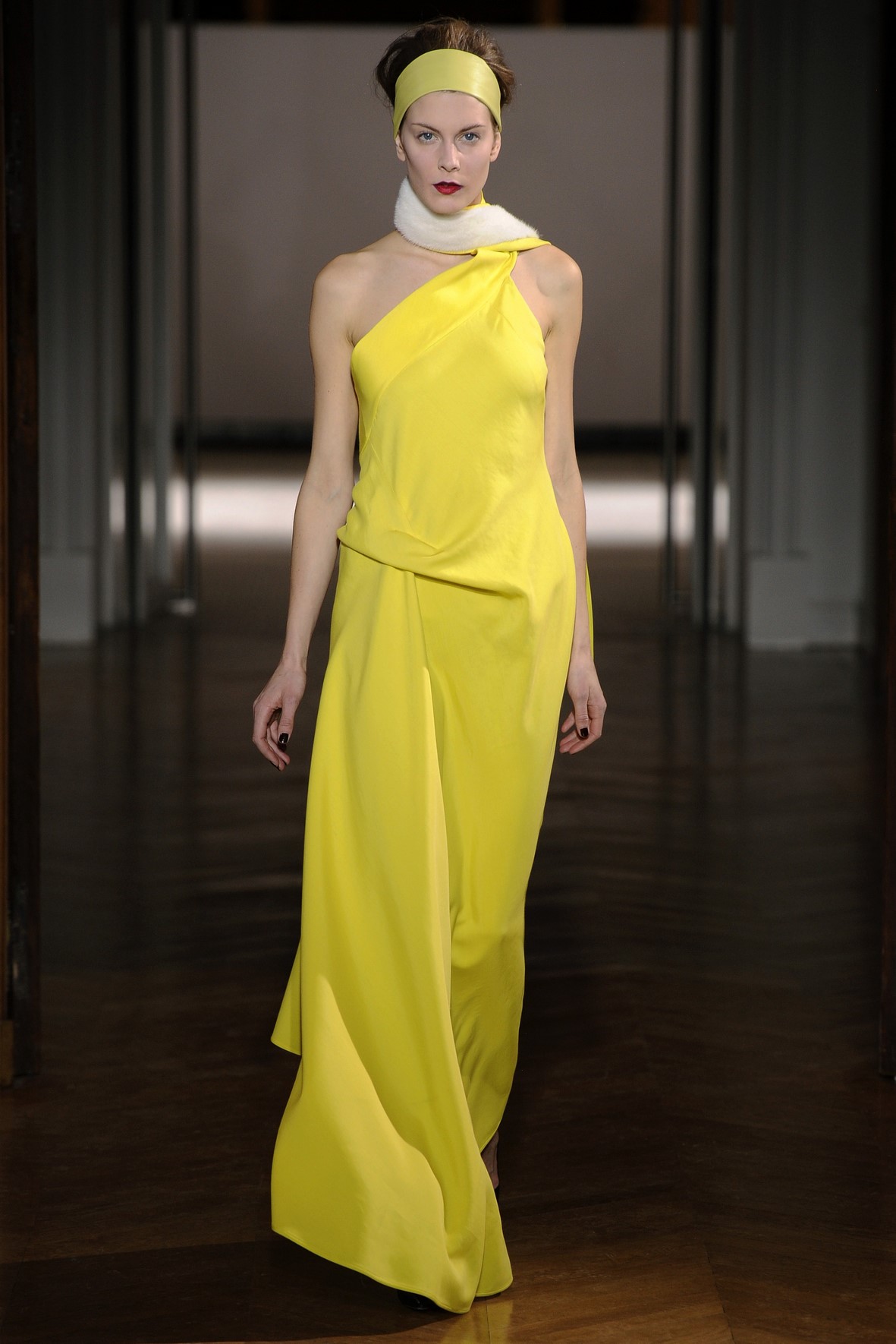 Une collection très ondoyante constituée de formes enveloppantes et souples: les manteaux se portent avec nonchalance, comme des peignoirs, les longues robes-fourreau très largement fendues comme des déshabillés de soie, les larges kimonos du soir se portent ouverts, les pantalons immenses, fluides…