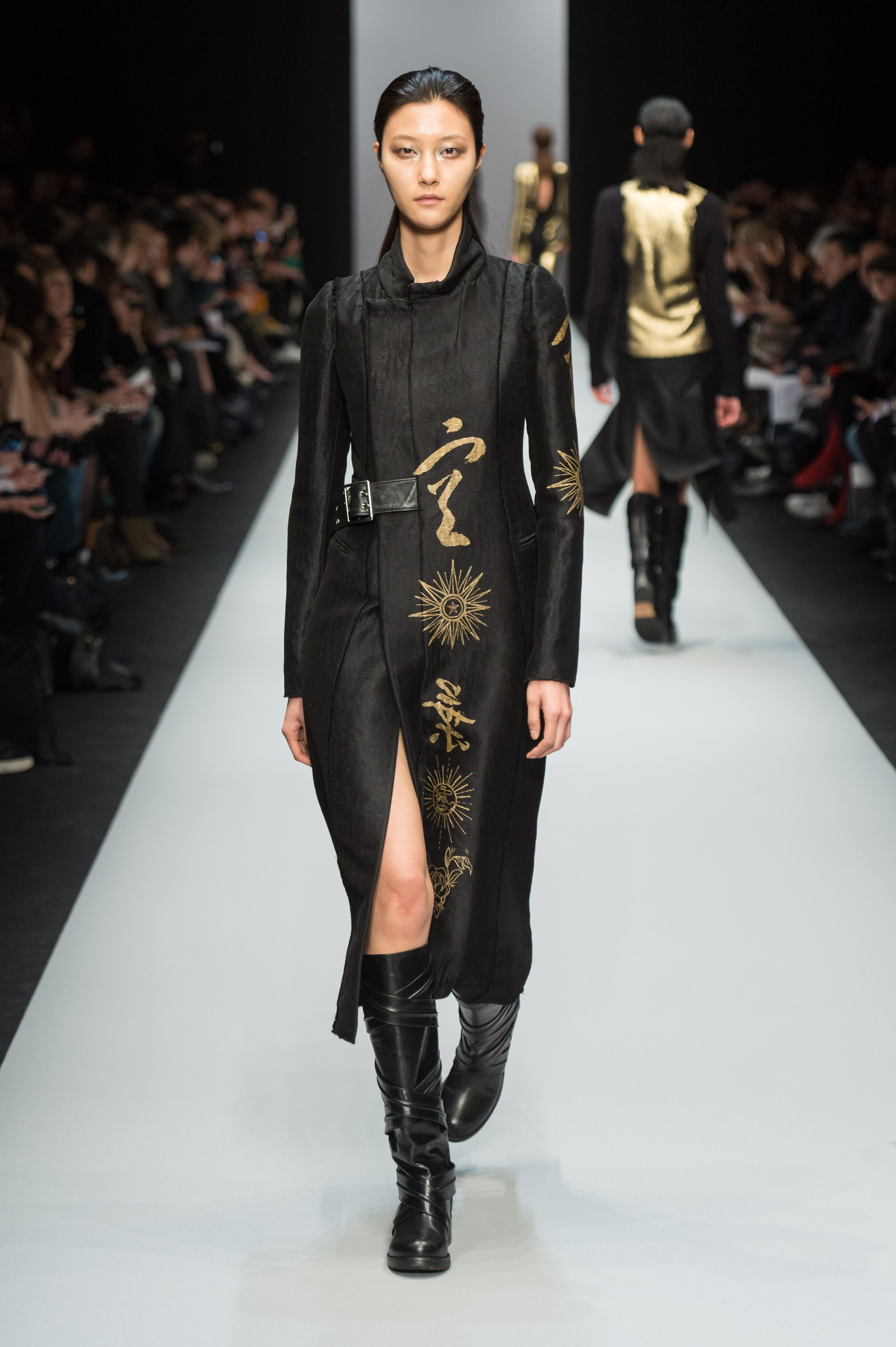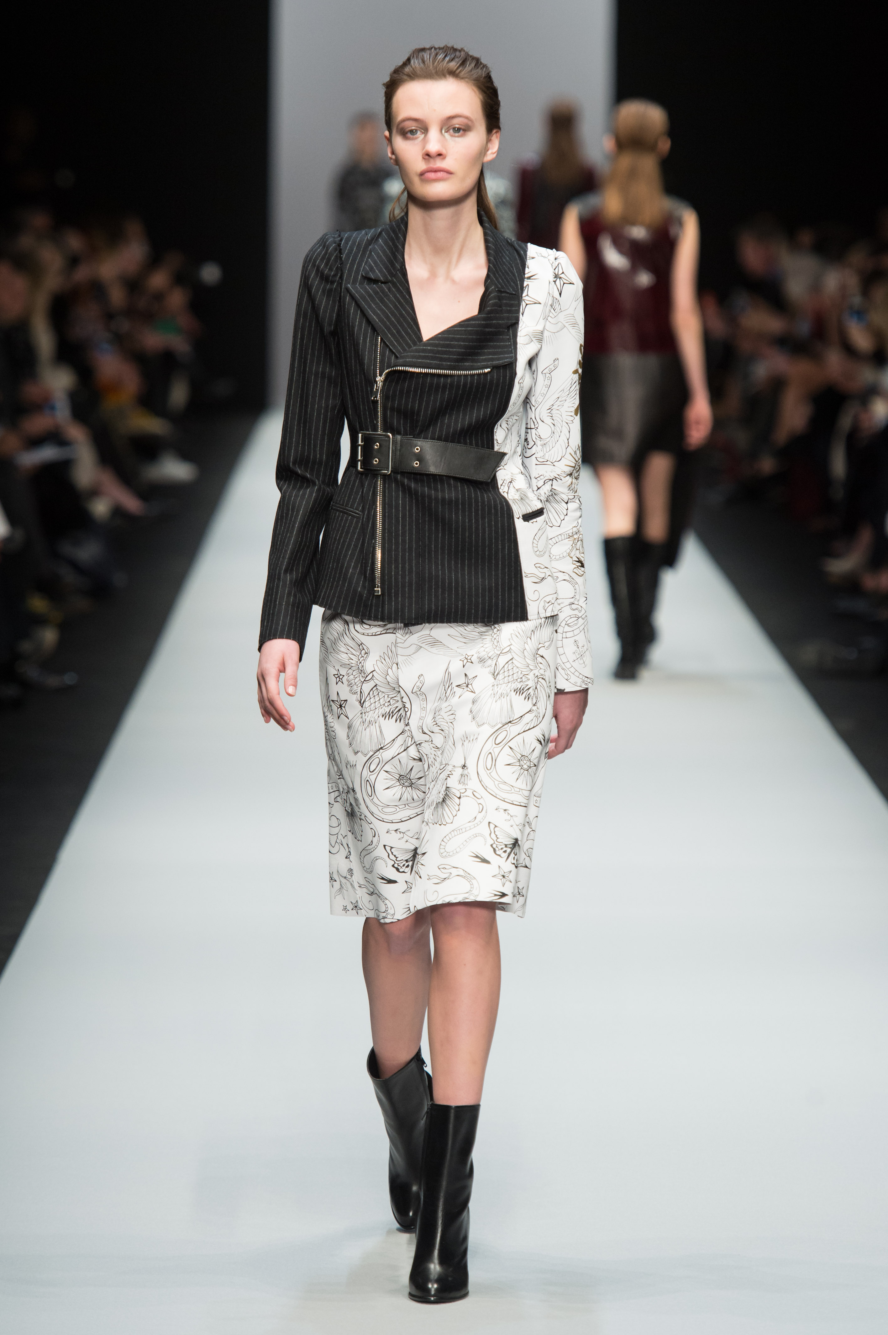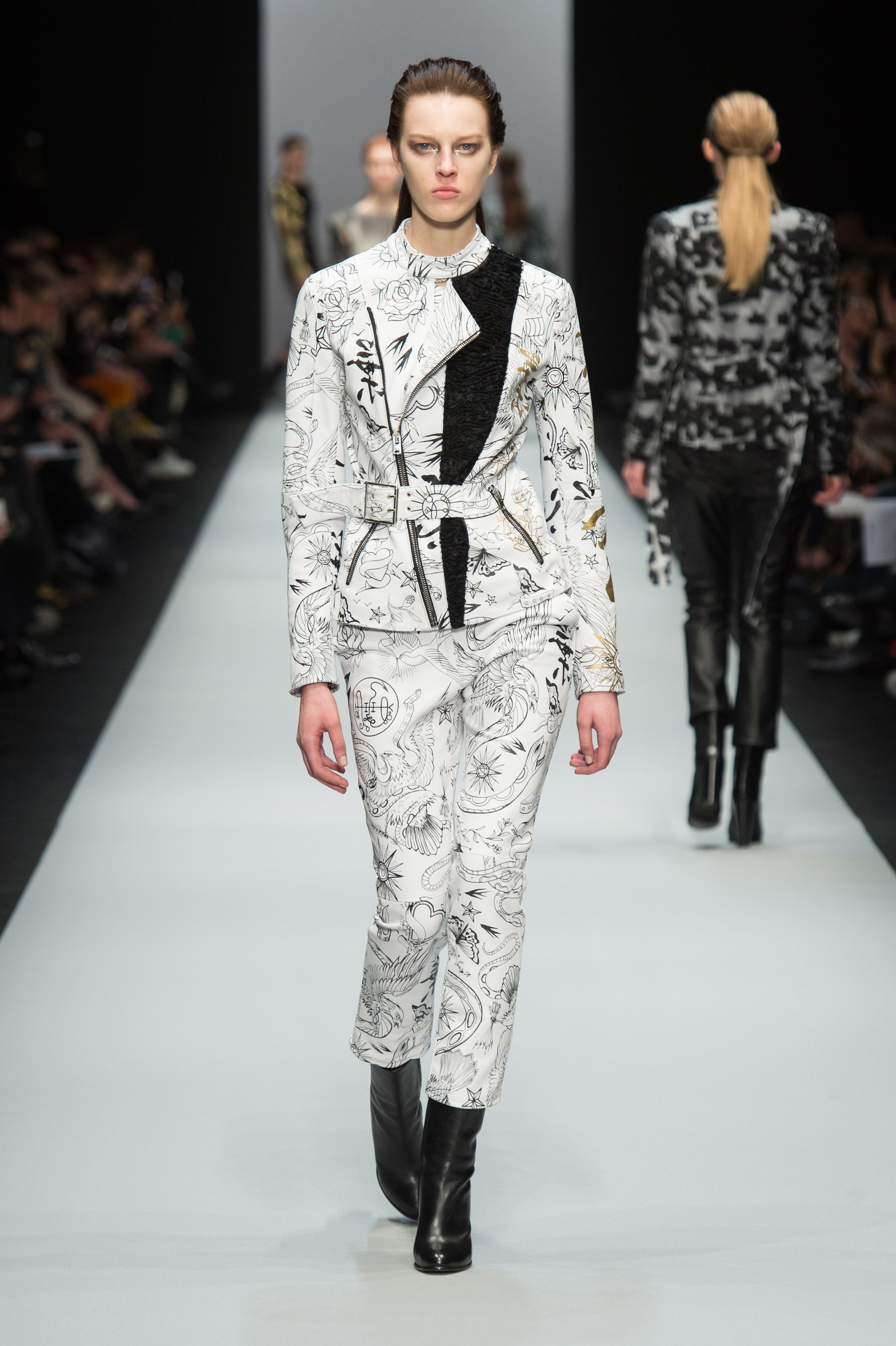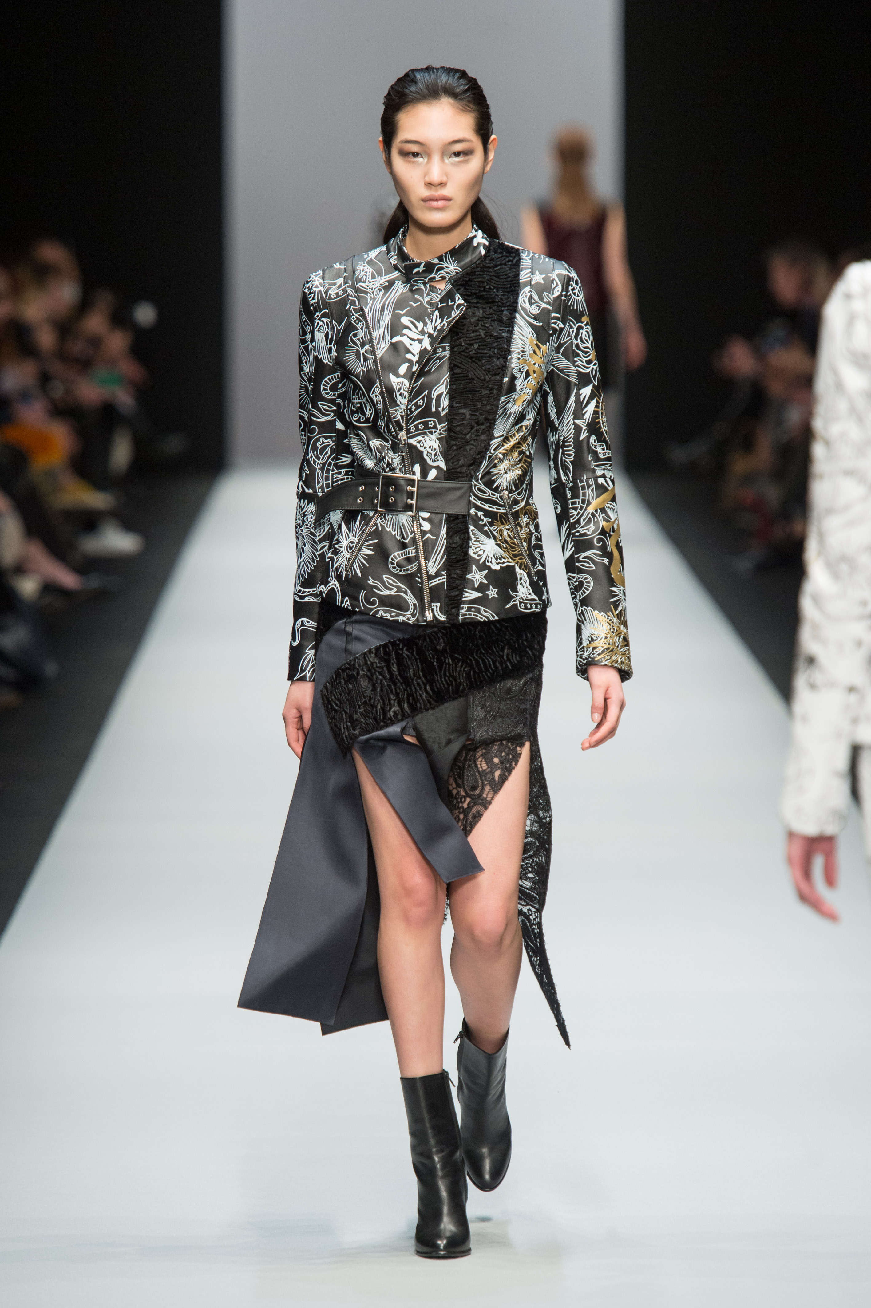La collection tente également d’allier les classiques androgynes et silhouettes voluptueuses : des vestes imprimées dites Biker, et des trenchcoats déconstruits sont contrastés de pièces de mailles cintrées portées à même peau, ou de jupes en brocart dévorées. Une partie de la collection est même inspirée du film de Peter Greenaway : « The Pillow Book », un drame prenant place au Japon, qui dépeint la vie tumultueuse de la fille d’un calligraphe.