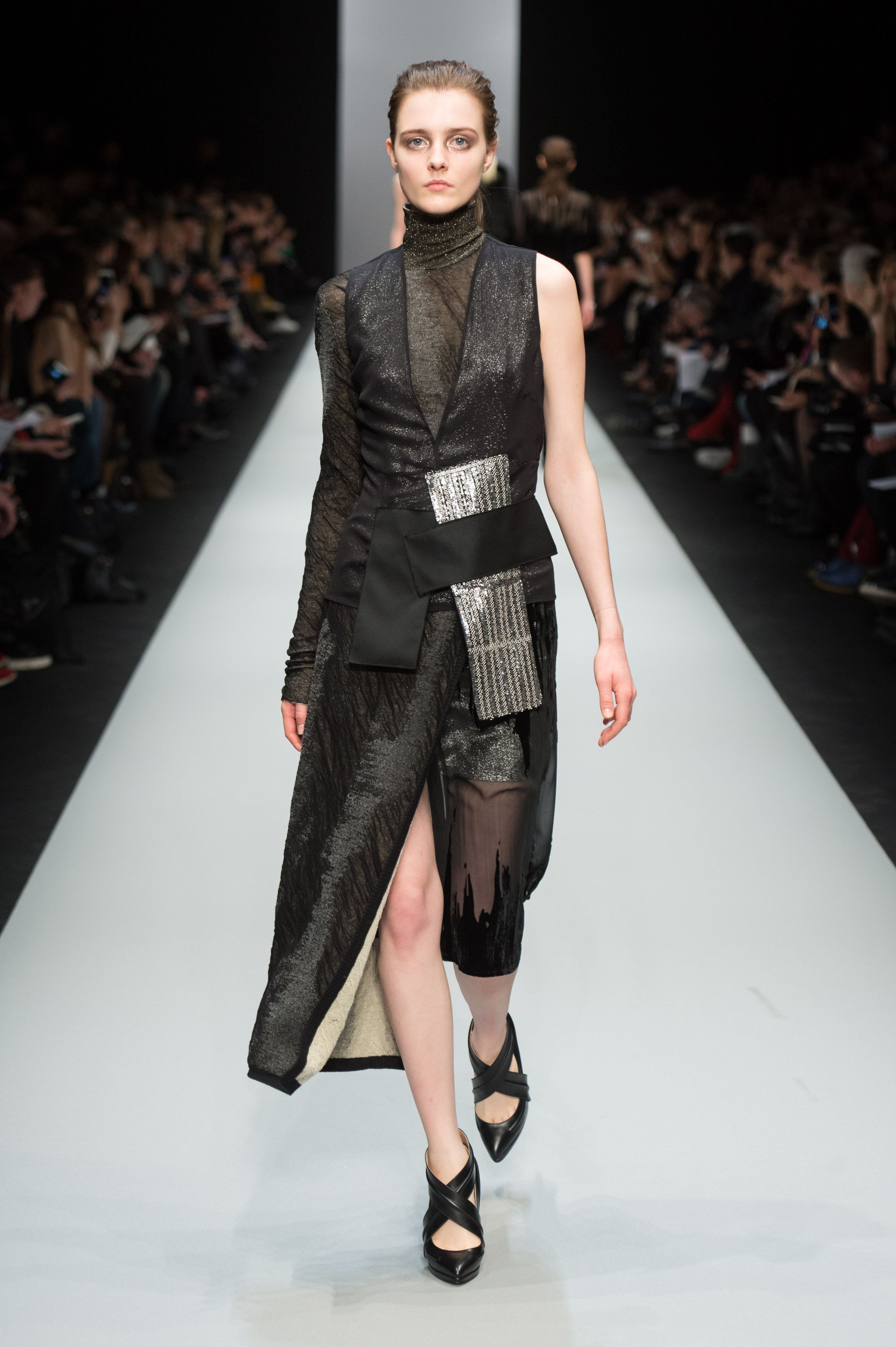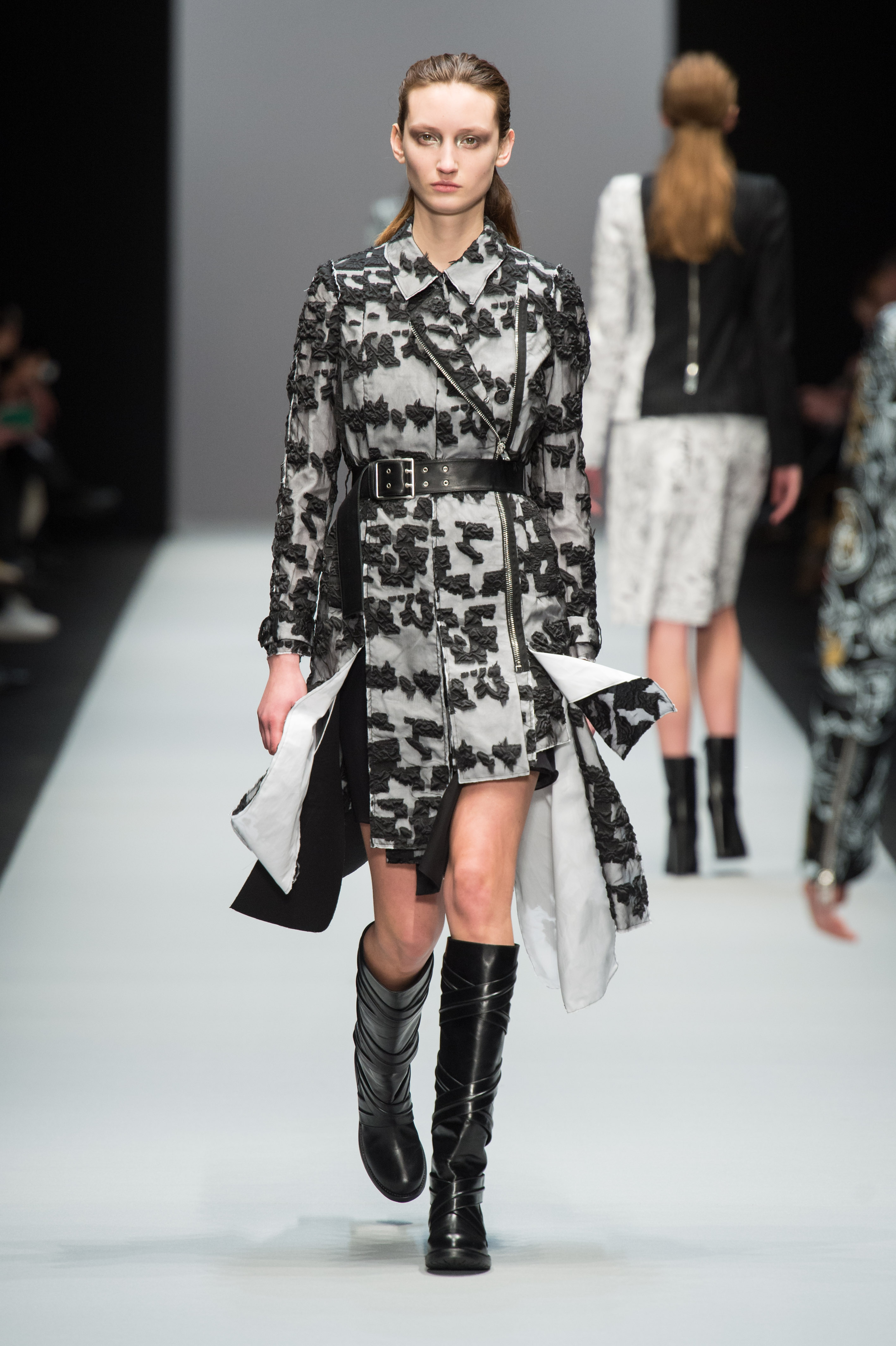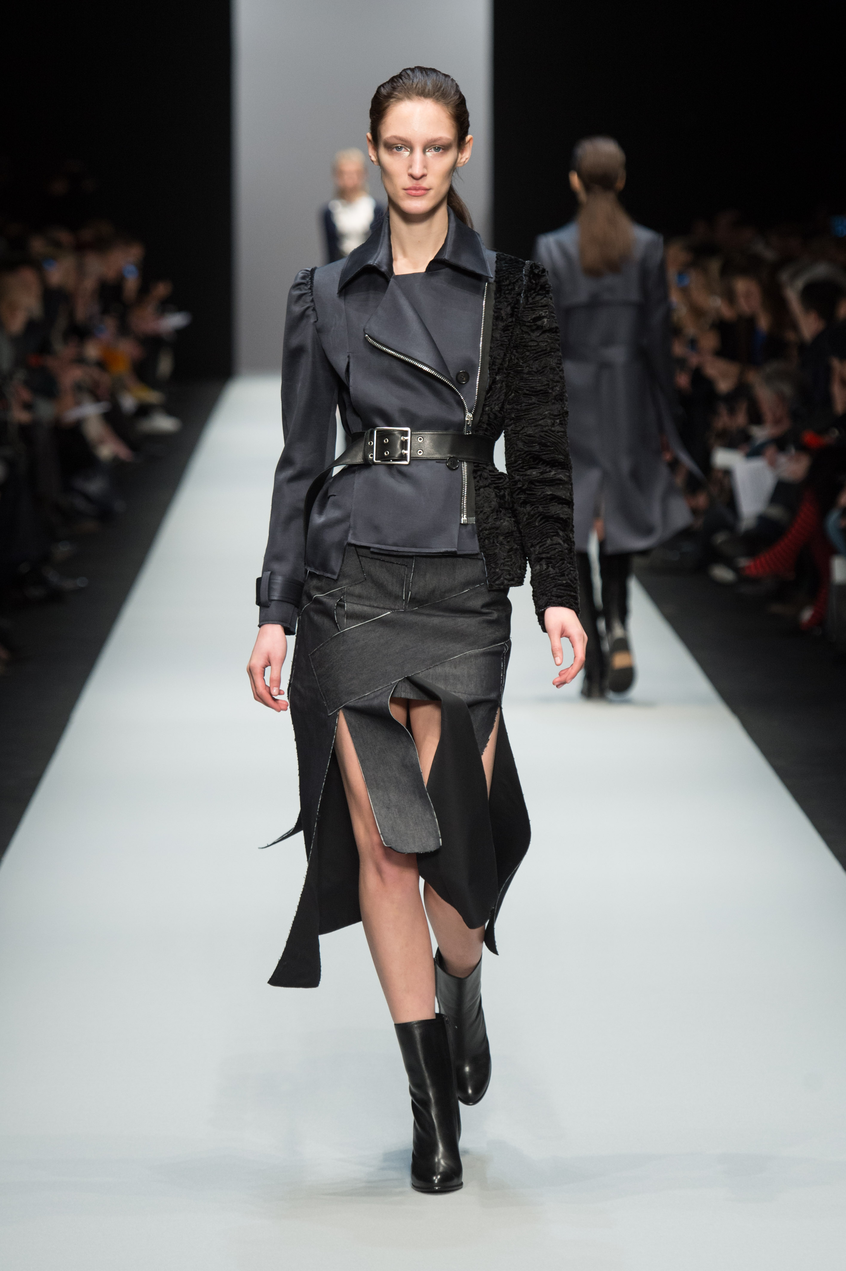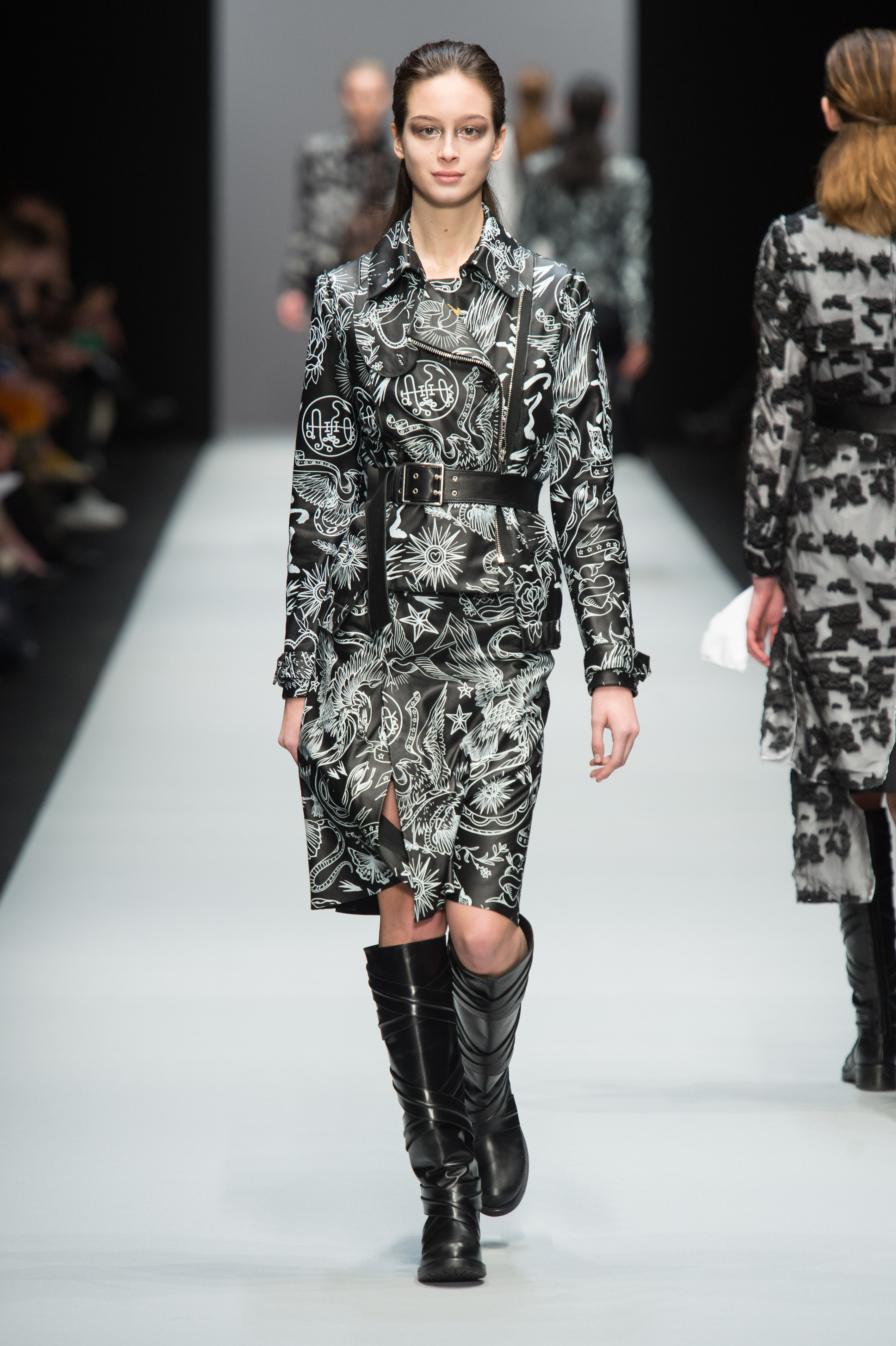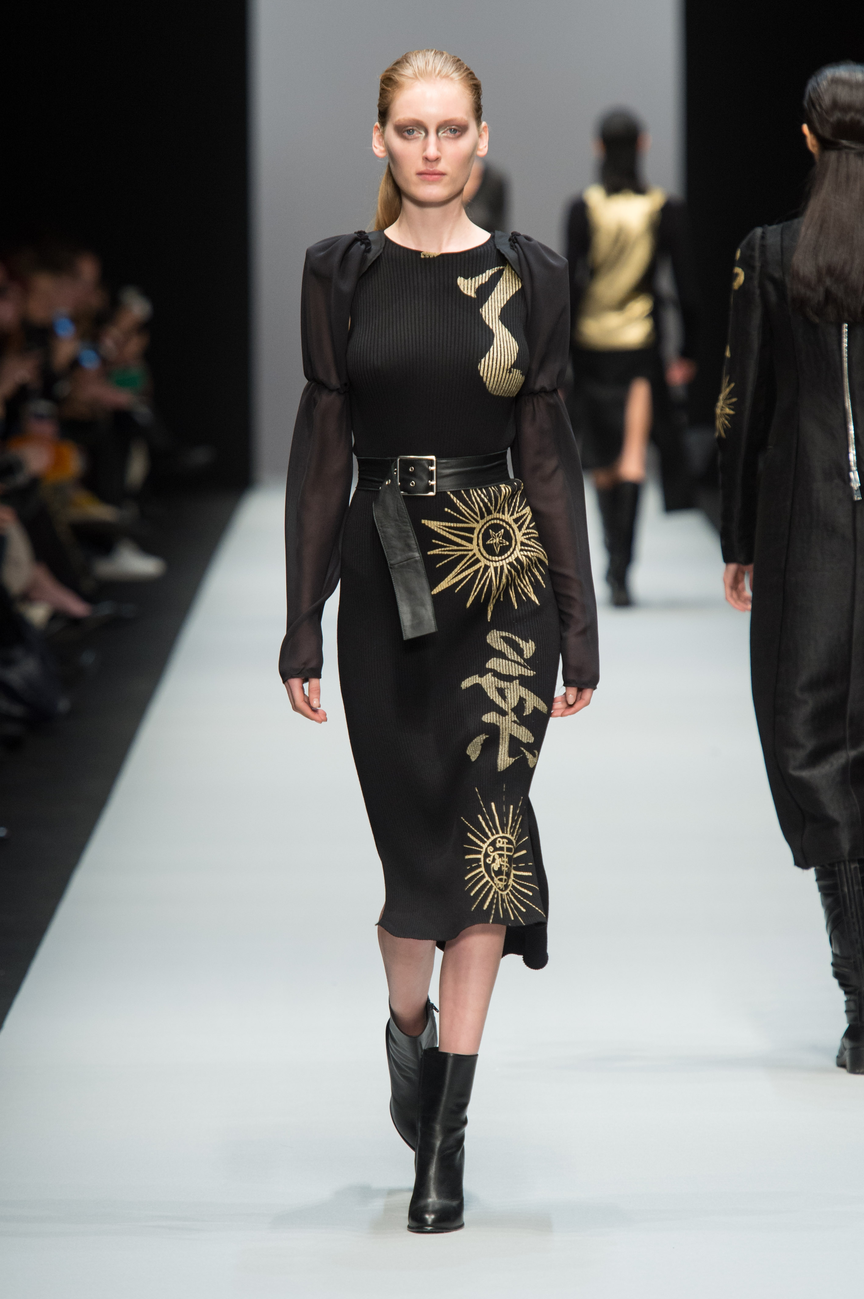 La collection tente également d’allier les classiques androgynes et silhouettes voluptueuses : des vestes imprimées dites Biker, et des trenchcoats déconstruits sont contrastés de pièces de mailles cintrées portées à même peau, ou de jupes en brocart dévorées. Une partie de la collection est même inspirée du film de Peter Greenaway : « The Pillow Book », un drame prenant place au Japon, qui dépeint la vie tumultueuse de la fille d’un calligraphe.