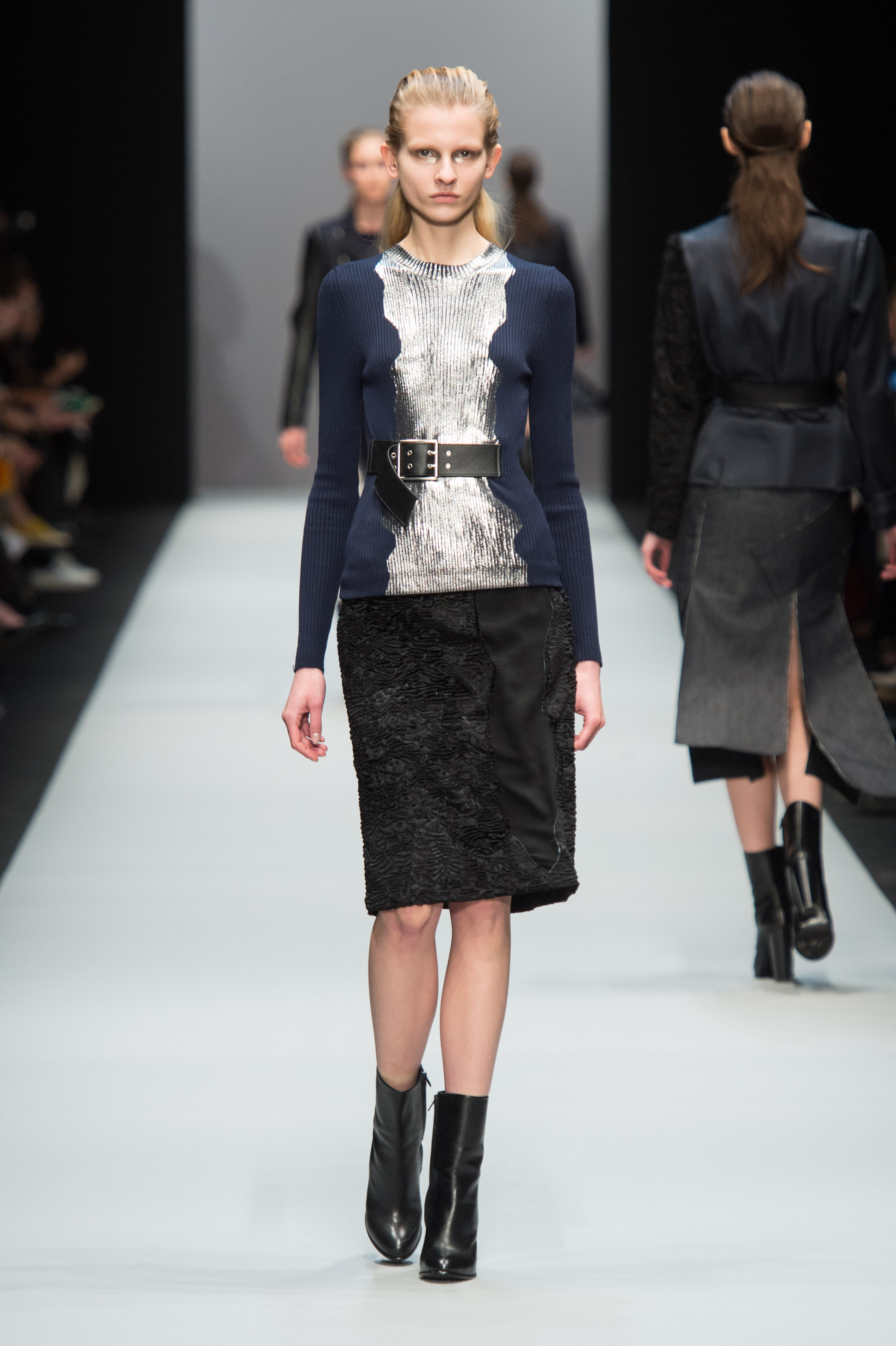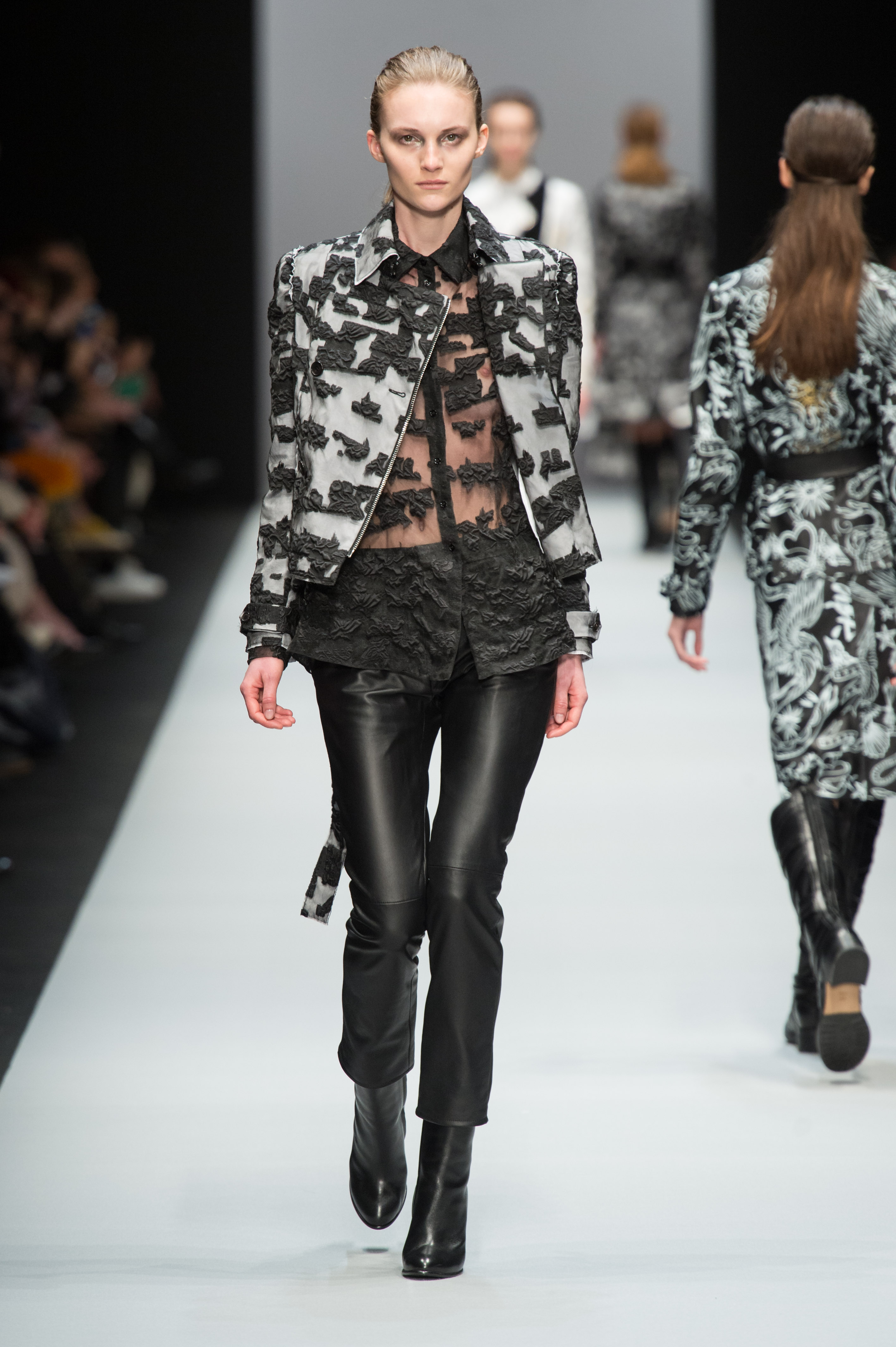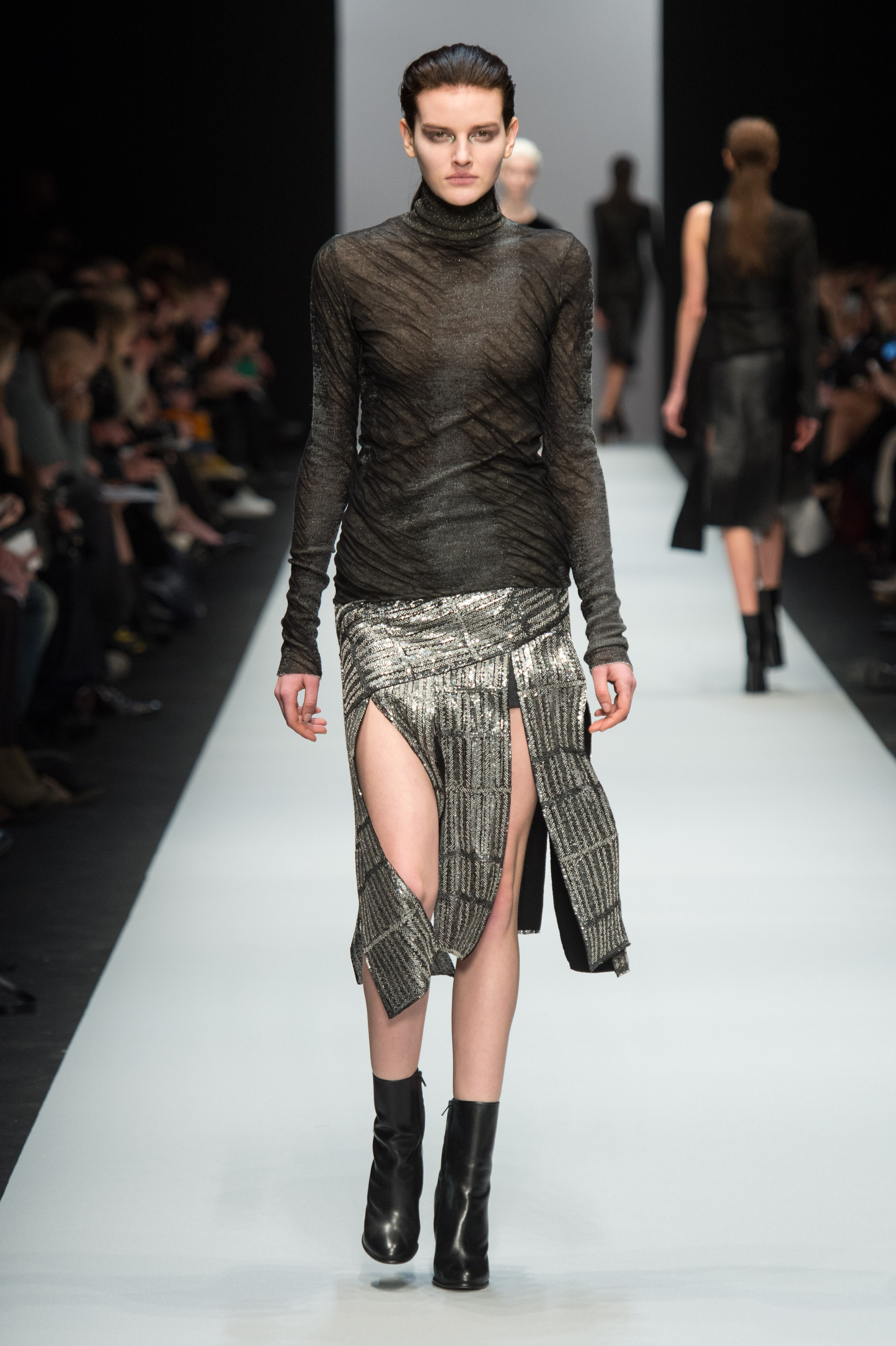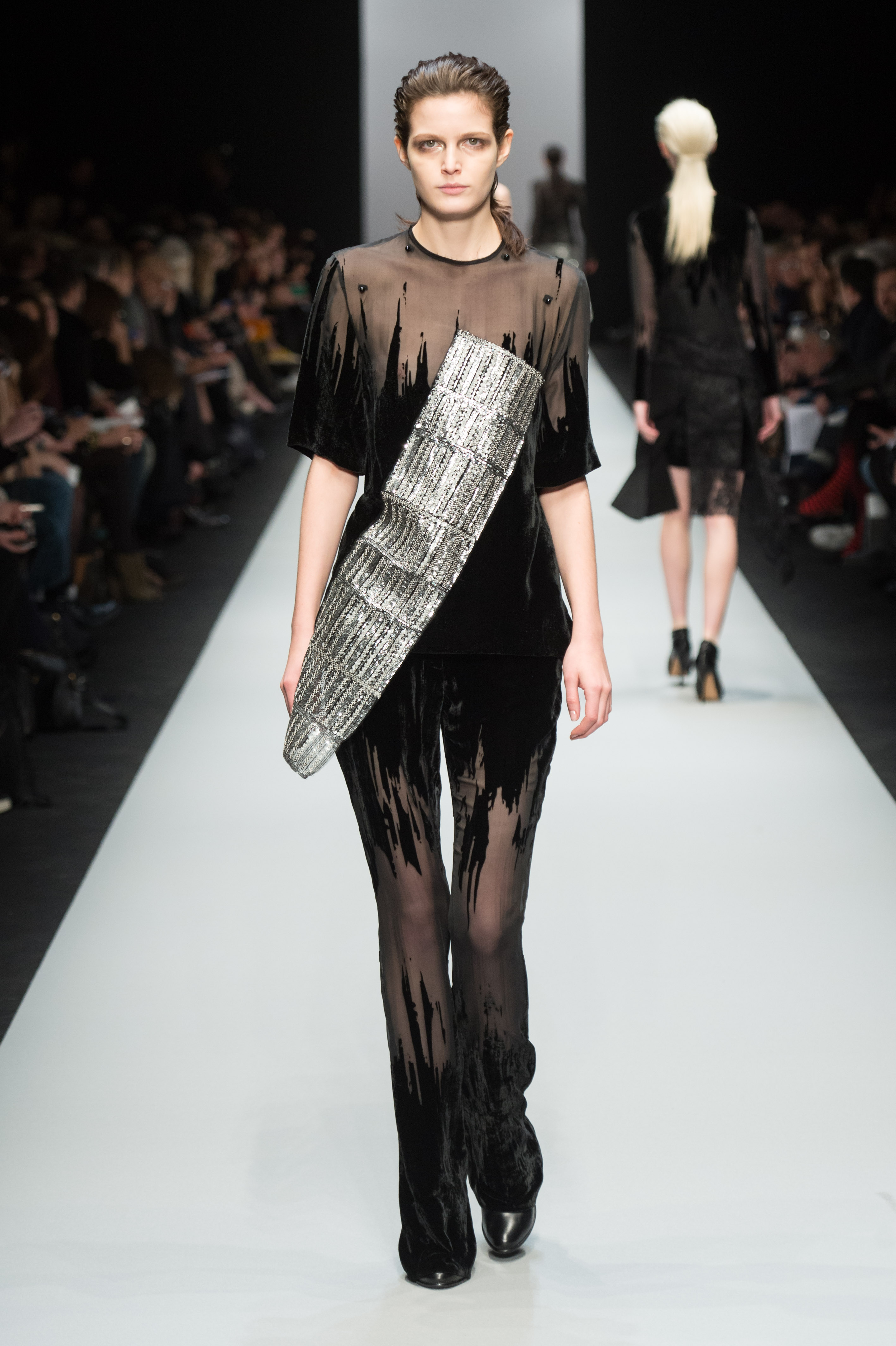 La collection tente également d’allier les classiques androgynes et silhouettes voluptueuses : des vestes imprimées dites Biker, et des trenchcoats déconstruits sont contrastés de pièces de mailles cintrées portées à même peau, ou de jupes en brocart dévorées. Une partie de la collection est même inspirée du film de Peter Greenaway : « The Pillow Book », un drame prenant place au Japon, qui dépeint la vie tumultueuse de la fille d’un calligraphe.