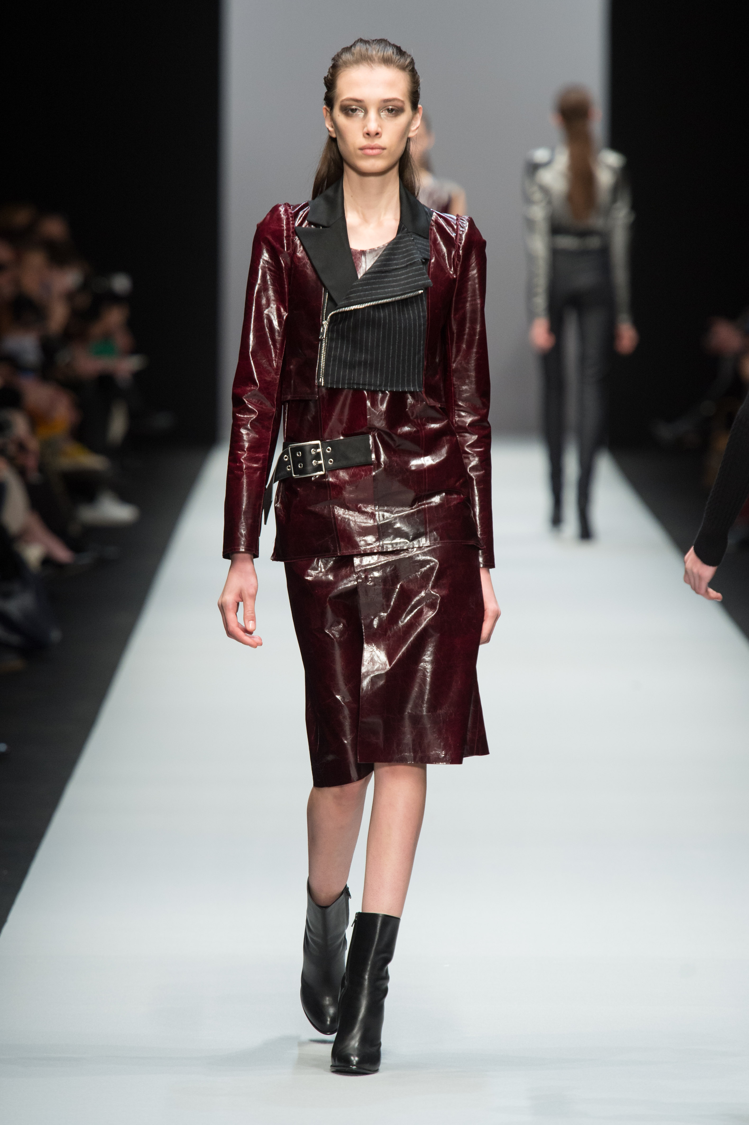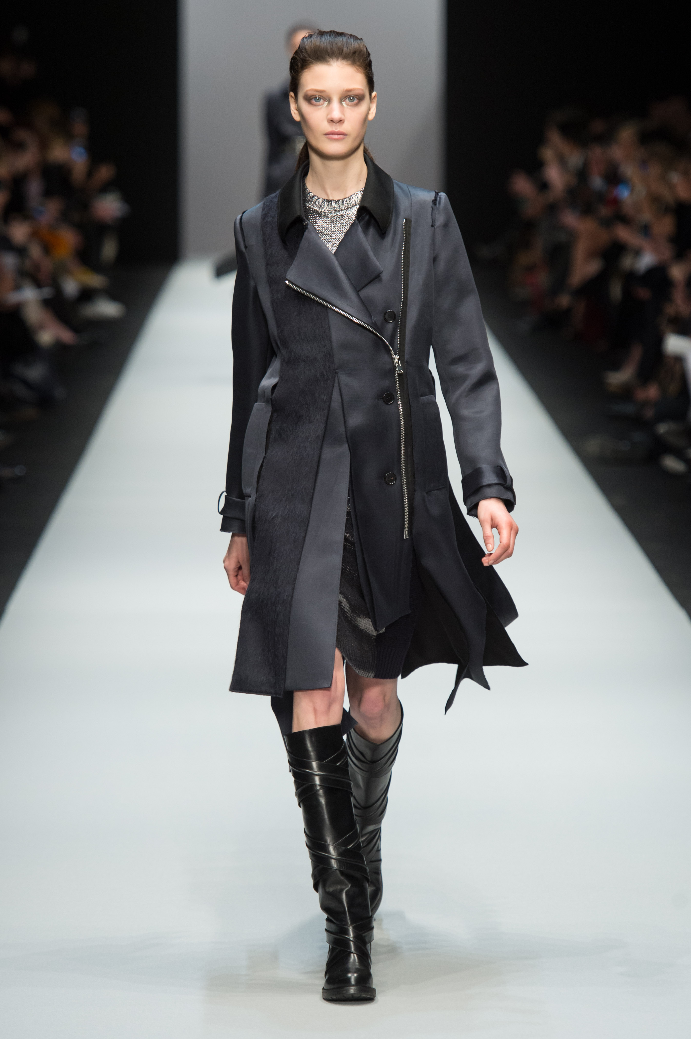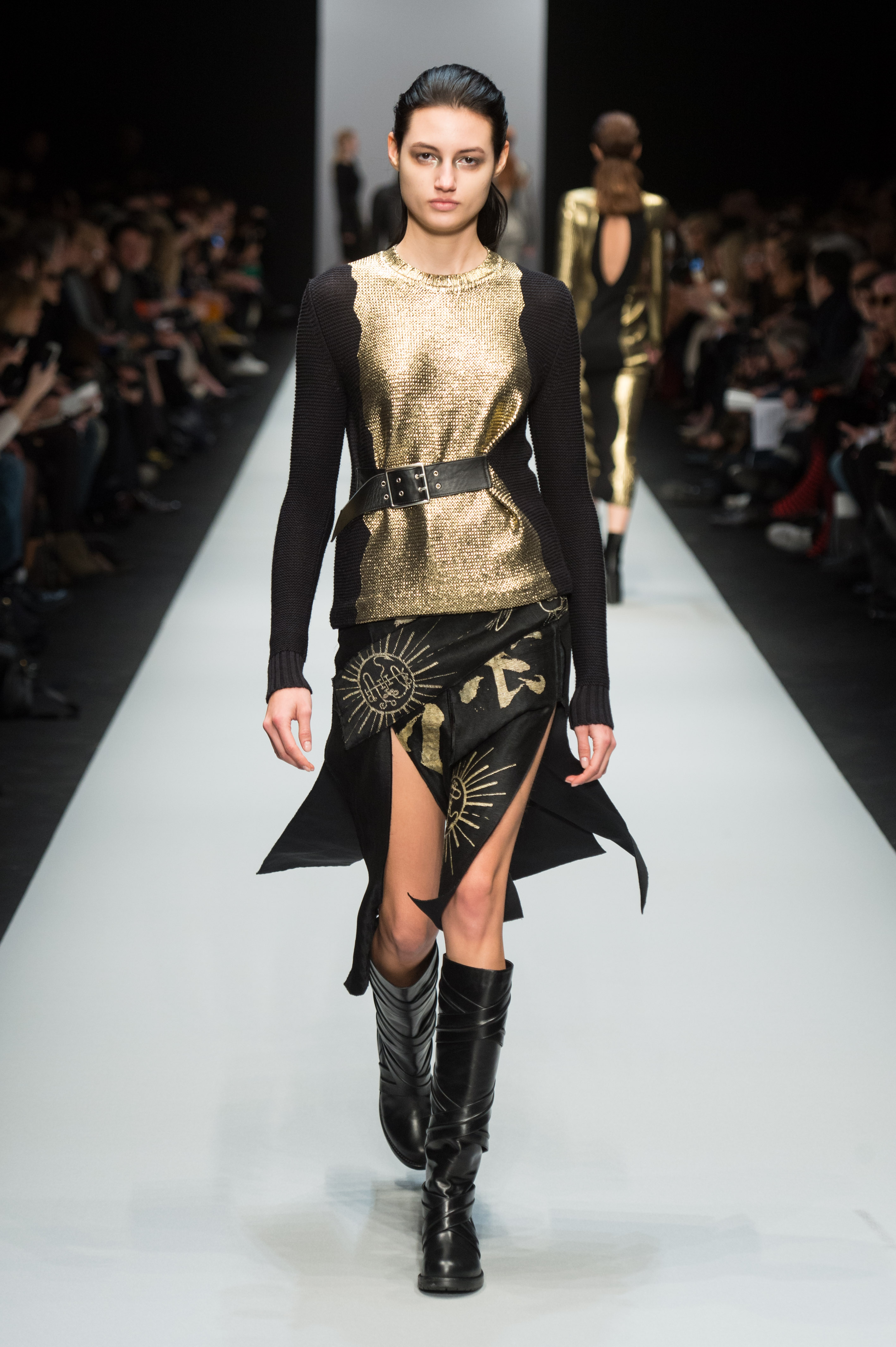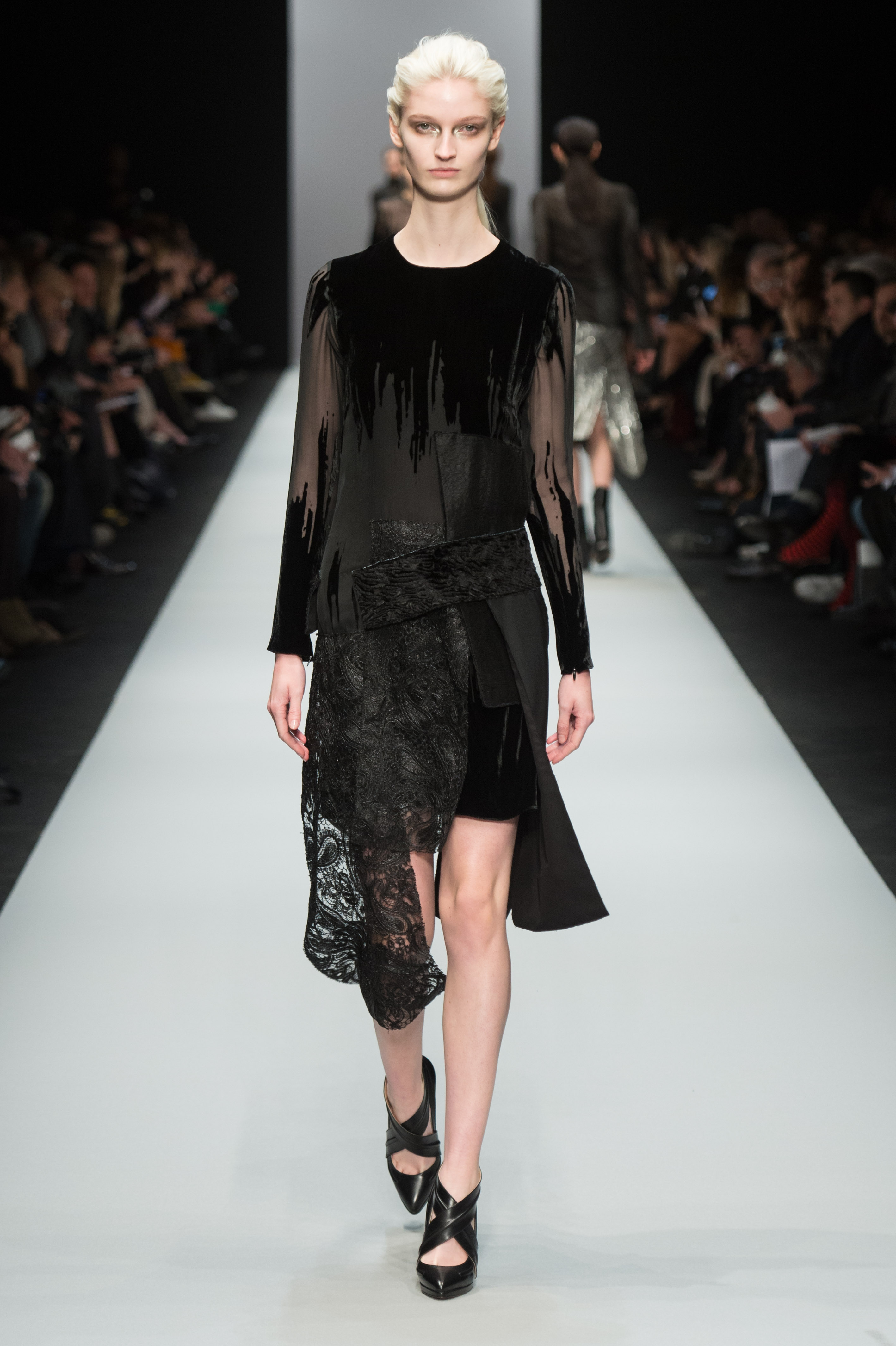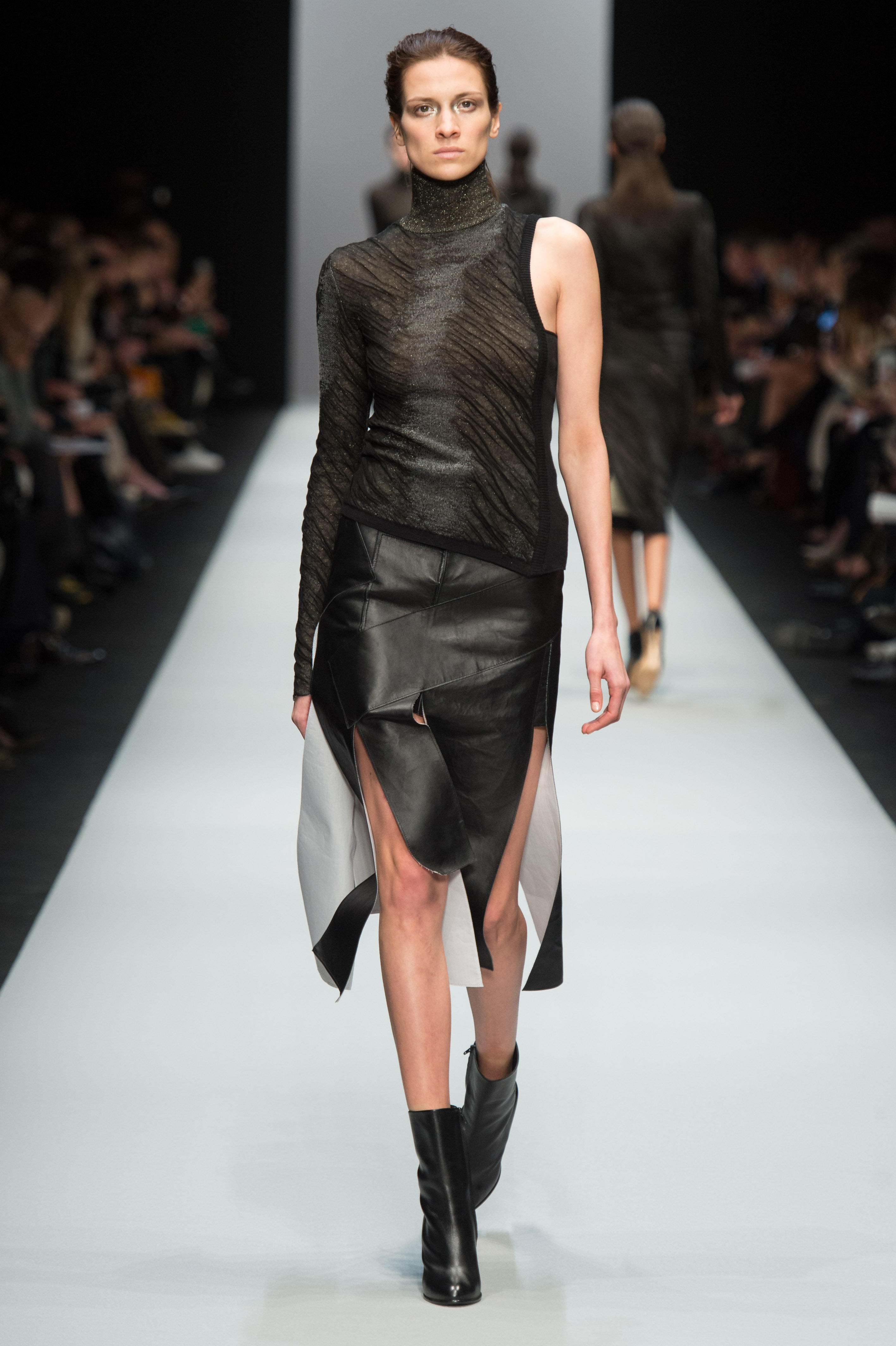 La collection tente également d’allier les classiques androgynes et silhouettes voluptueuses : des vestes imprimées dites Biker, et des trenchcoats déconstruits sont contrastés de pièces de mailles cintrées portées à même peau, ou de jupes en brocart dévorées. Une partie de la collection est même inspirée du film de Peter Greenaway : « The Pillow Book », un drame prenant place au Japon, qui dépeint la vie tumultueuse de la fille d’un calligraphe.